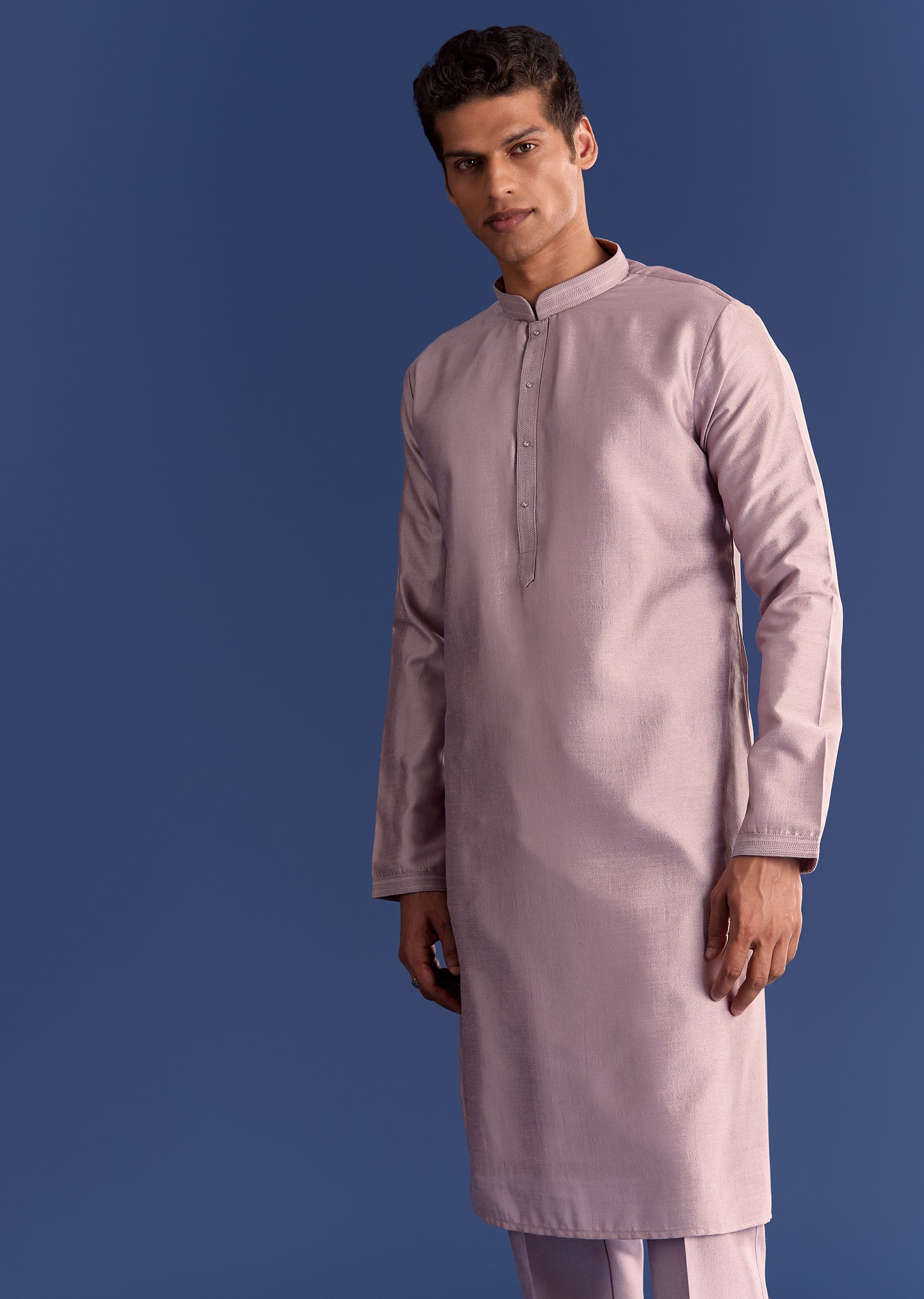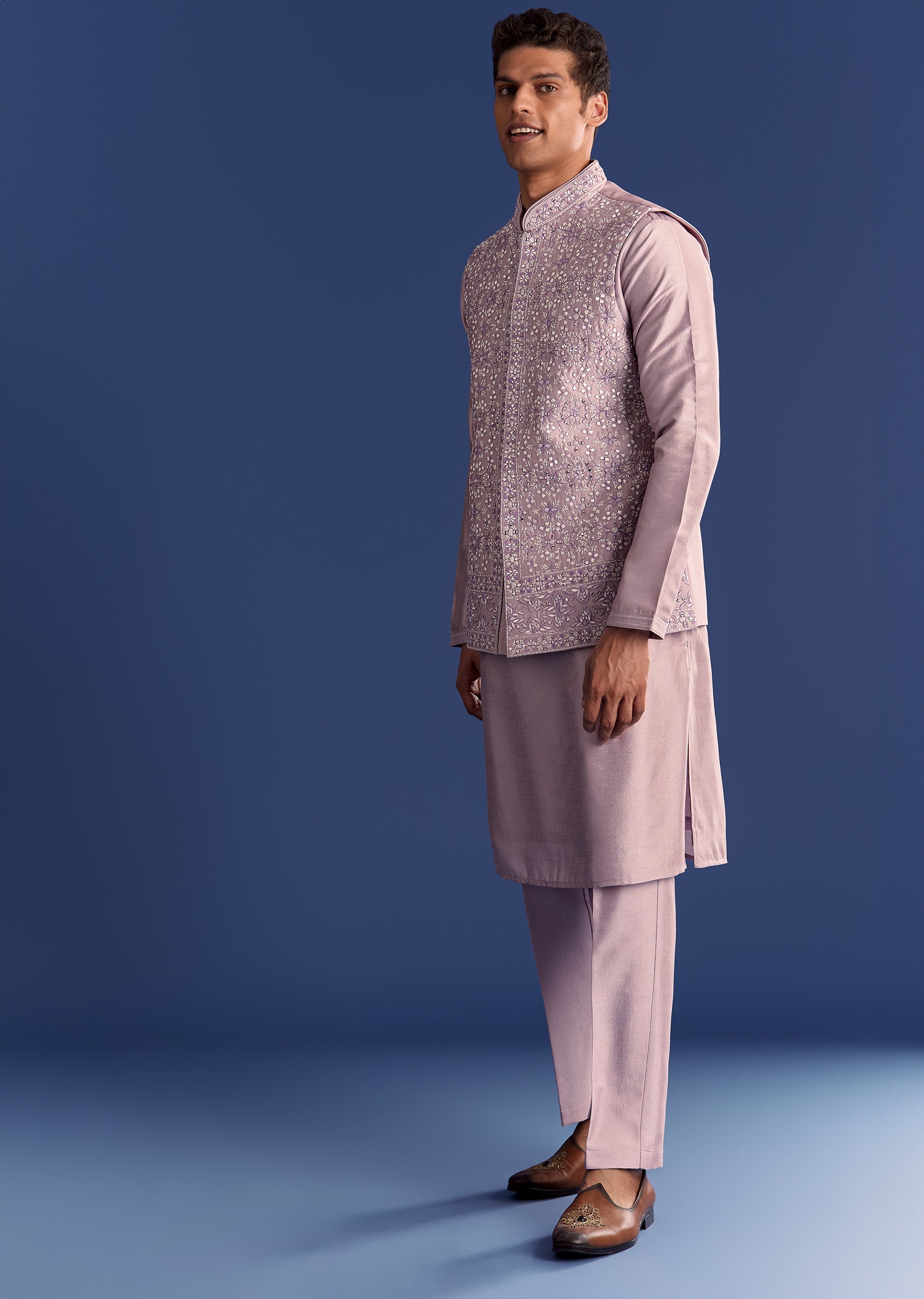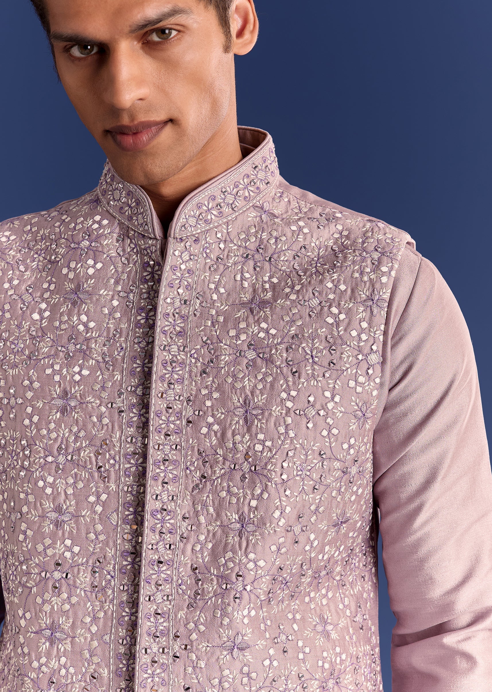 The lilac cotton silk kurta paired with a mirror-threadwork jacket introduces depth...