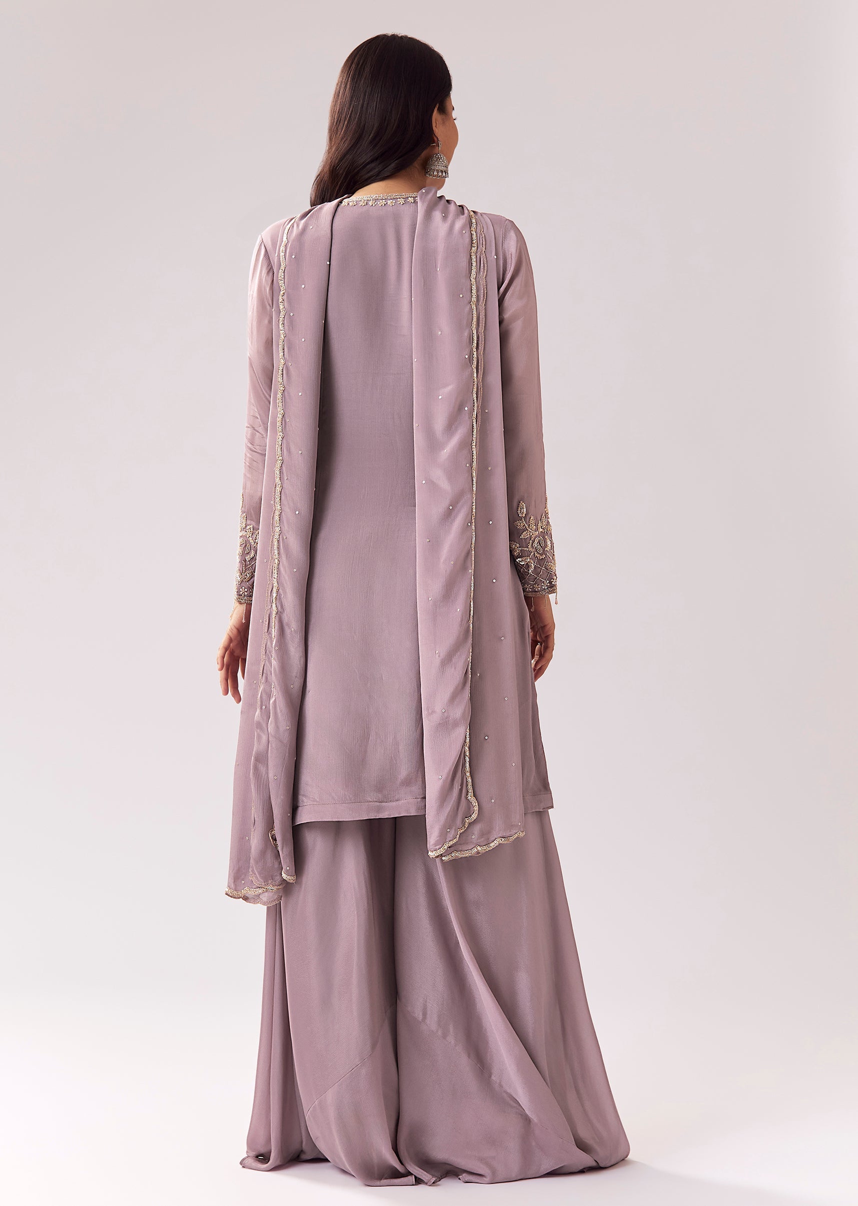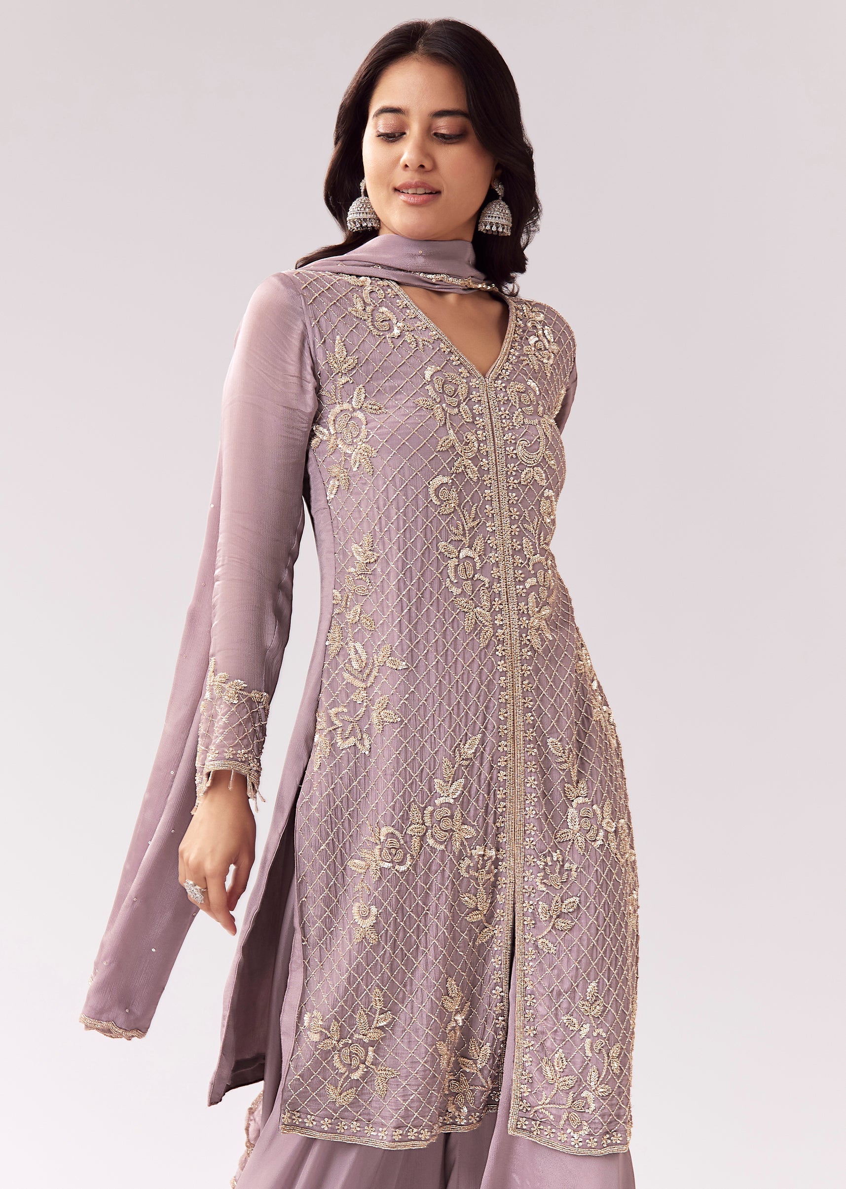 Lavender Harmony Edit – Embellished Palazzo Suit For Her And Lilac Mirror-Work Jacket Kurta Set For Him