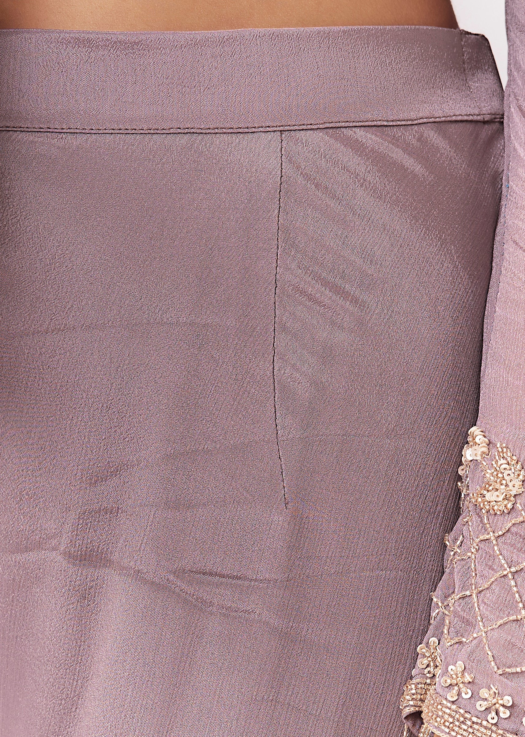 The embellished lavender palazzo suit balances shimmer and sophistication with a beautifully flowing structure.