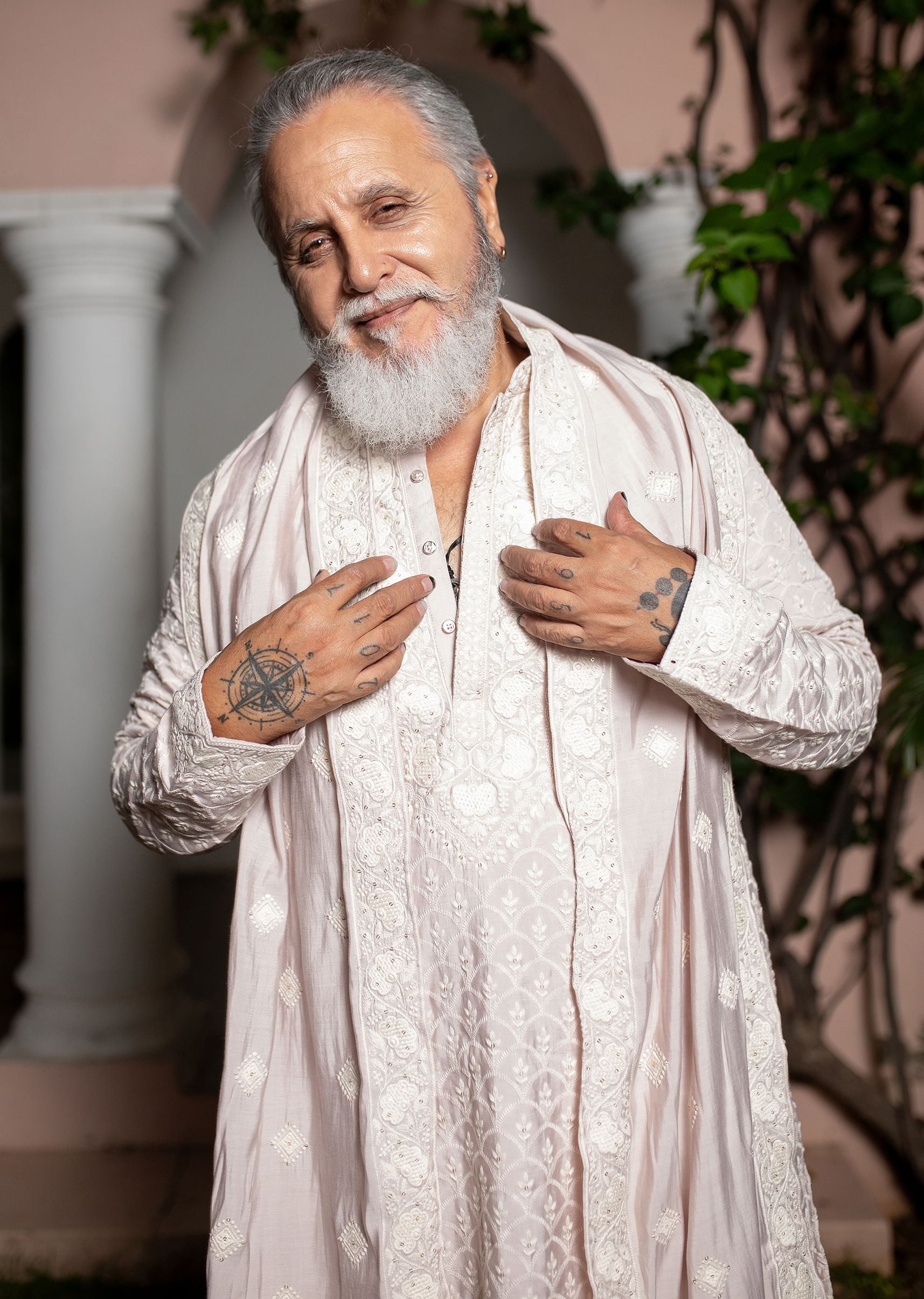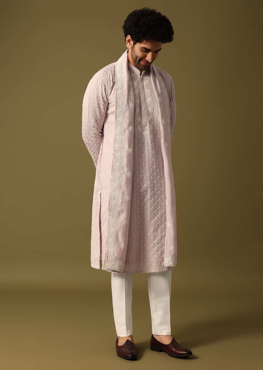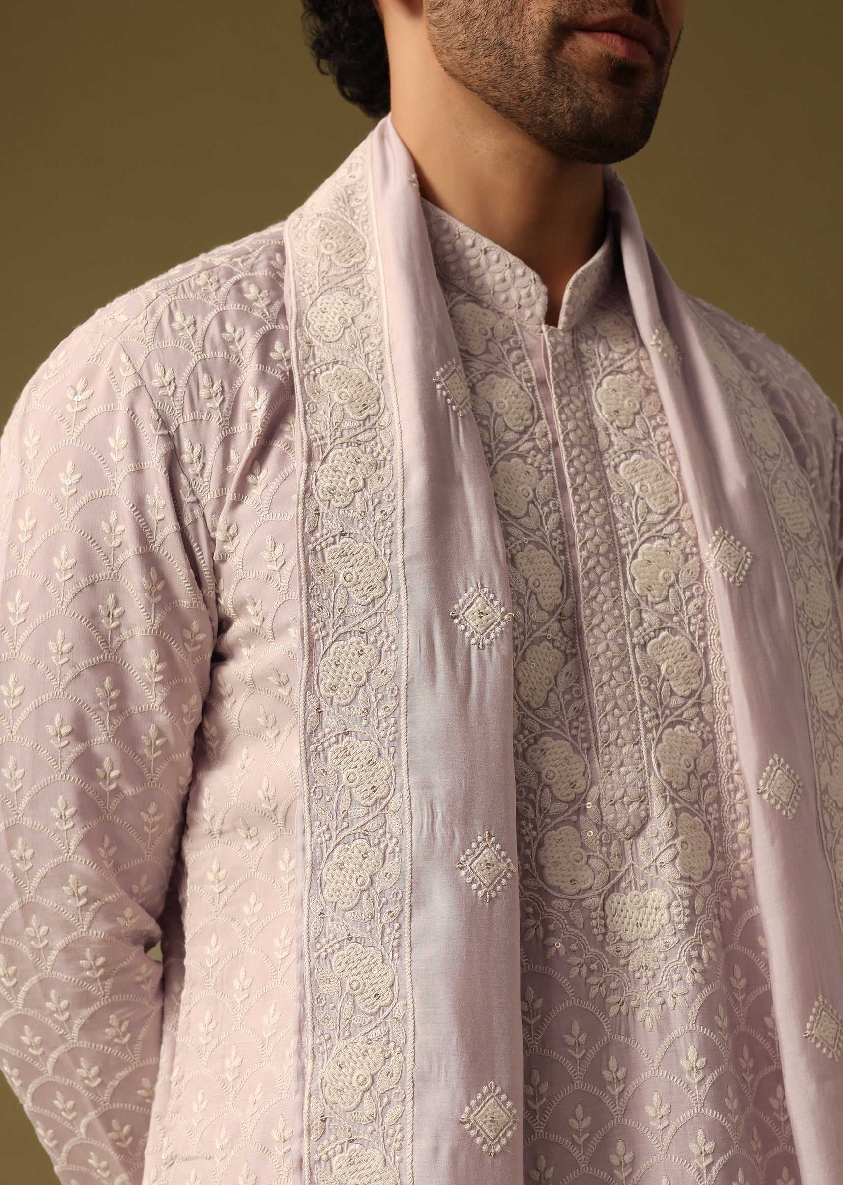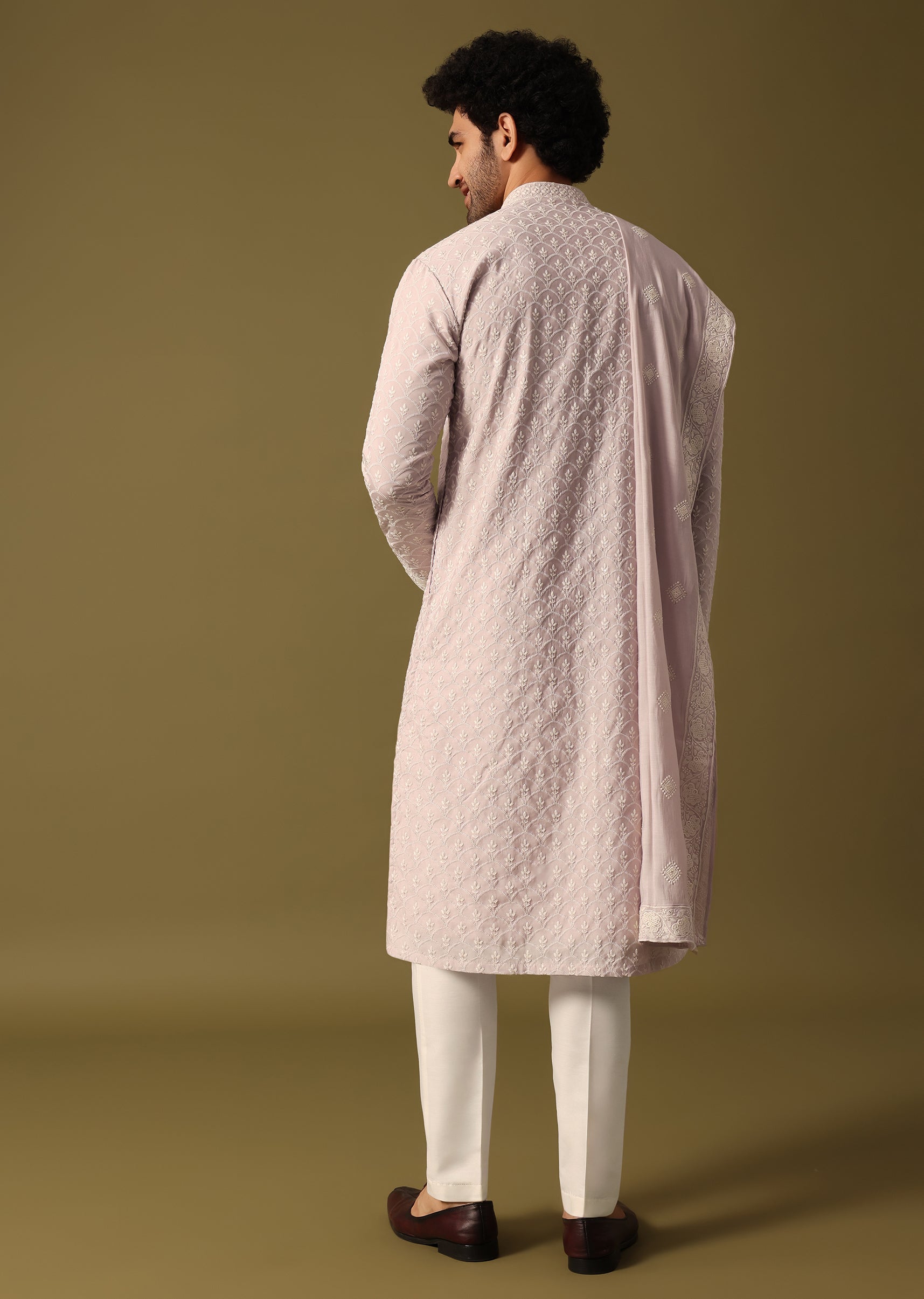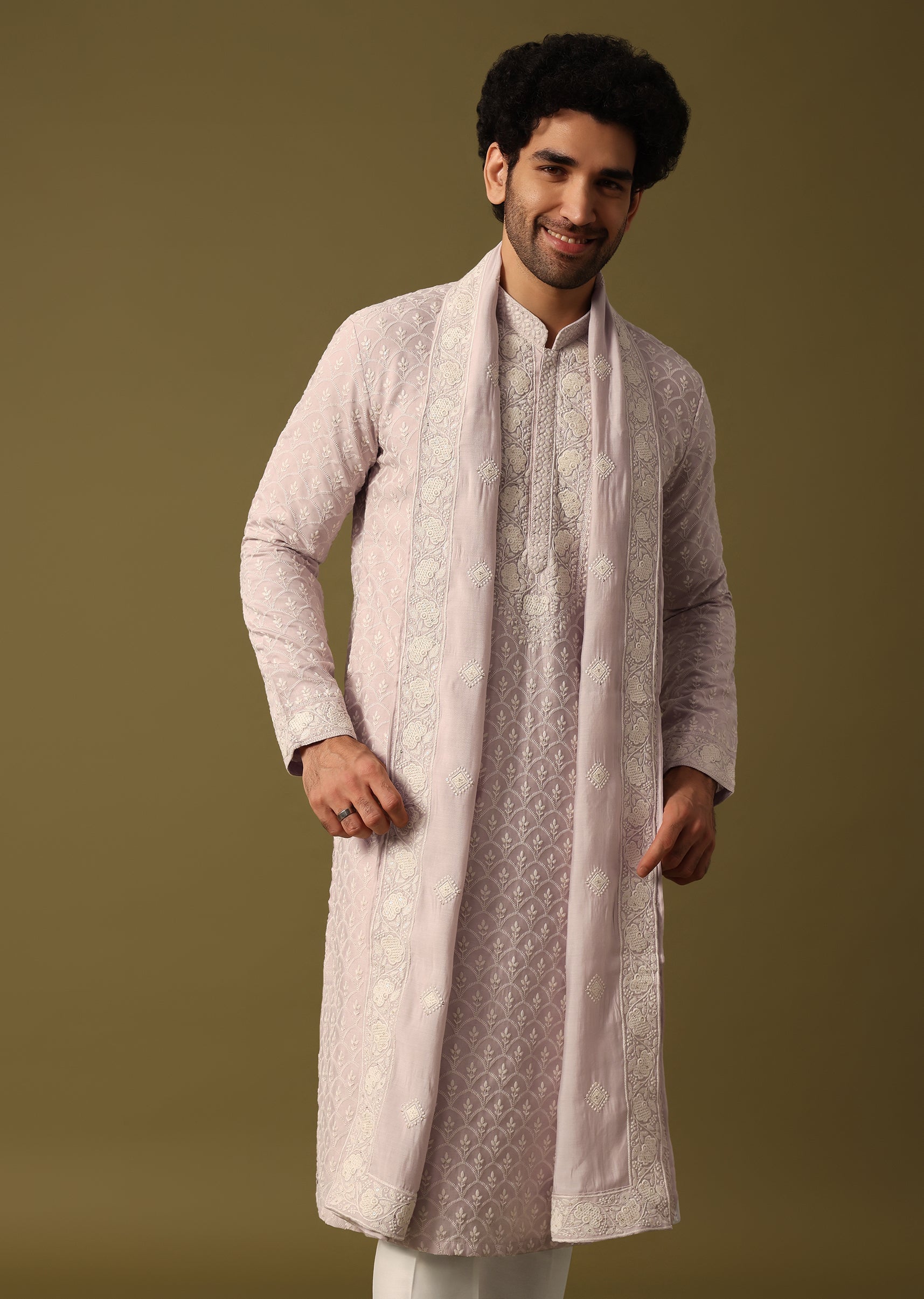 Lavender Kurta Pant Set With Dupatta In Resham Work For Men