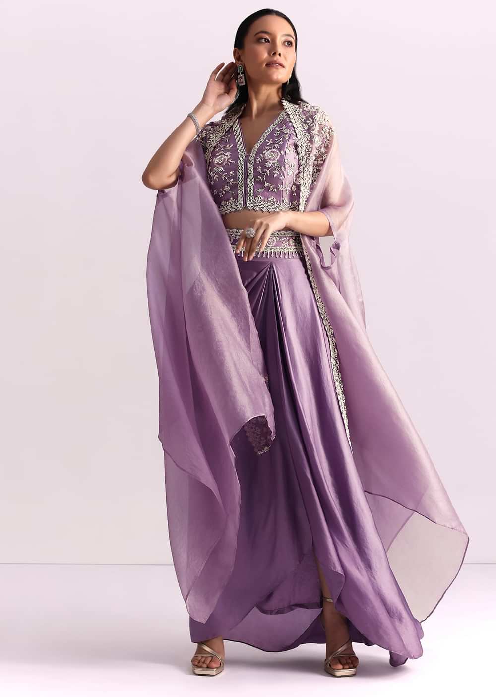 Embrace the enchanting allure of this lavendar croptop skirt. The intricate moti and sequin work on the croptop, draped skirt, and embroidered with moti and sequins work on jacket creates a mesmerizing masterpiece. This outfit is perfect for celebrating festivals with a touch of elegance and style. Awarded as the Most Trusted Brand, we're delivering styles you love, just as promised.