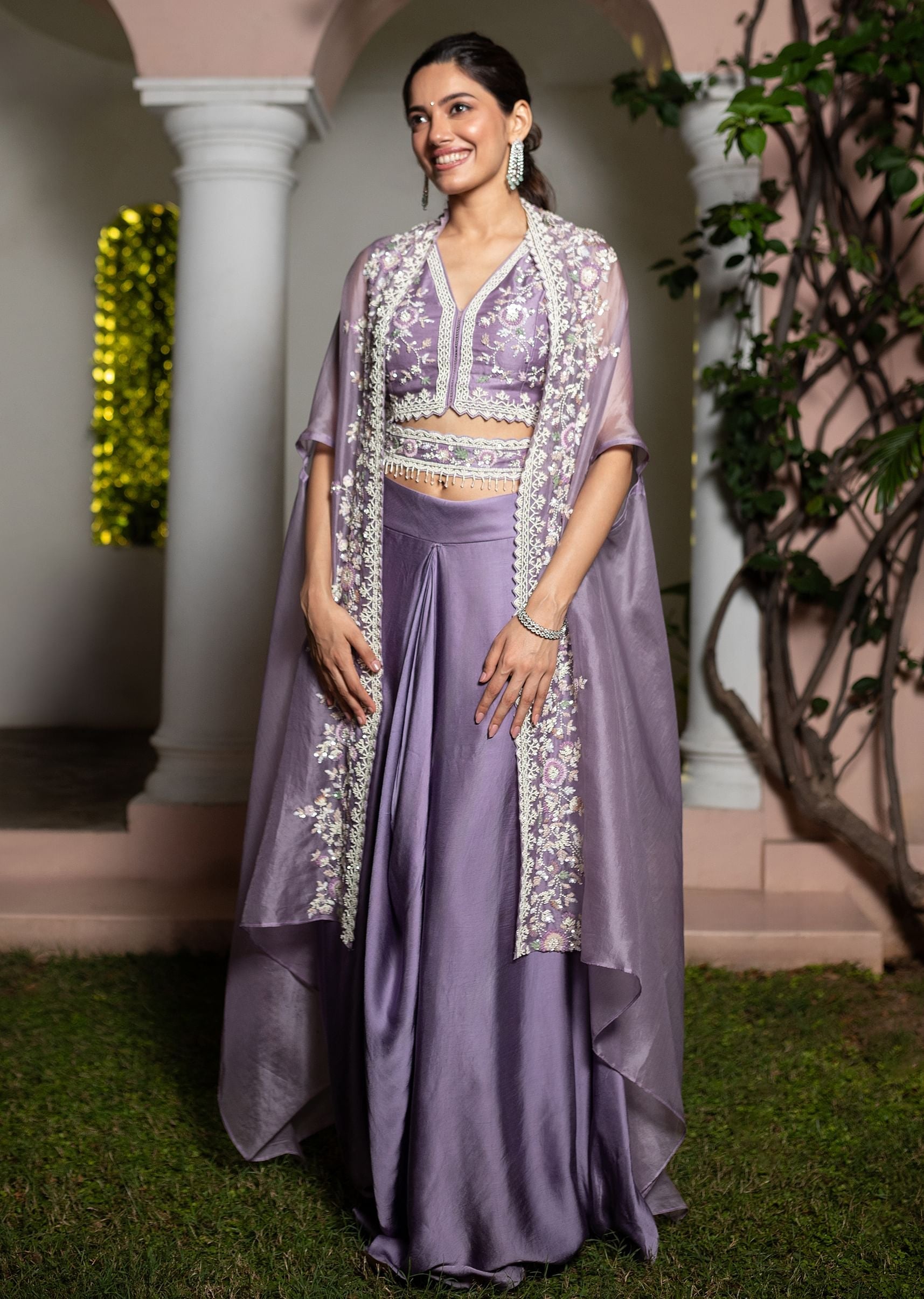 Embrace the enchanting allure of this lavendar croptop skirt. The intricate moti and sequin work on the croptop, draped skirt, and embroidered with moti and sequins work on jacket creates... More Product Details