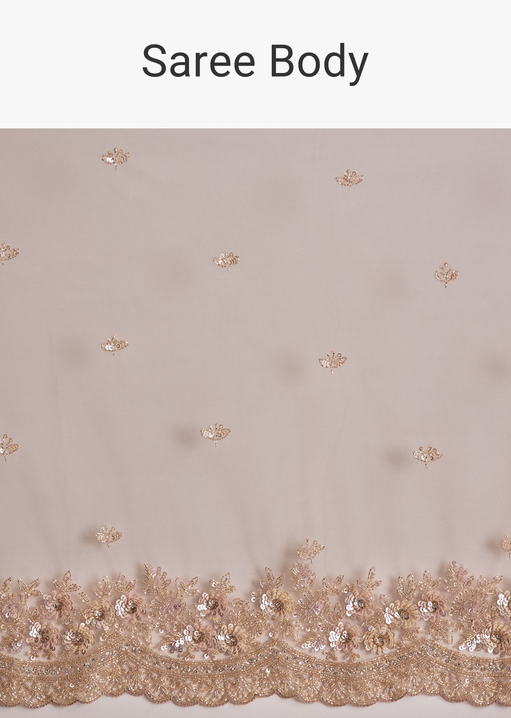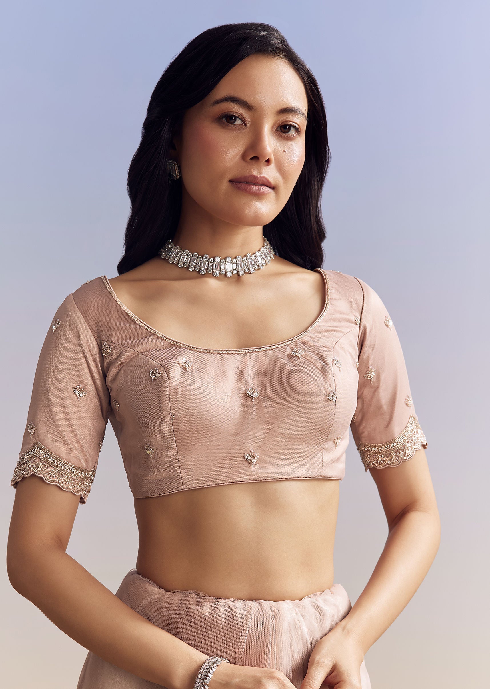 Delicate and festive, this lavender net saree with scallop detailing is embellished with cutdana, sequins, and beads, ideal for bridesmaids or wedding guests at sangeet and receptions. Includes an unstitched... More Product Details