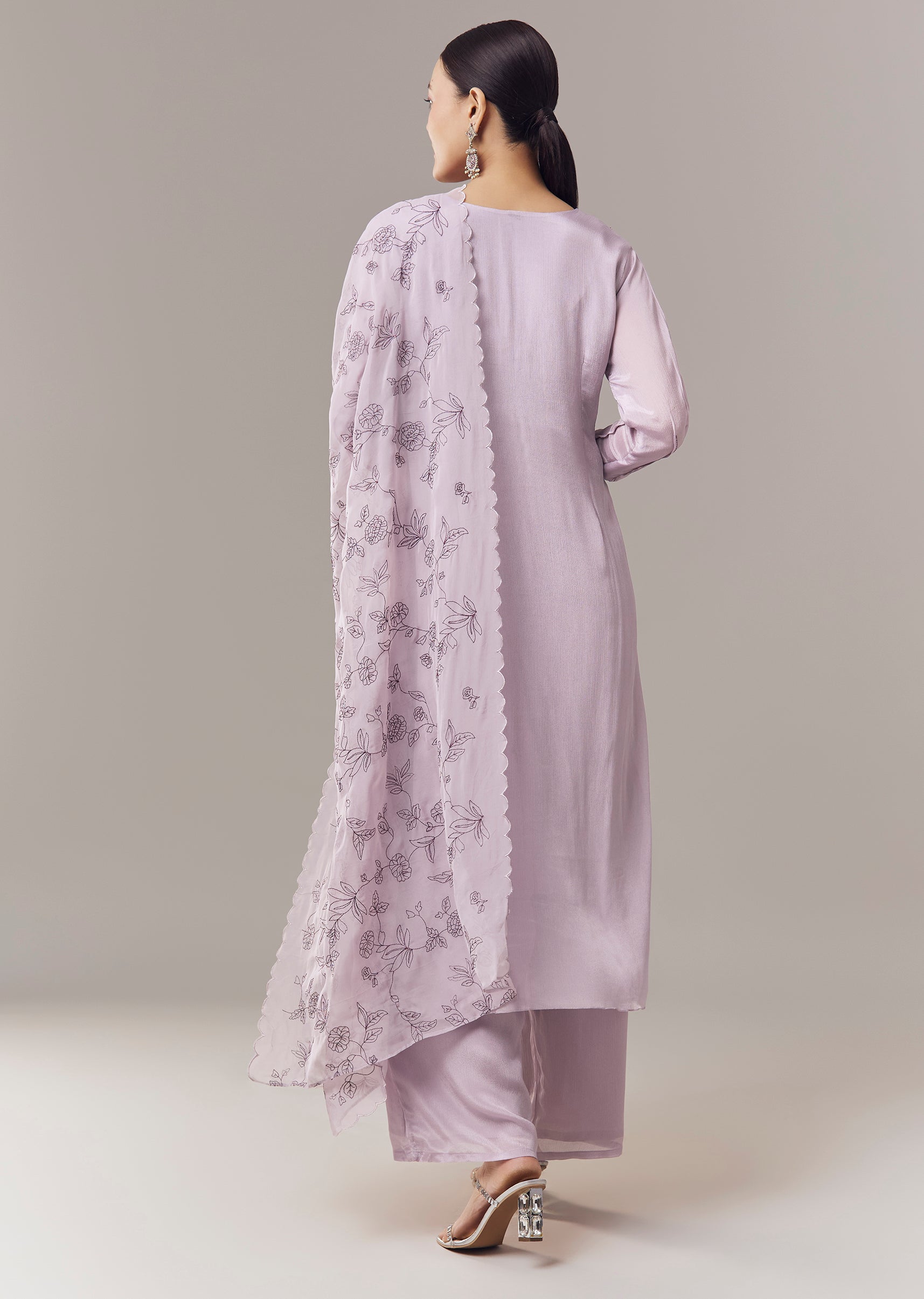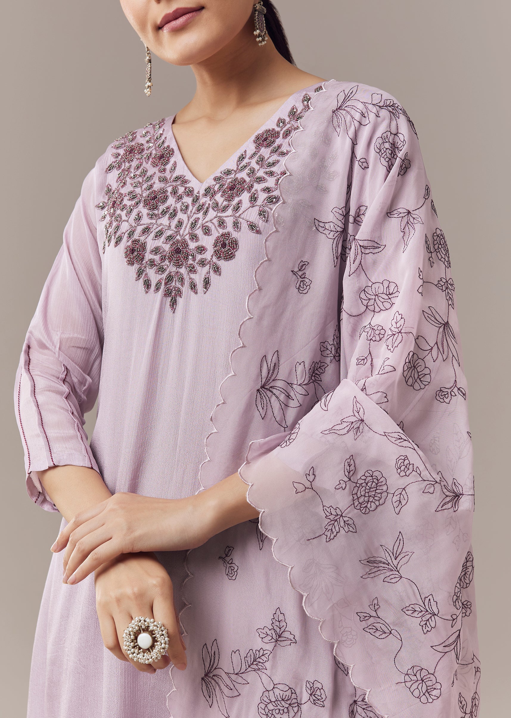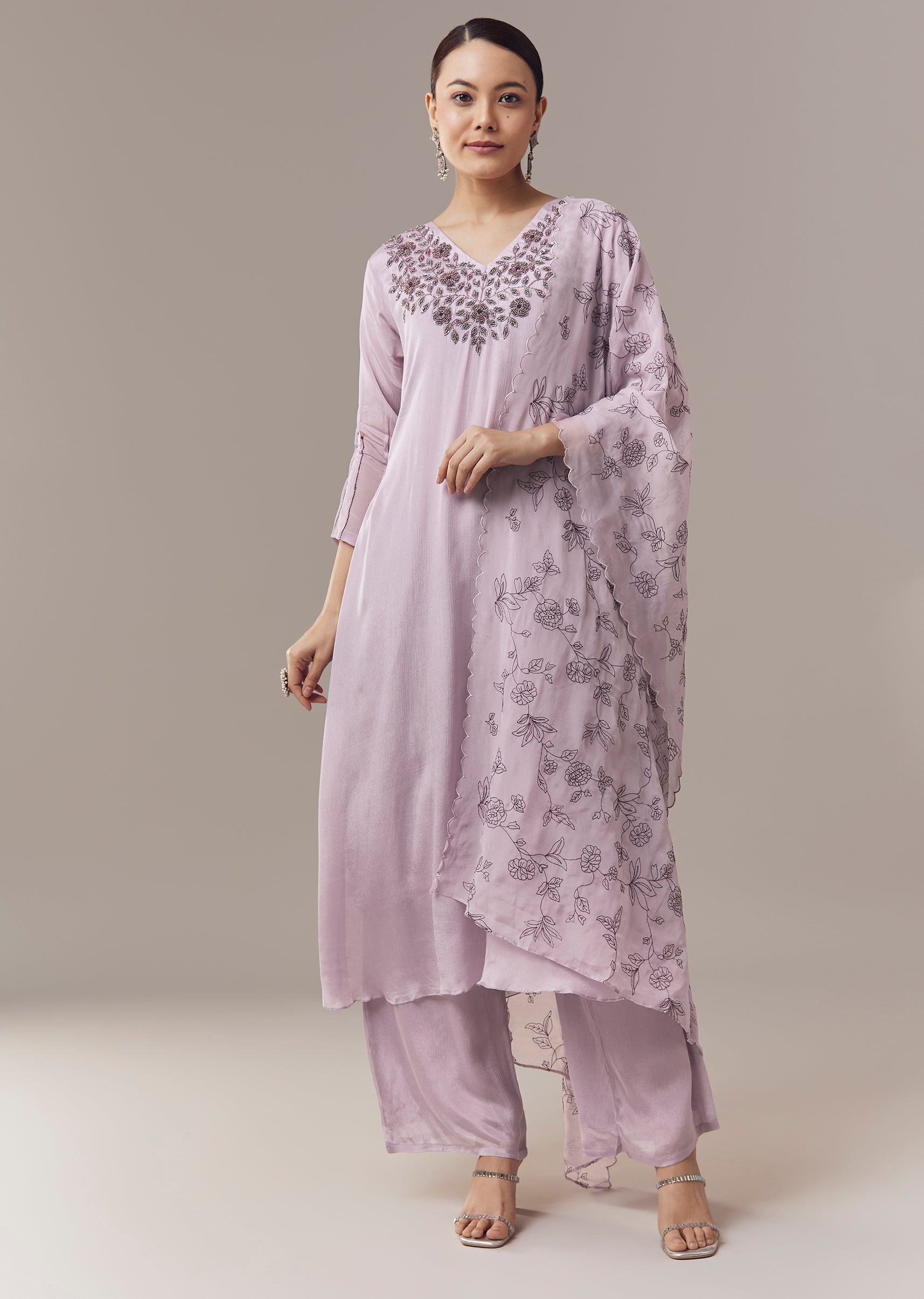 Lavender Pakistani Style Kurta Set With Beads Sequins And Cut Dana Work And Dupatta