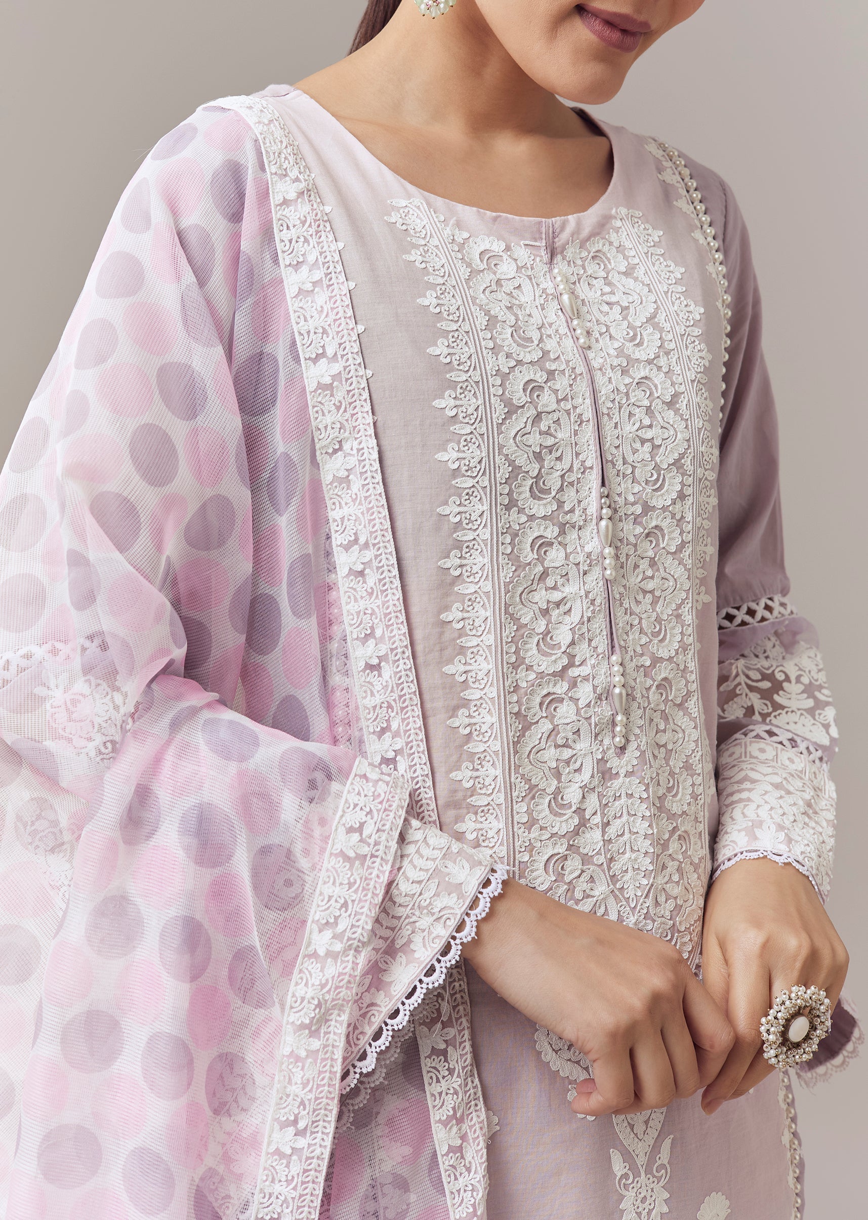 Lavender Pakistani Style Kurta Set With Thread Work And Dupatta