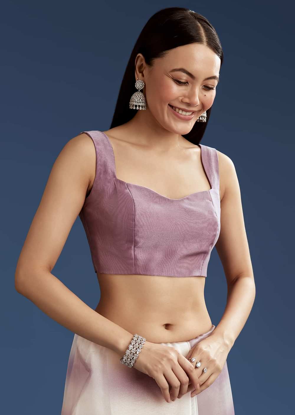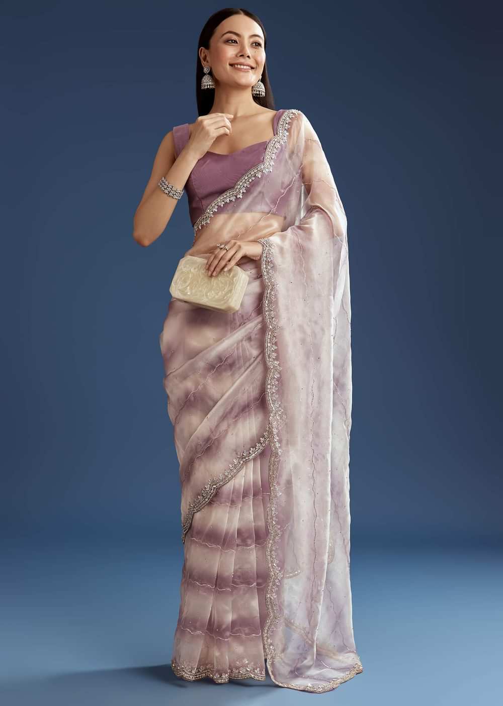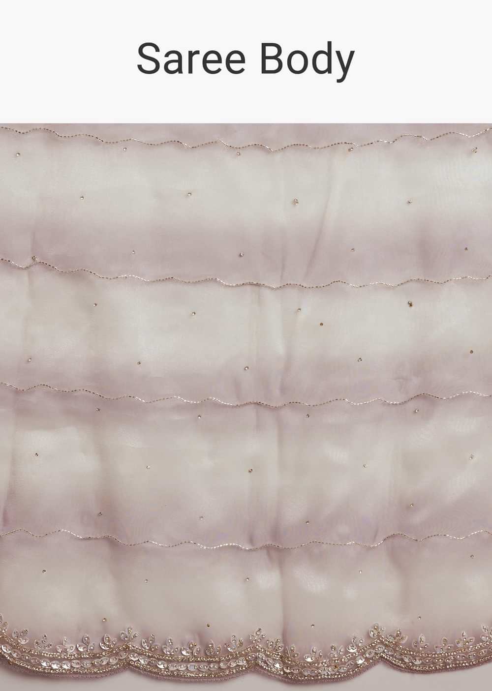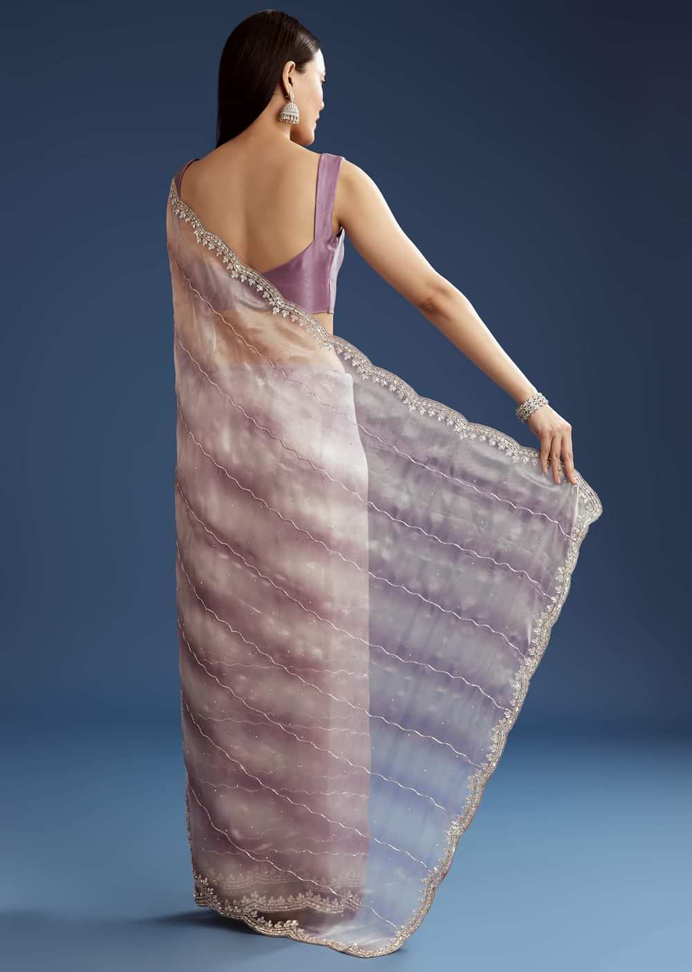 A lavender shaded glass tissue saree featuring scallop border with stone and cutdana bead embroidery, perfect for cocktail or evening events. It feels like wearing a quiet poem stitched in... More Product Details