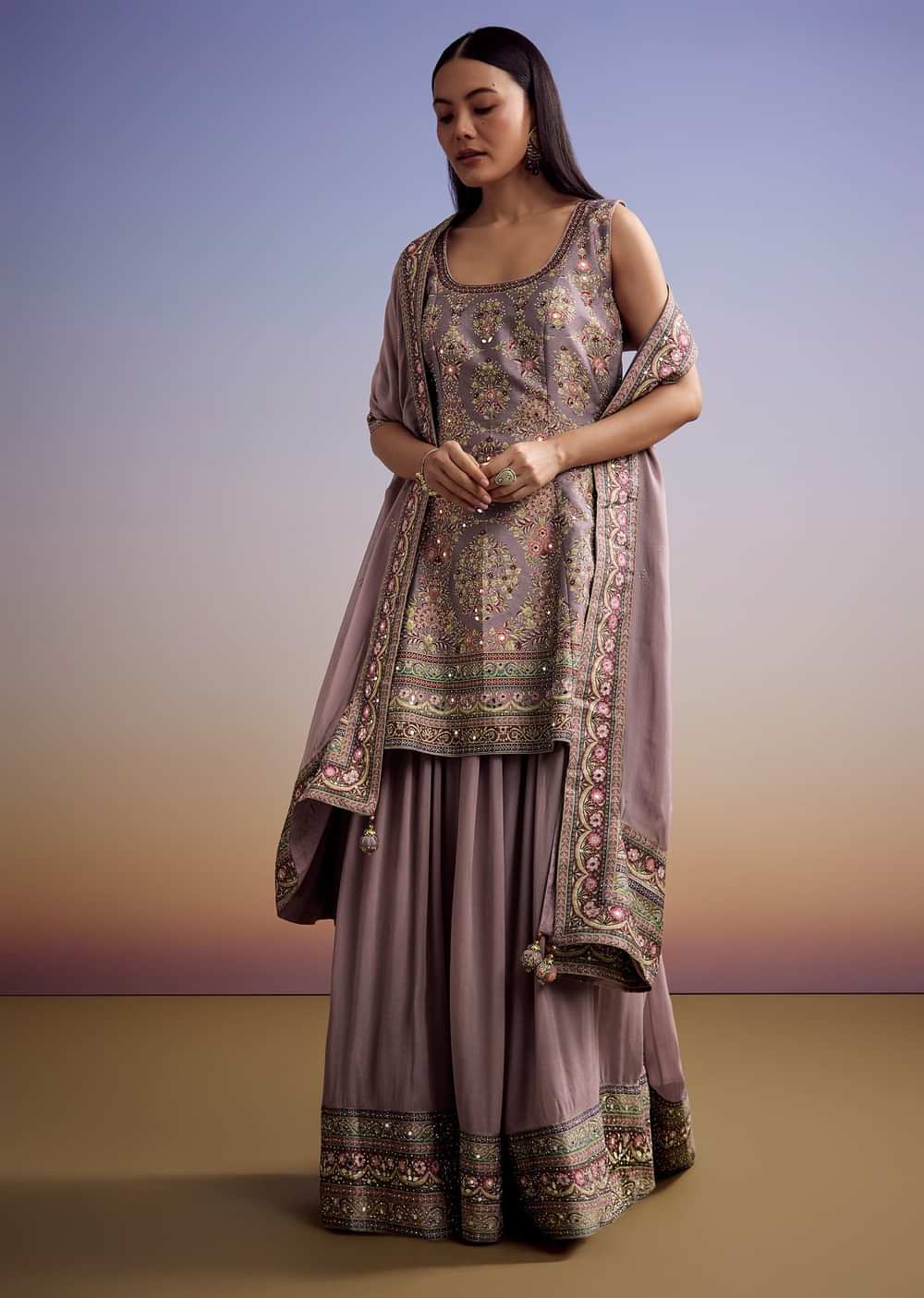 An elegant pick for trousseau wardrobes, this lavender palazzo set features a printed silk kurta with stone detailing that catches the light in all the right ways. The sleeveless round... More Product Details