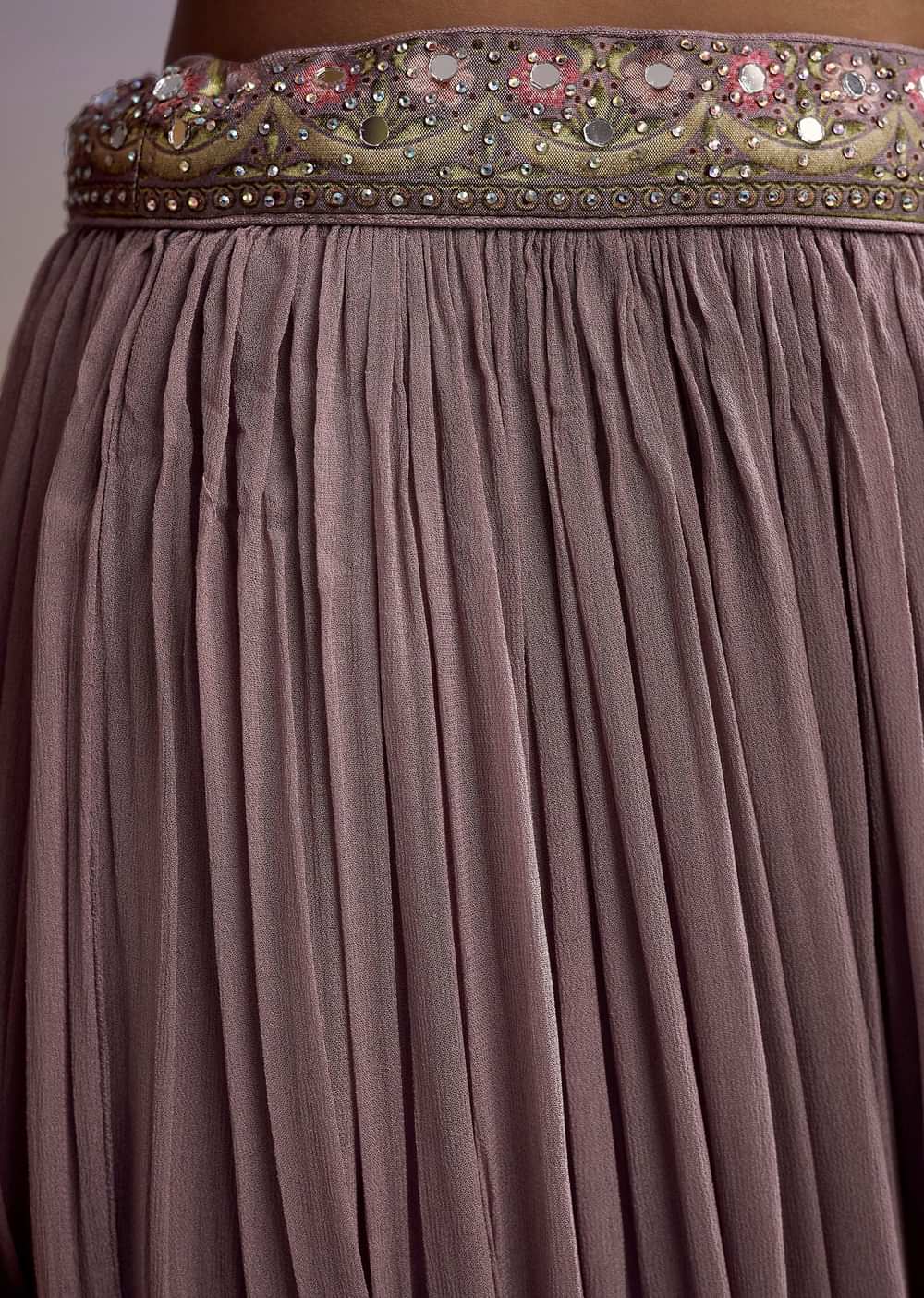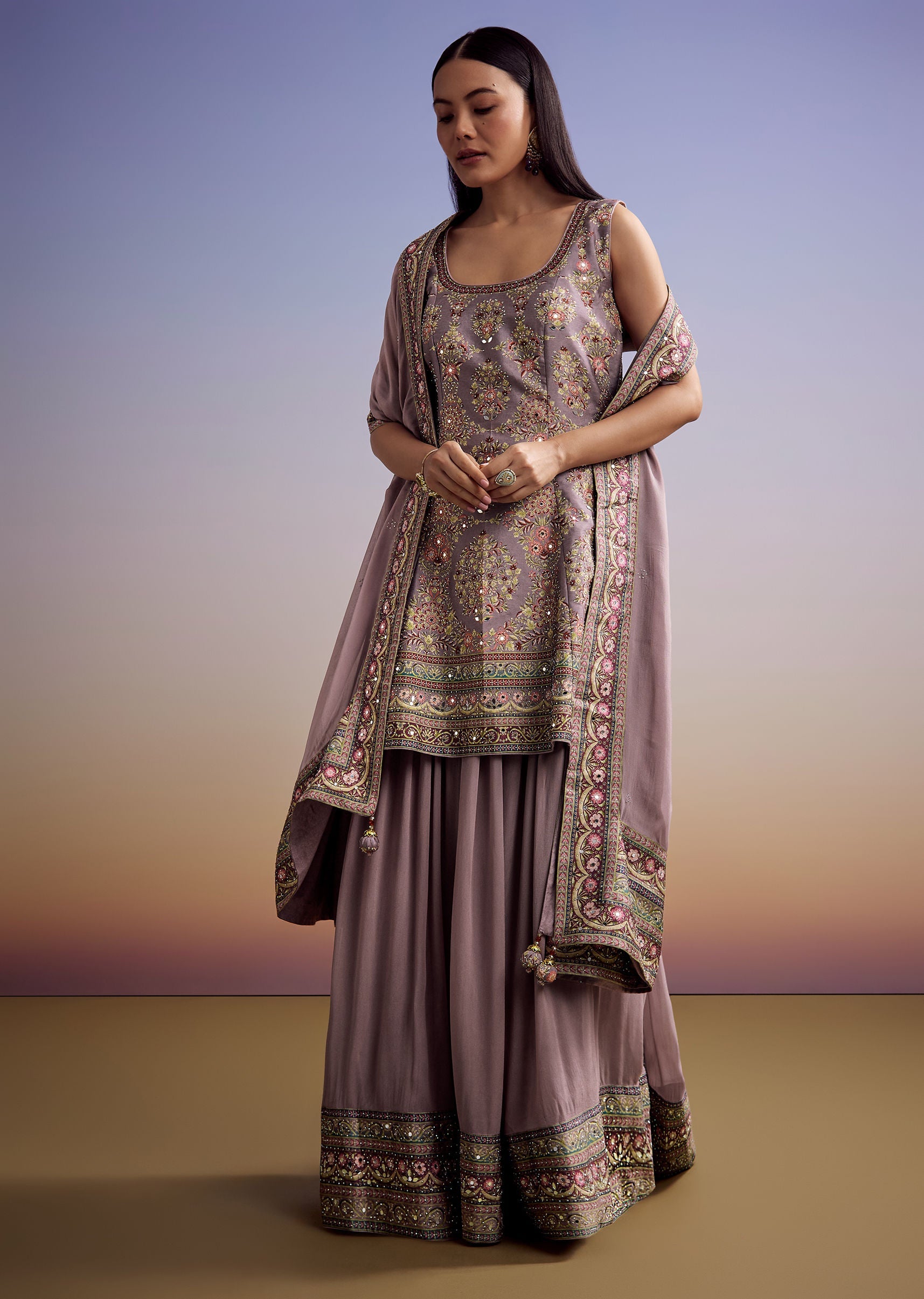 Lavender Silk Palazzo Suit With Stone Work And Printed Kurta