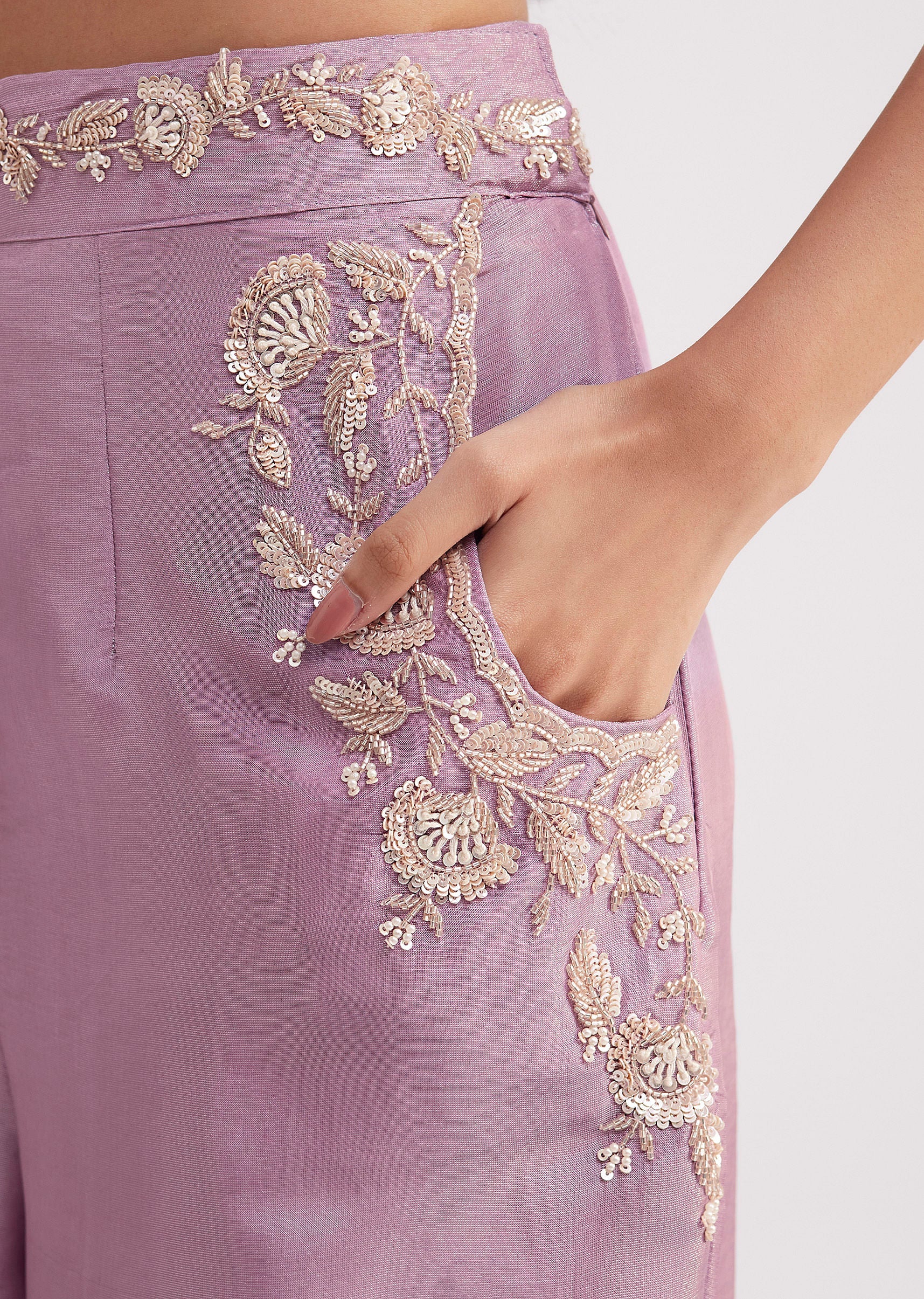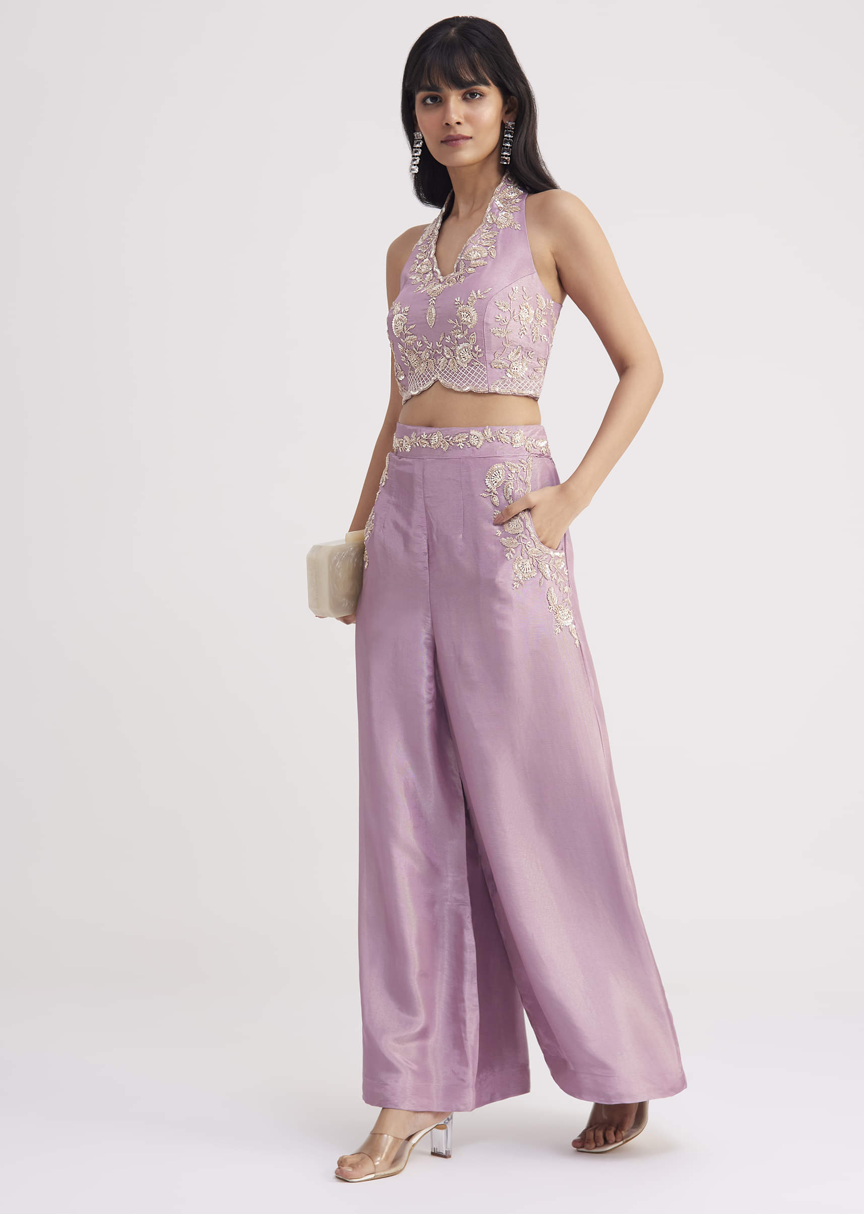 Radiate elegance with this lavender tissue crop top and palazzo set adorned with intricate sequins cut dana and moti detailing. The crop top exudes glamor while the palazzo features a beautifully embellished waistband and practical side pockets merging style with utility. Perfect for cocktail nights and sangeet celebrations this ensemble is a seamless blend of modern chic and festive charm. Awarded as the Most Trusted Brand, we're delivering styles you love, just as promised.