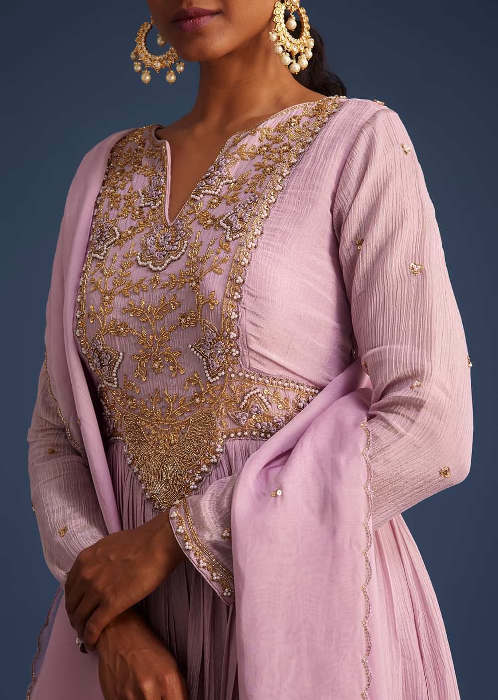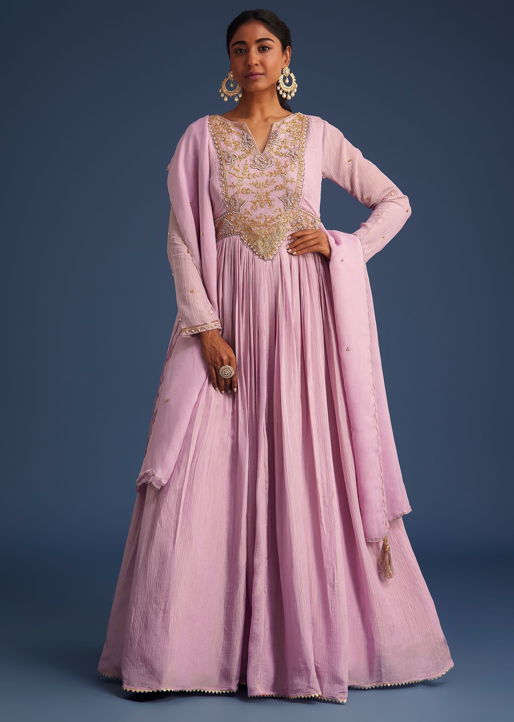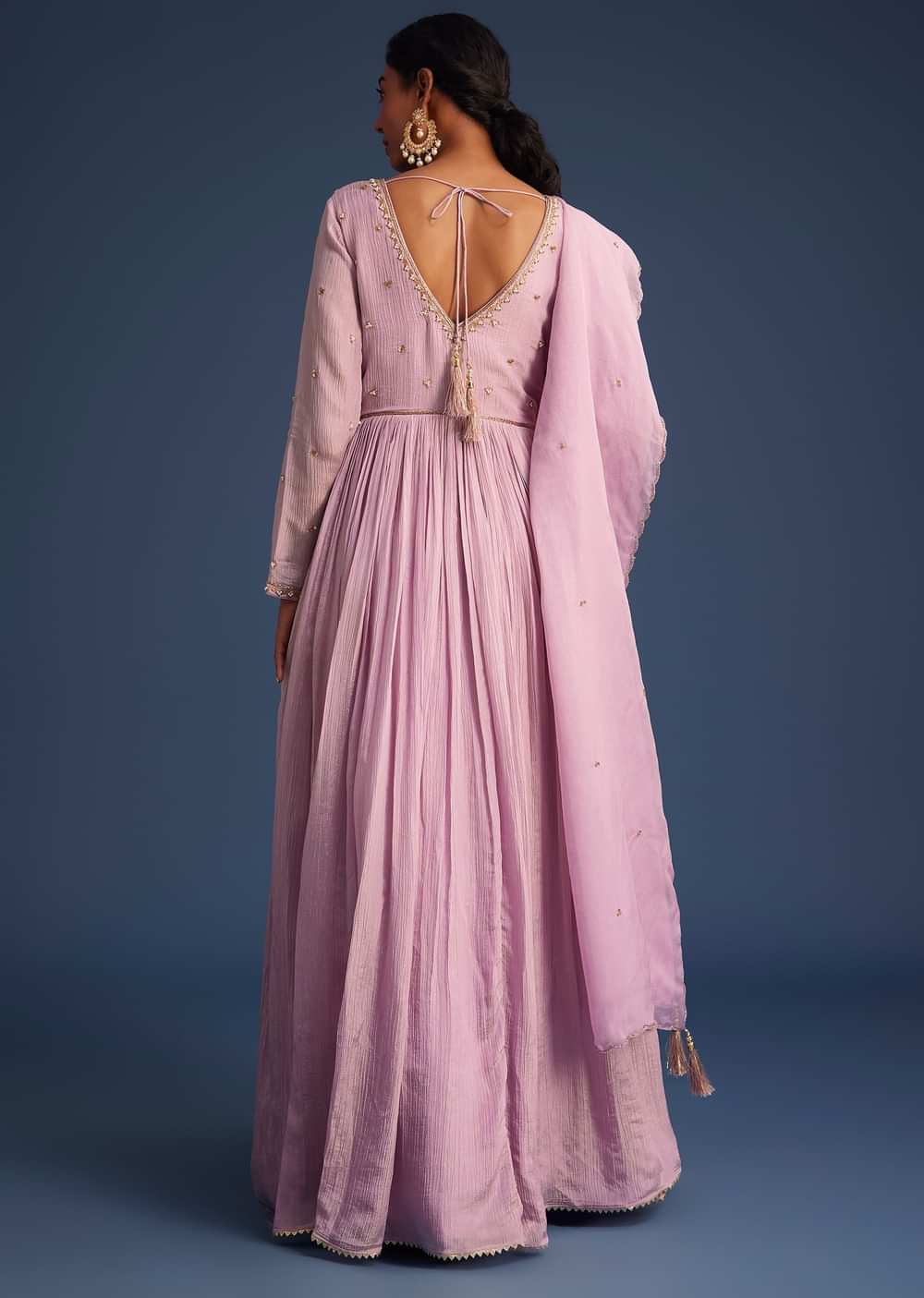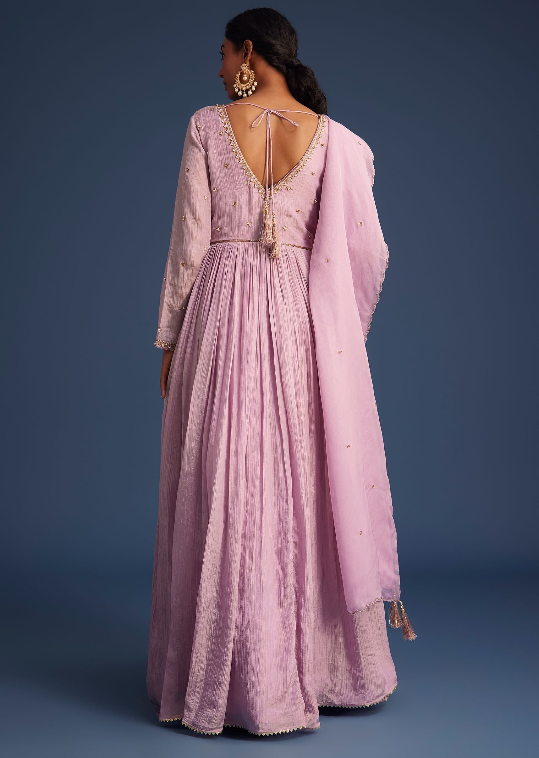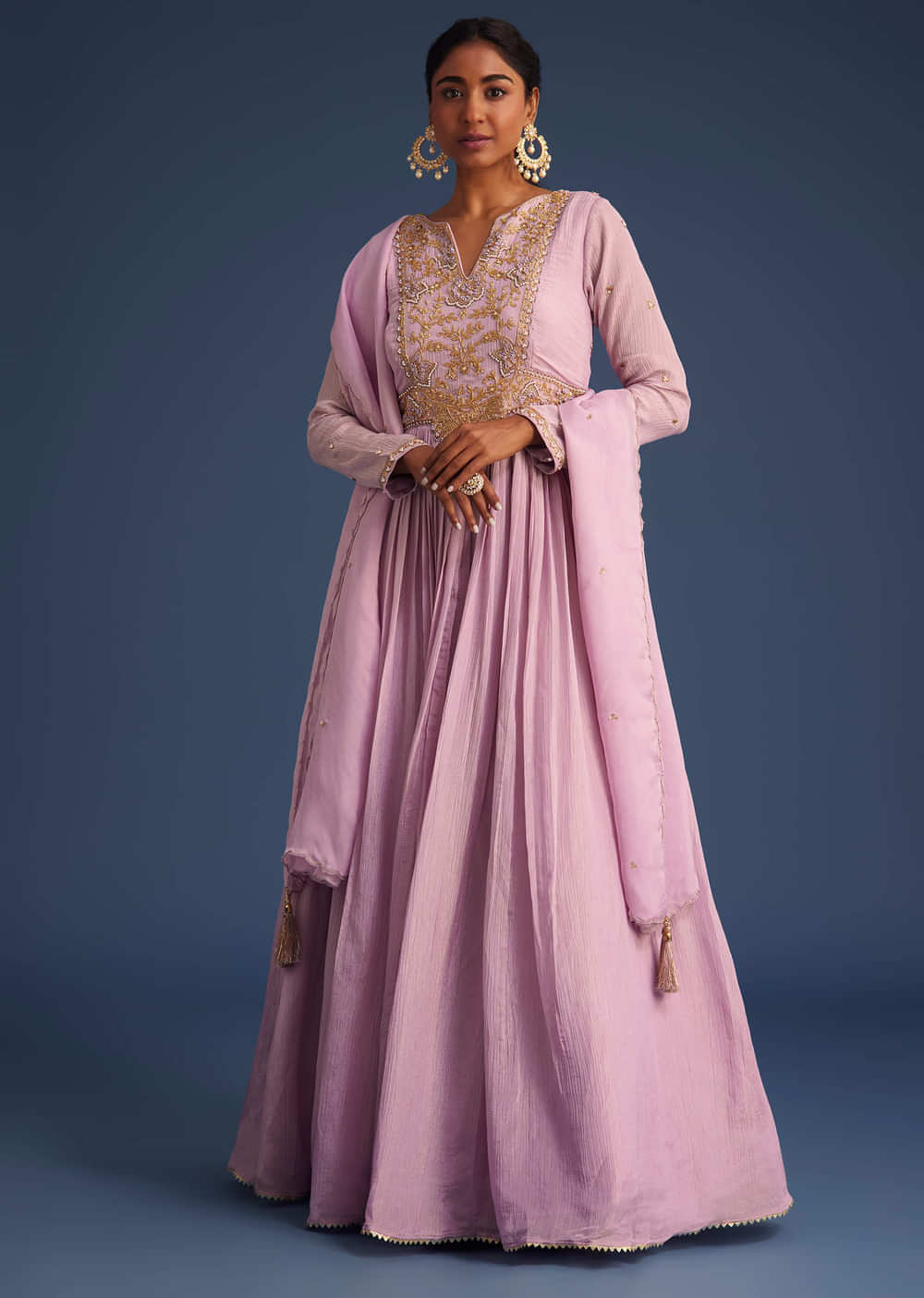 • Embrace Timeless Elegance With This Lavender Tissue Anarkali Crafted To Exude Regal Charm And Sophistication.
