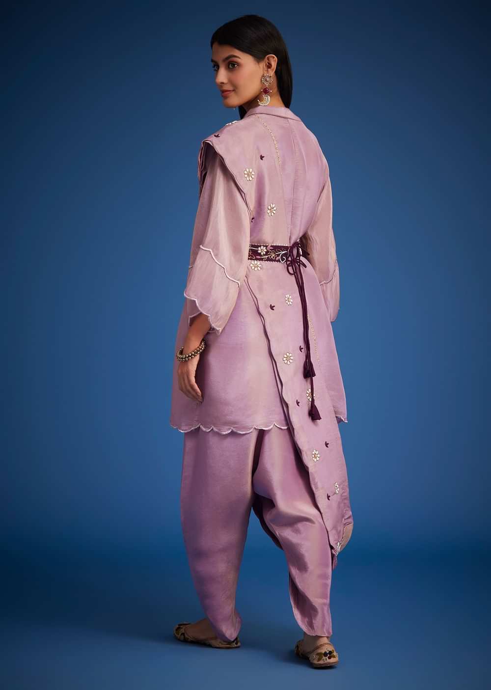 - Step into effortless elegance with this Lavender Tissue Dhoti Set, beautifully adorned with intricate Zardosi, Sequins, Moti, and Resham embroidery.
