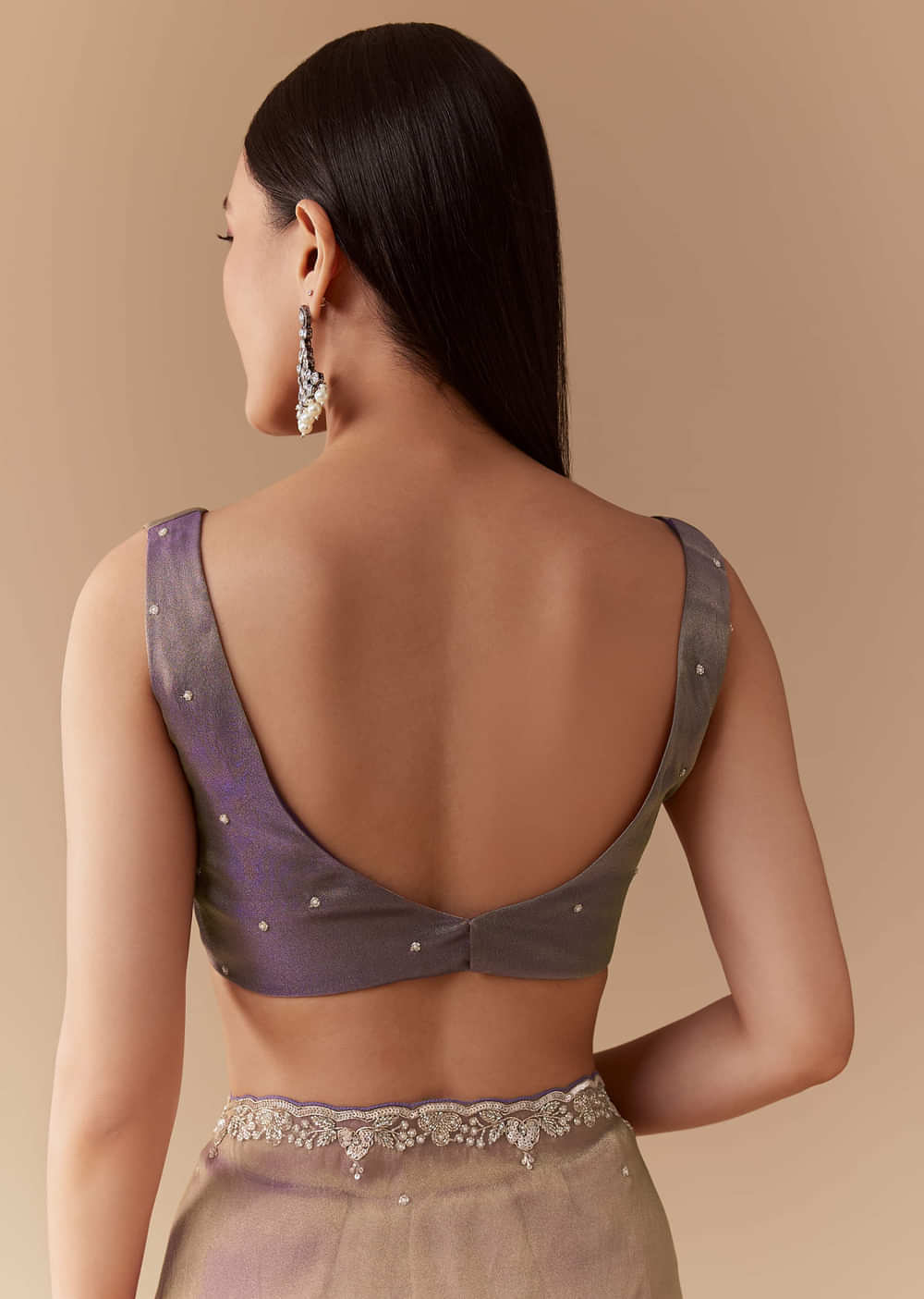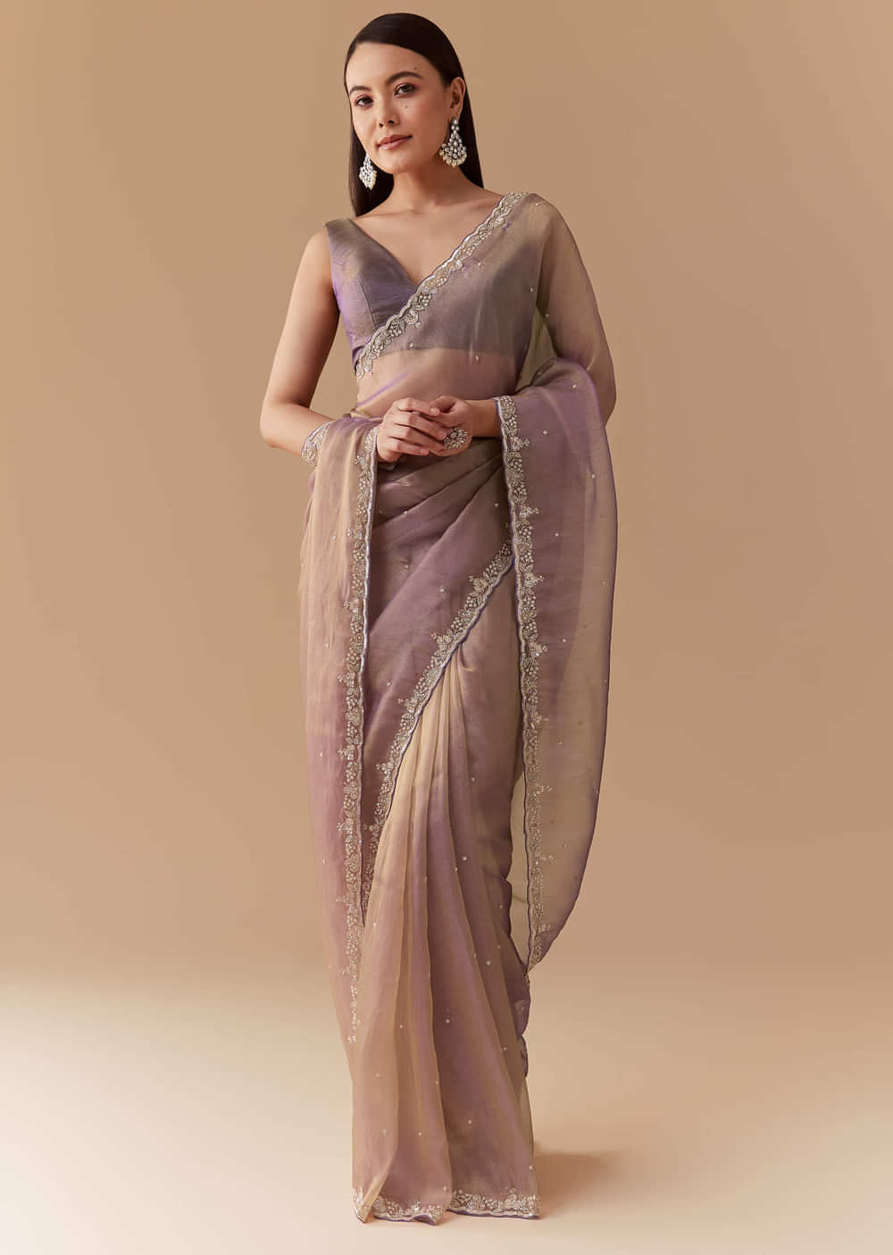 Radiate ethereal charm with this lavender dual-tone tissue saree, beautifully embroidered along the border and all over with cutdana, sequins, and beads. Delicate zardosi detailing enhances its luxurious appeal, adding depth and shimmer to the soft, luminous fabric. Perfect for weddings, receptions, or festive celebrations, this saree effortlessly combines traditional craftsmanship with a modern, graceful allure. Awarded as the Most Trusted Brand, we're delivering styles you love, just as promised.