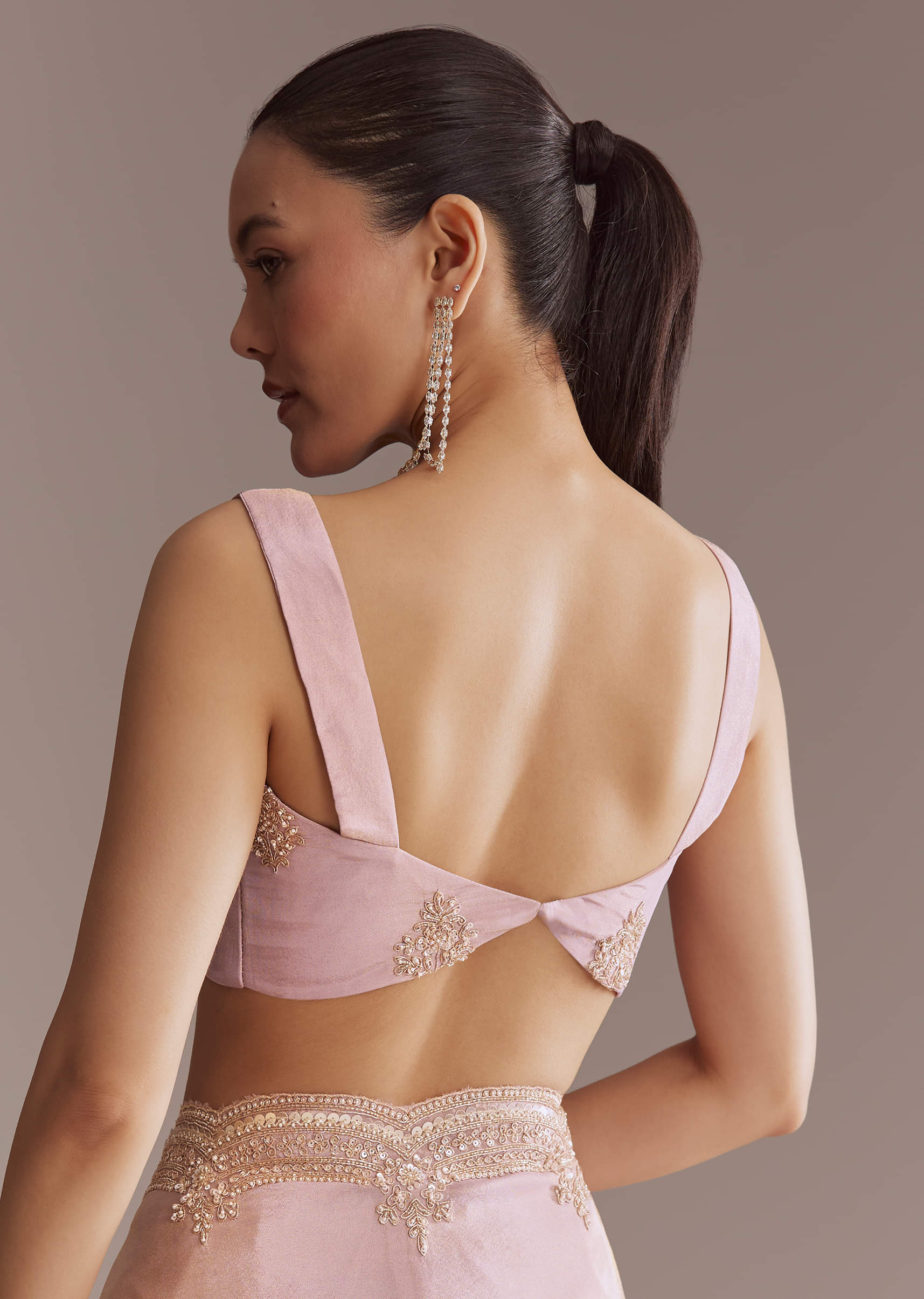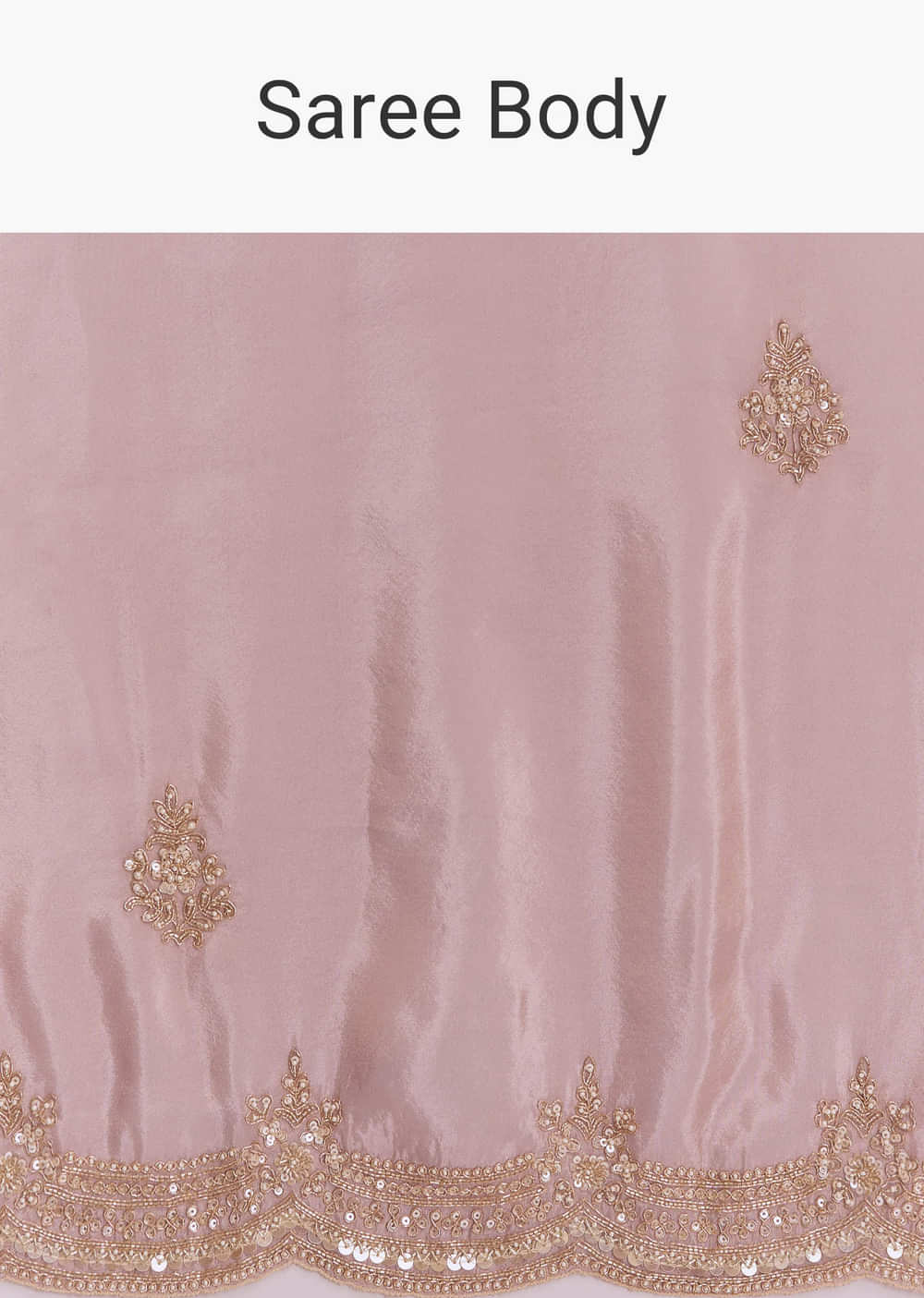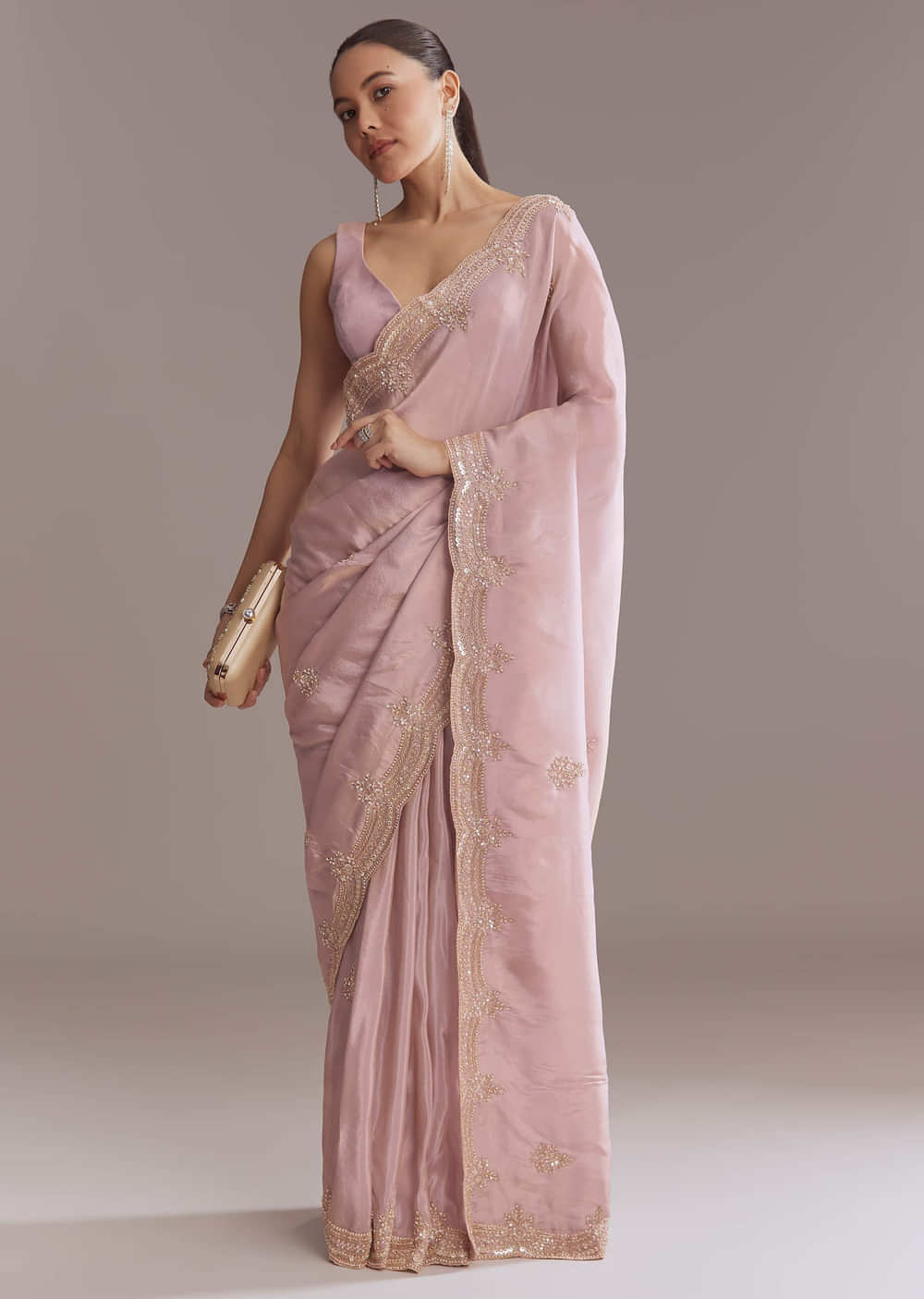 Soft lavender purple brings an elegant charm to this tissue saree. The borders are hand embroidered with buttis, cutdana, zardosi, sequins, and beads for layered detail. It is the perfect... More Product Details