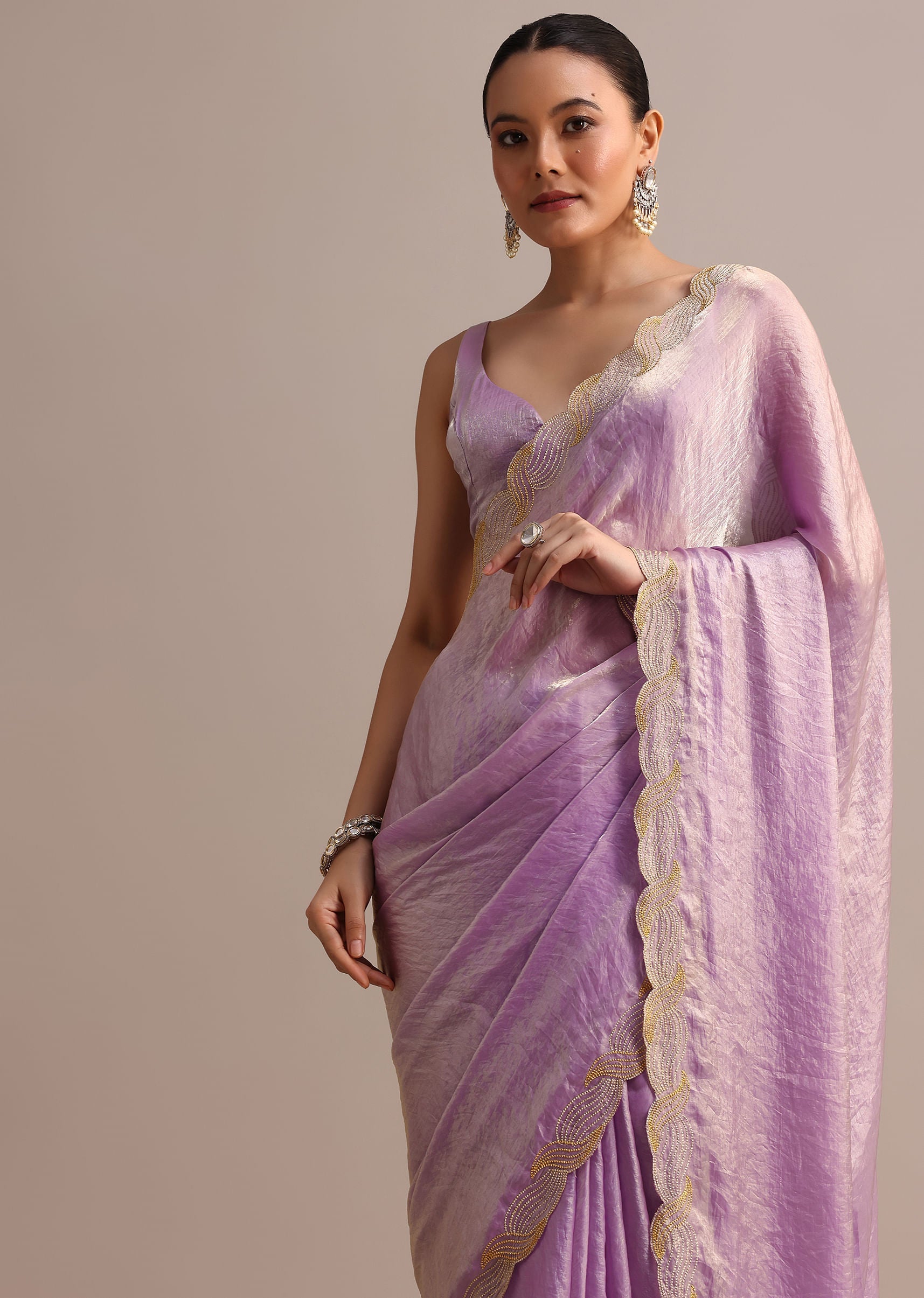 Lavender Tissue Saree With Zari Embroidered Border