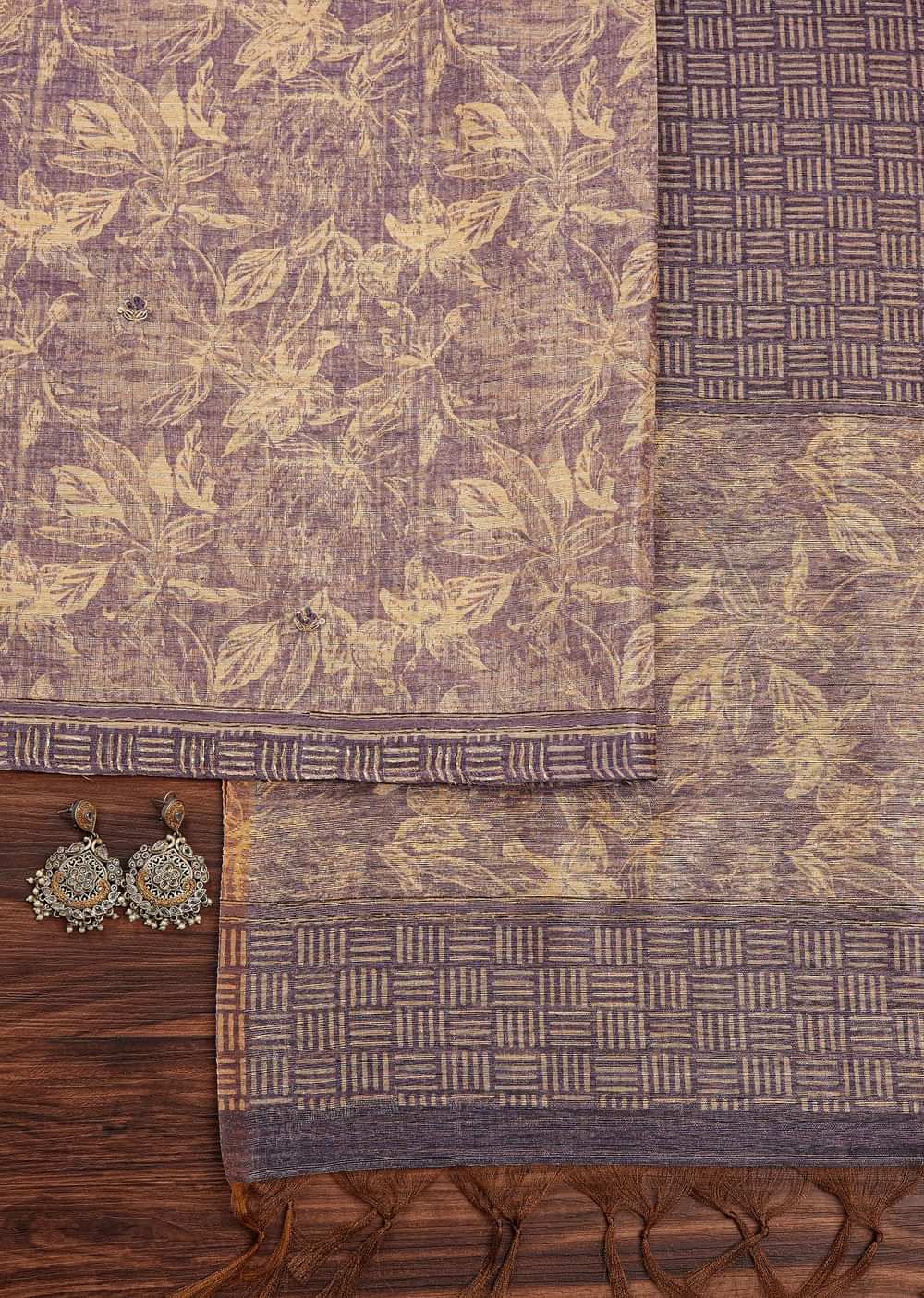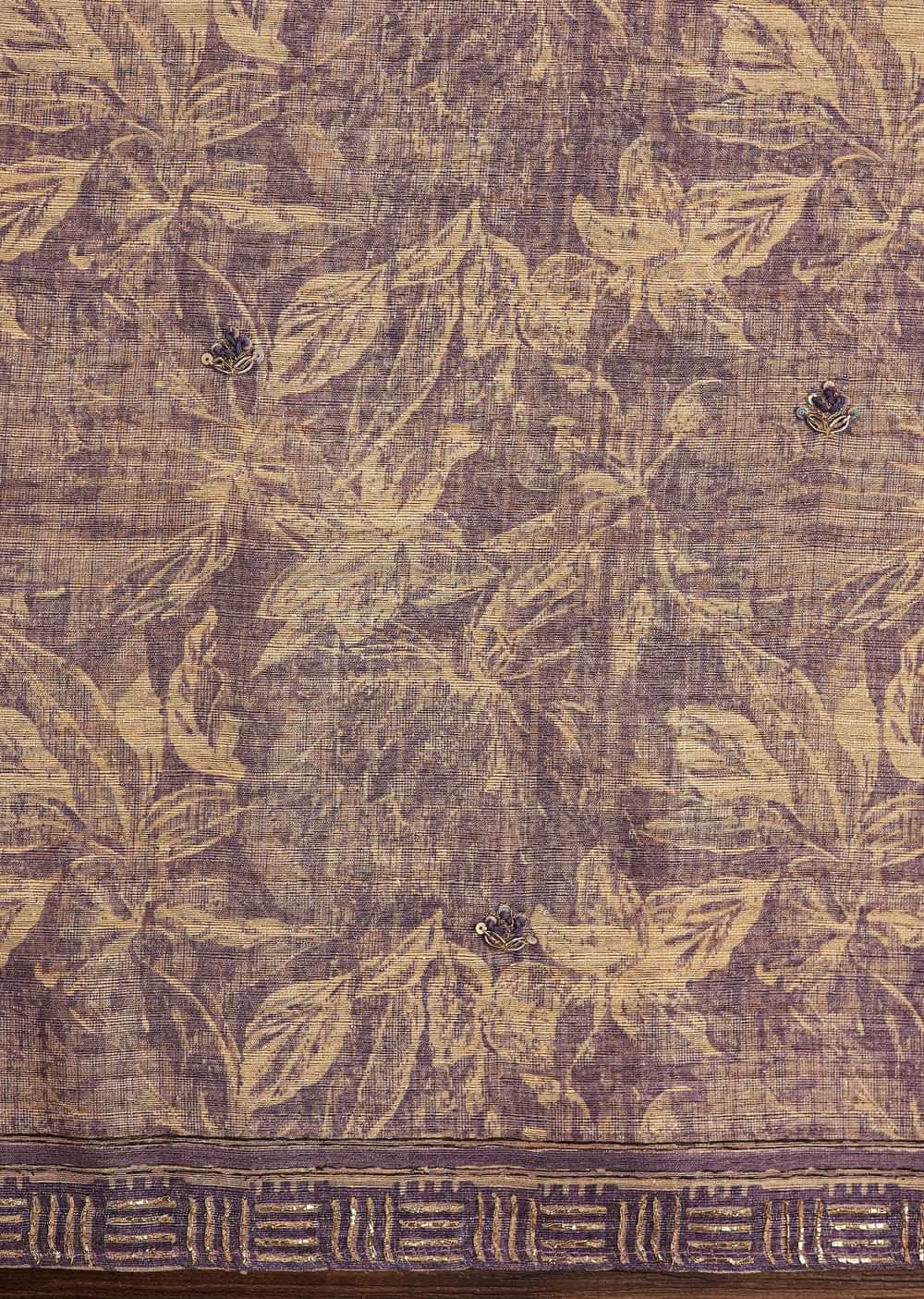 Lavender Tussar Unstitched Suit Set With Floral Print And Zari Work