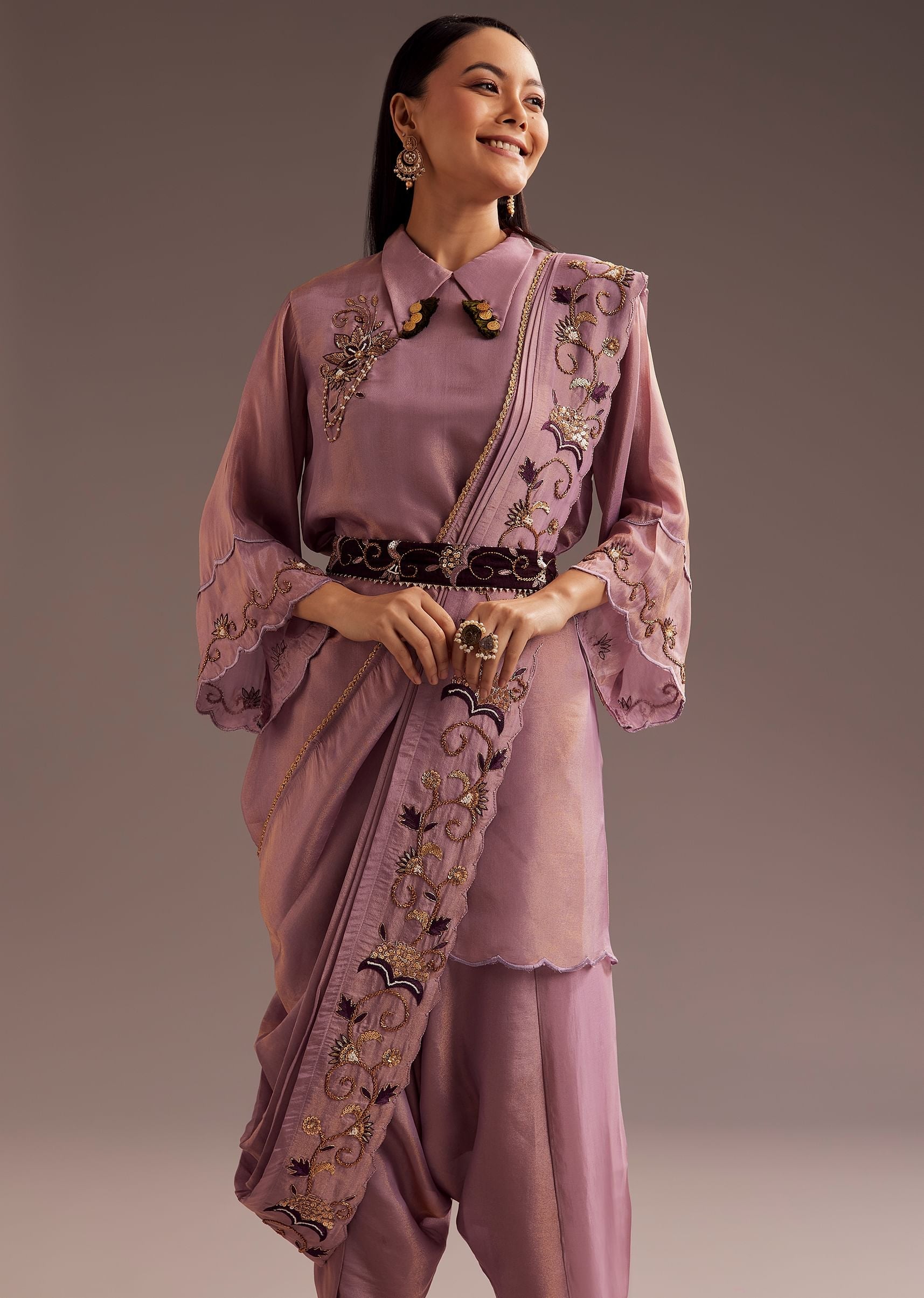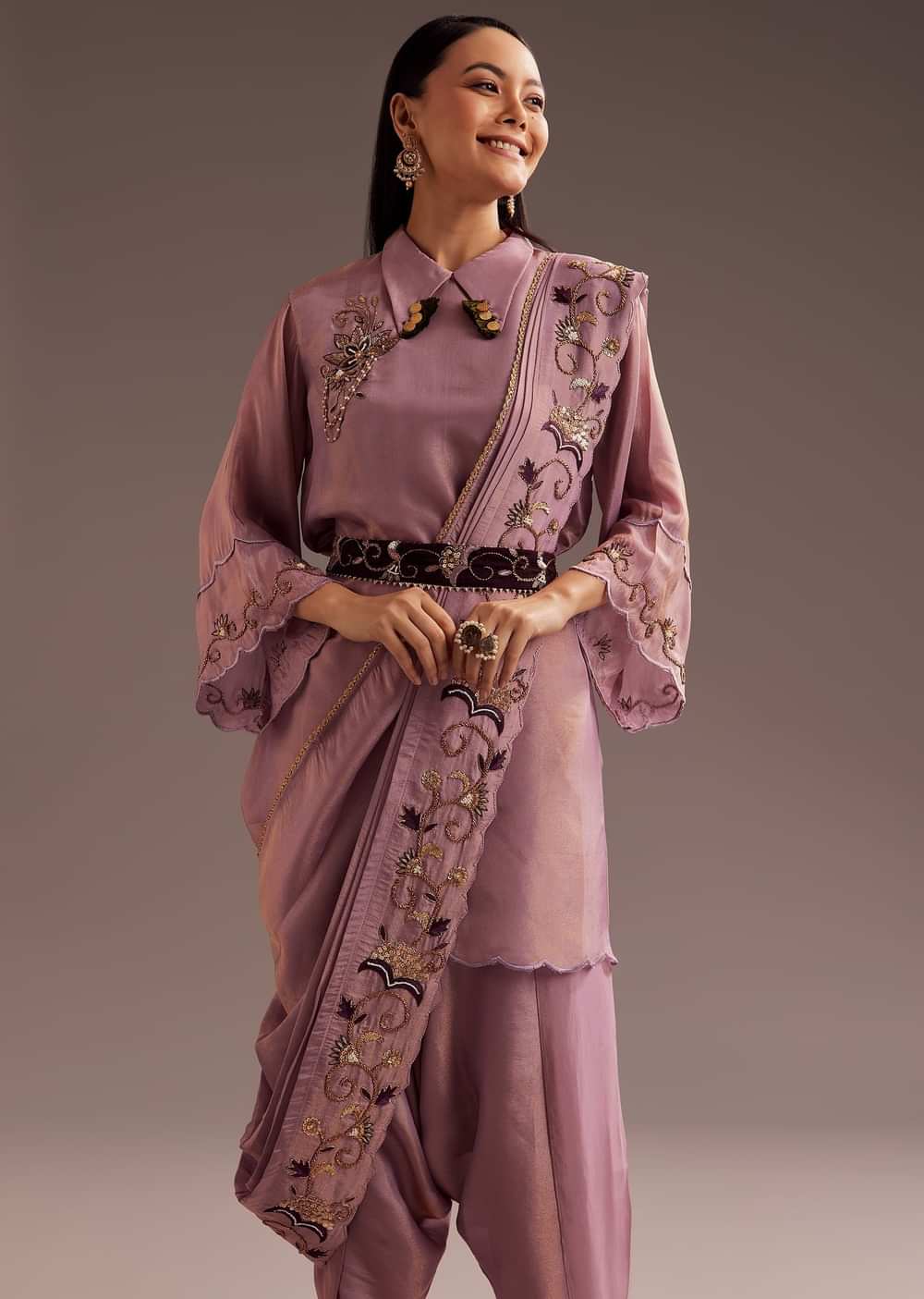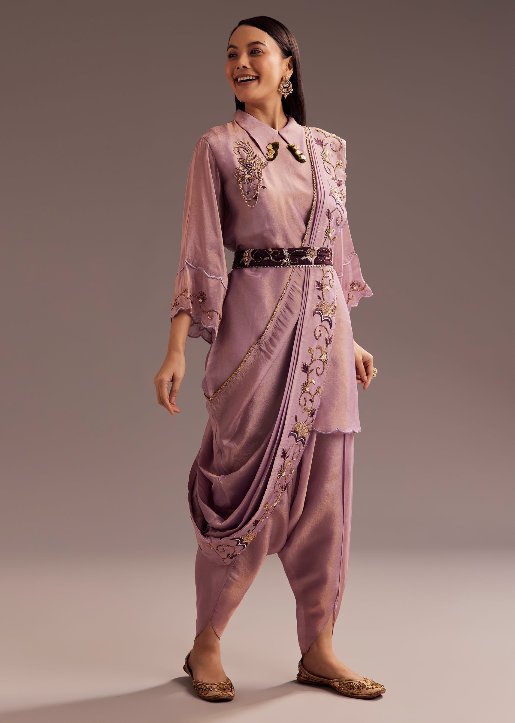 Wrap yourself in elegance with this lavender zardosi motif kurta set. The intricate tassels on the collar add a playful touch, while the pre-draped embroidered dupatta and embroidered belt complete... More Product Details