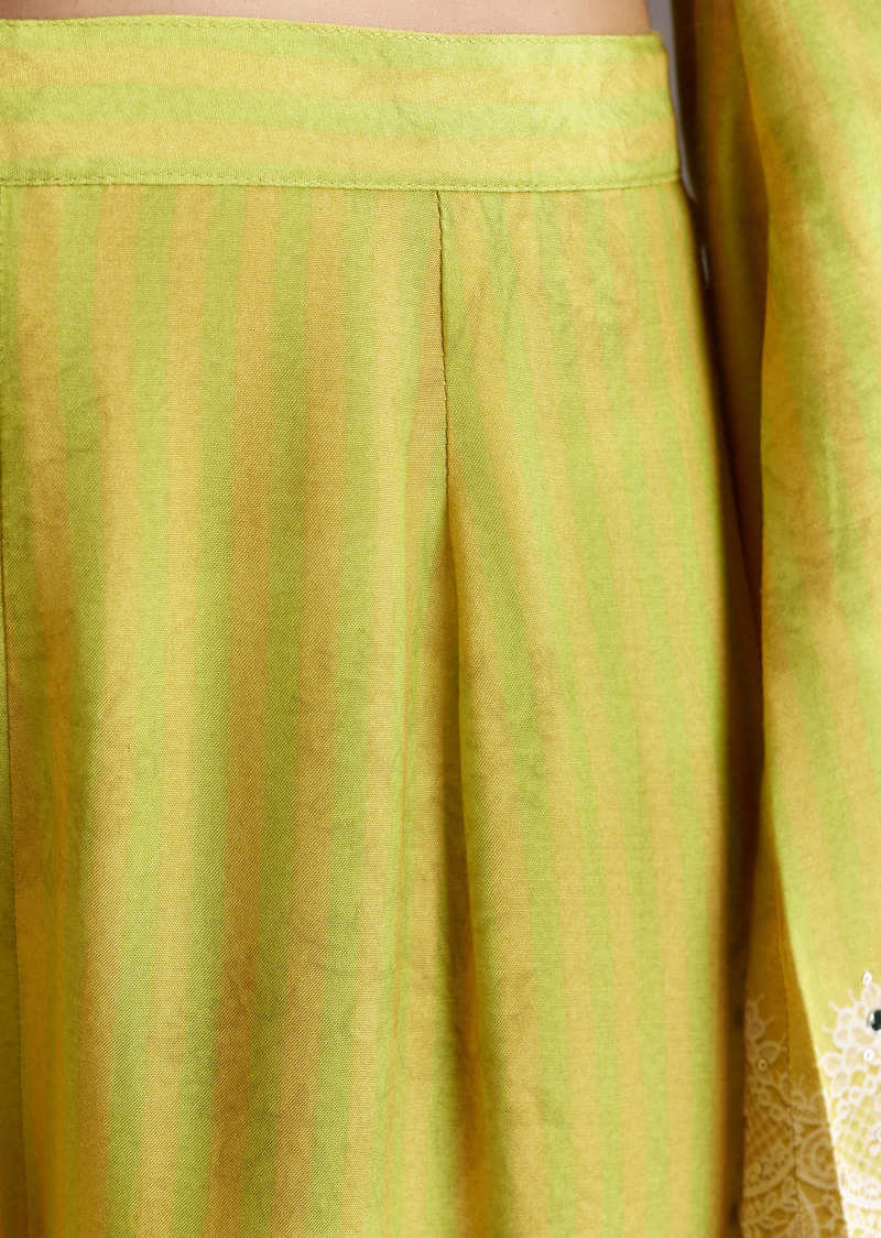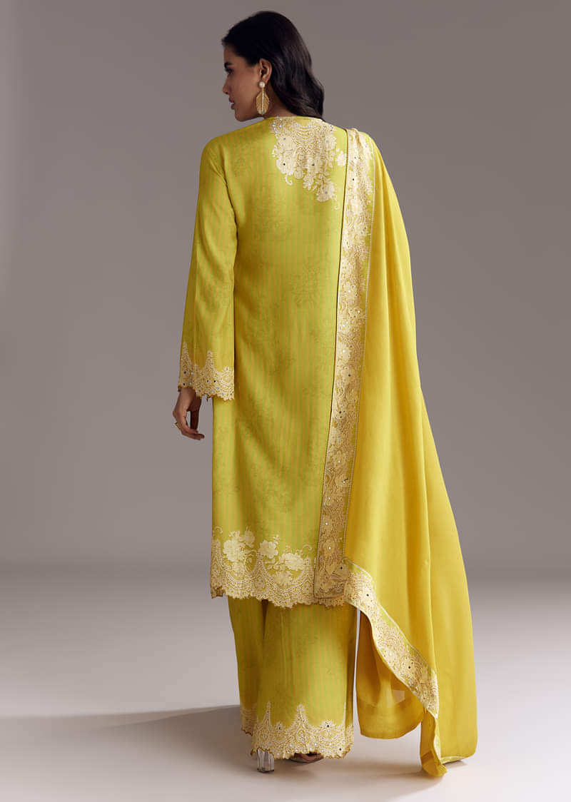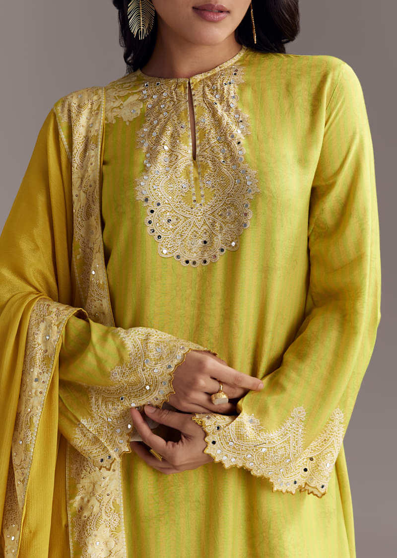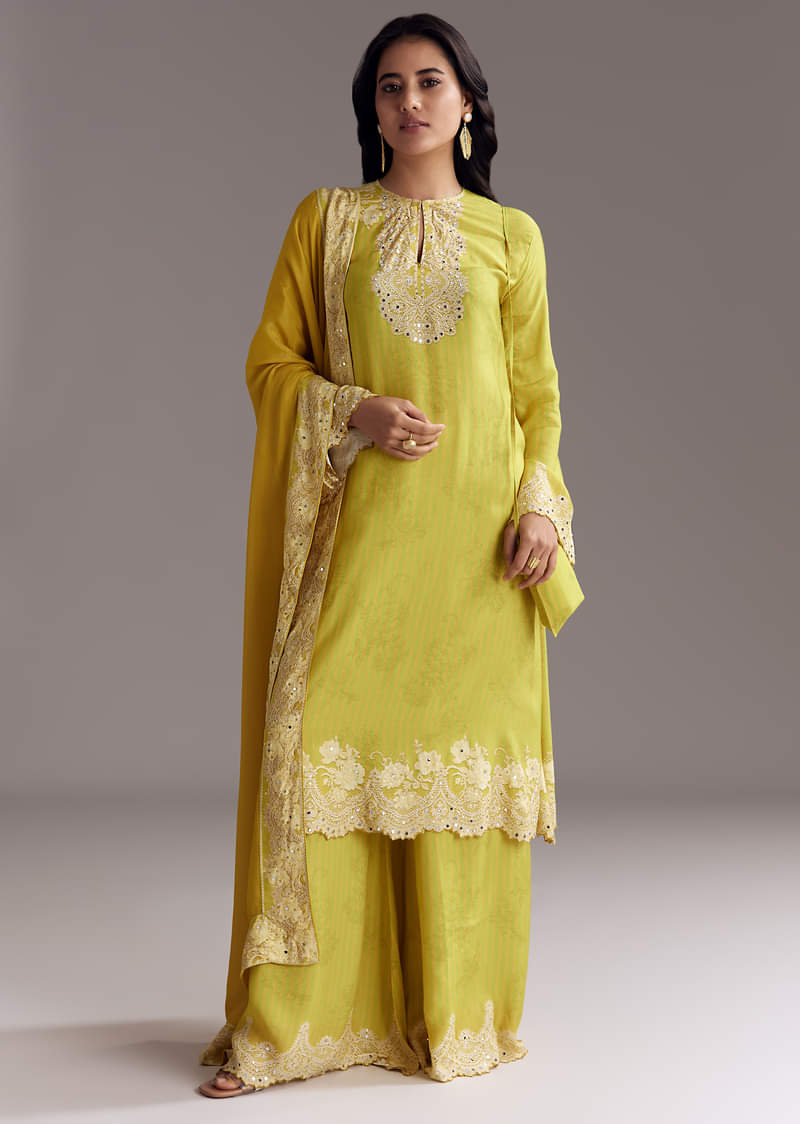 This kurta-palazzo-dupatta set in green muslin features vibrant floral and striped prints, adorned with subtle mirror embellishments. A perfect mix of color pop and modest grace. Awarded as the Most... More Product Details
