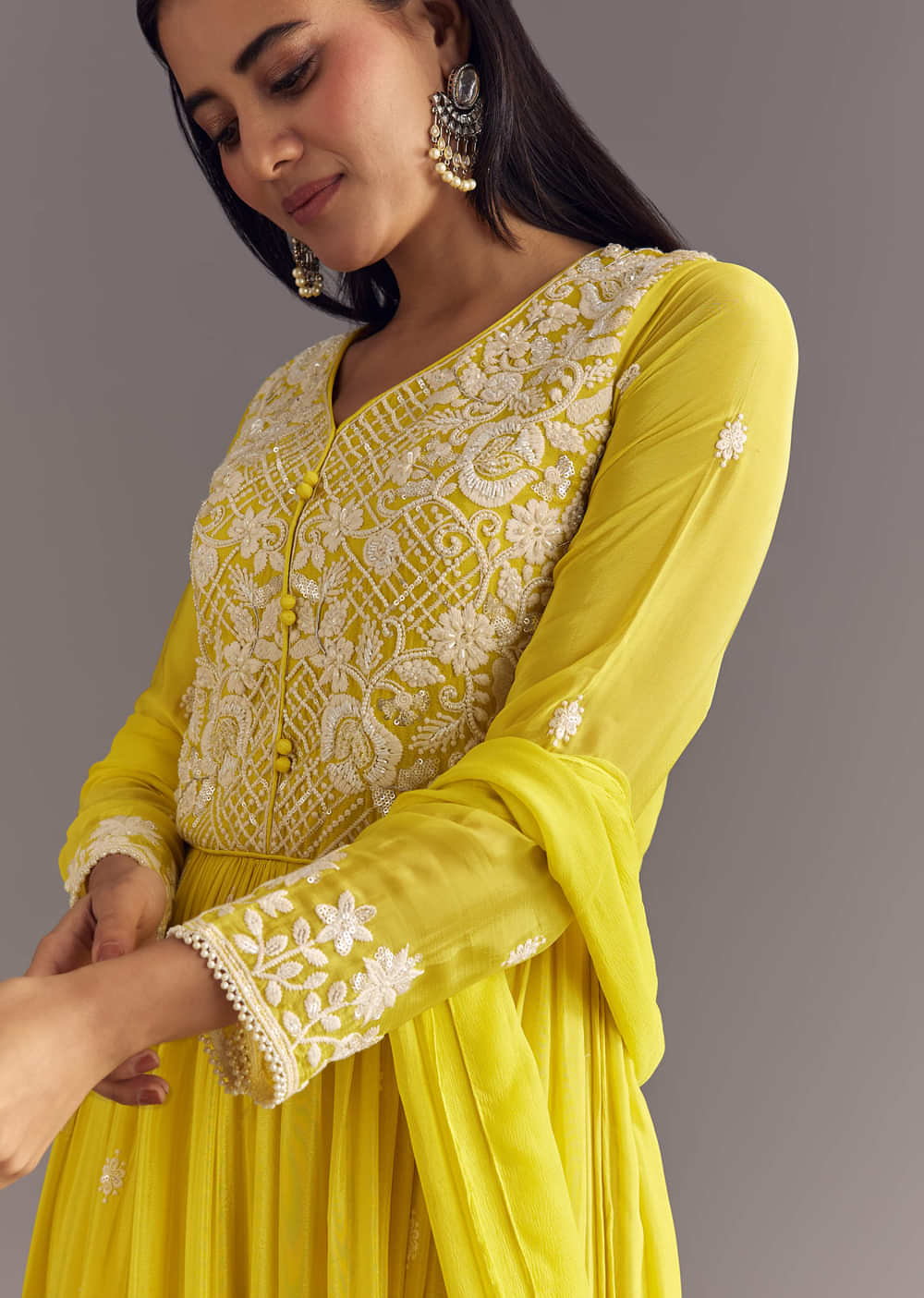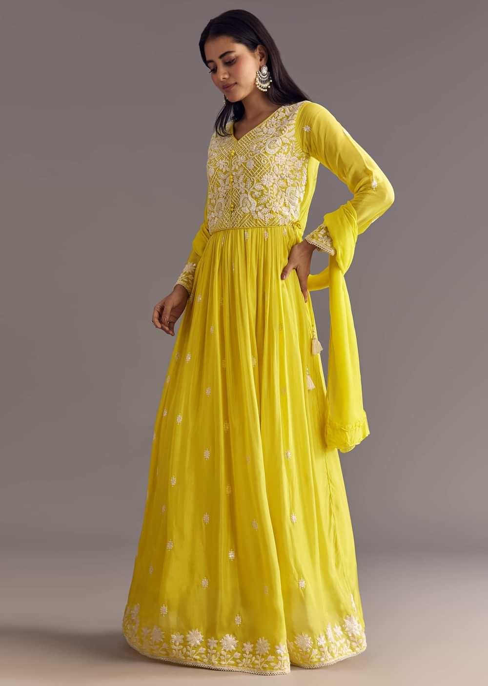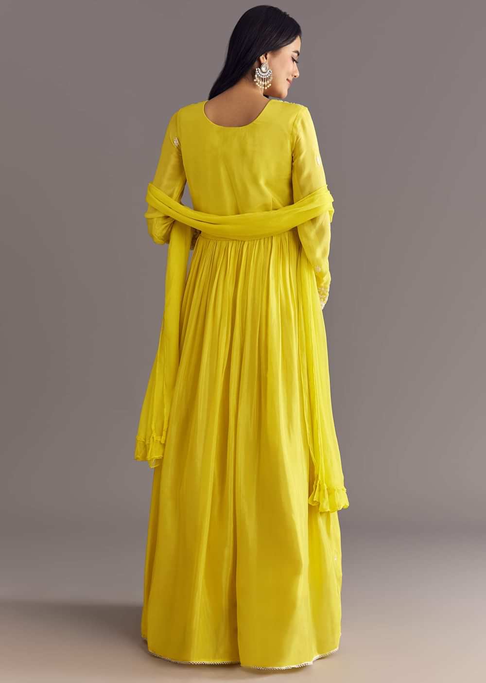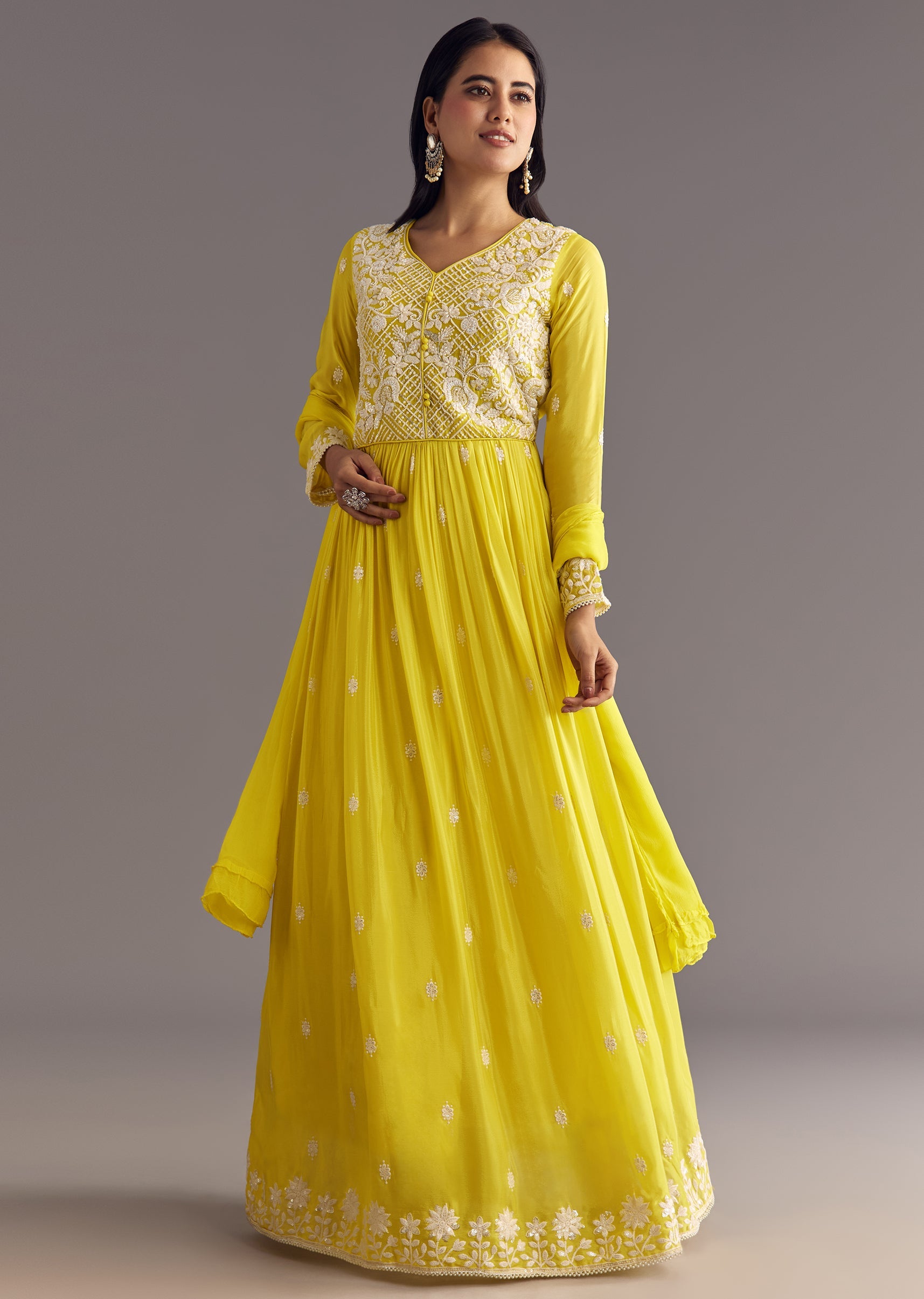Lemon yellow chinon anarkali embroidered with moti, thread, and sequins work flows like a ray of sunlight, lighting up haldi rituals with joyous charm. Standard Length for the Anarkali is... More Product Details
