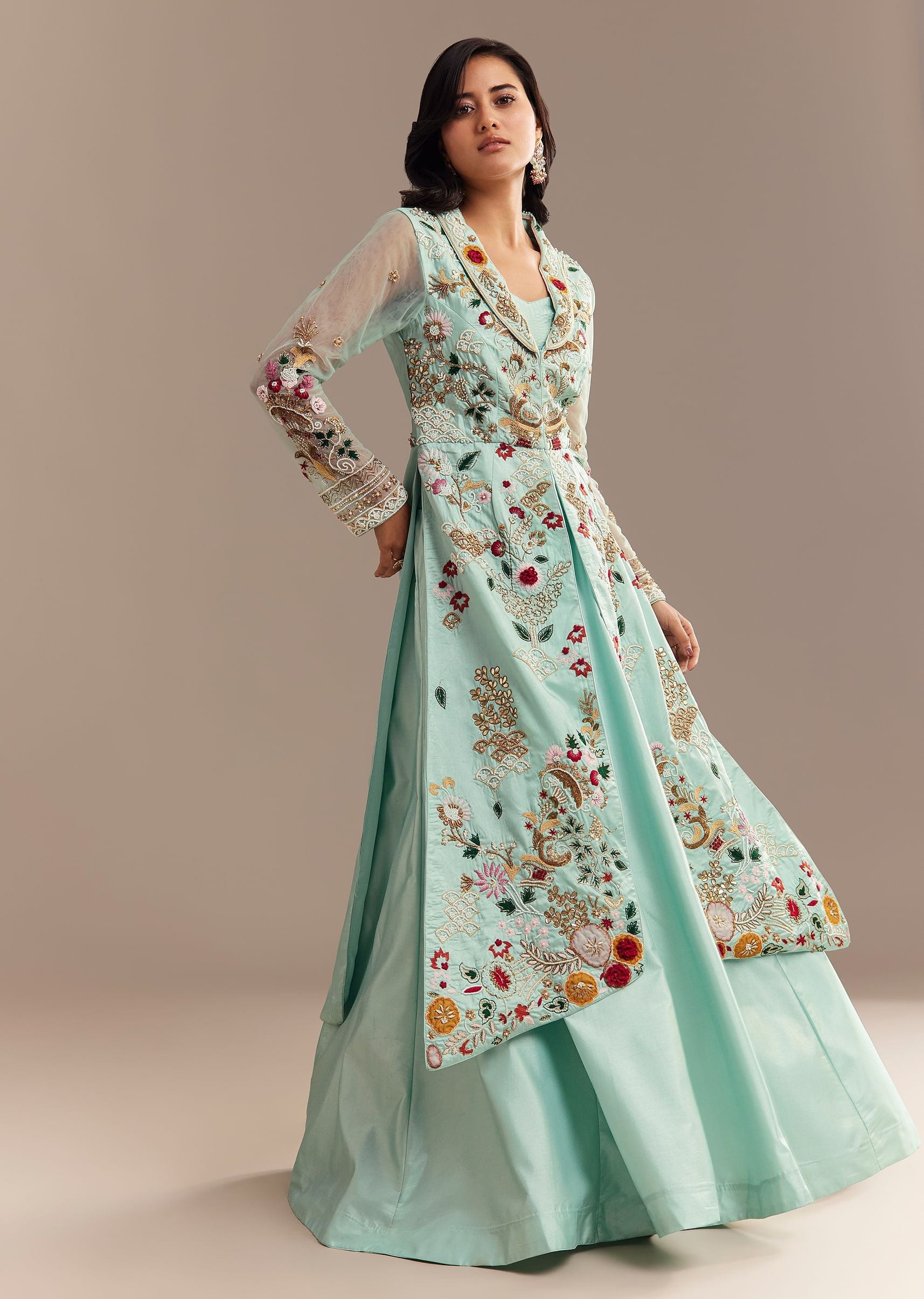 Embrace regal charm with this Light Aqua Blue Zardosi Embroidered Jacket Lehenga Set. The elegant crop top is adorned with delicate zari thread work exuding subtle grace. Paired with a stunning sideslit long jacket intricately embellished with moti beads and zardosi work this ensemble radiates opulence and grandeur. Flowing over a voluminous silk lehenga this set is perfect for mehendi and sangeet celebrations effortlessly blending traditional luxury with contemporary style.Awarded As The Most Trusted Brand We'Re Delivering Styles You Love Just As Promised.