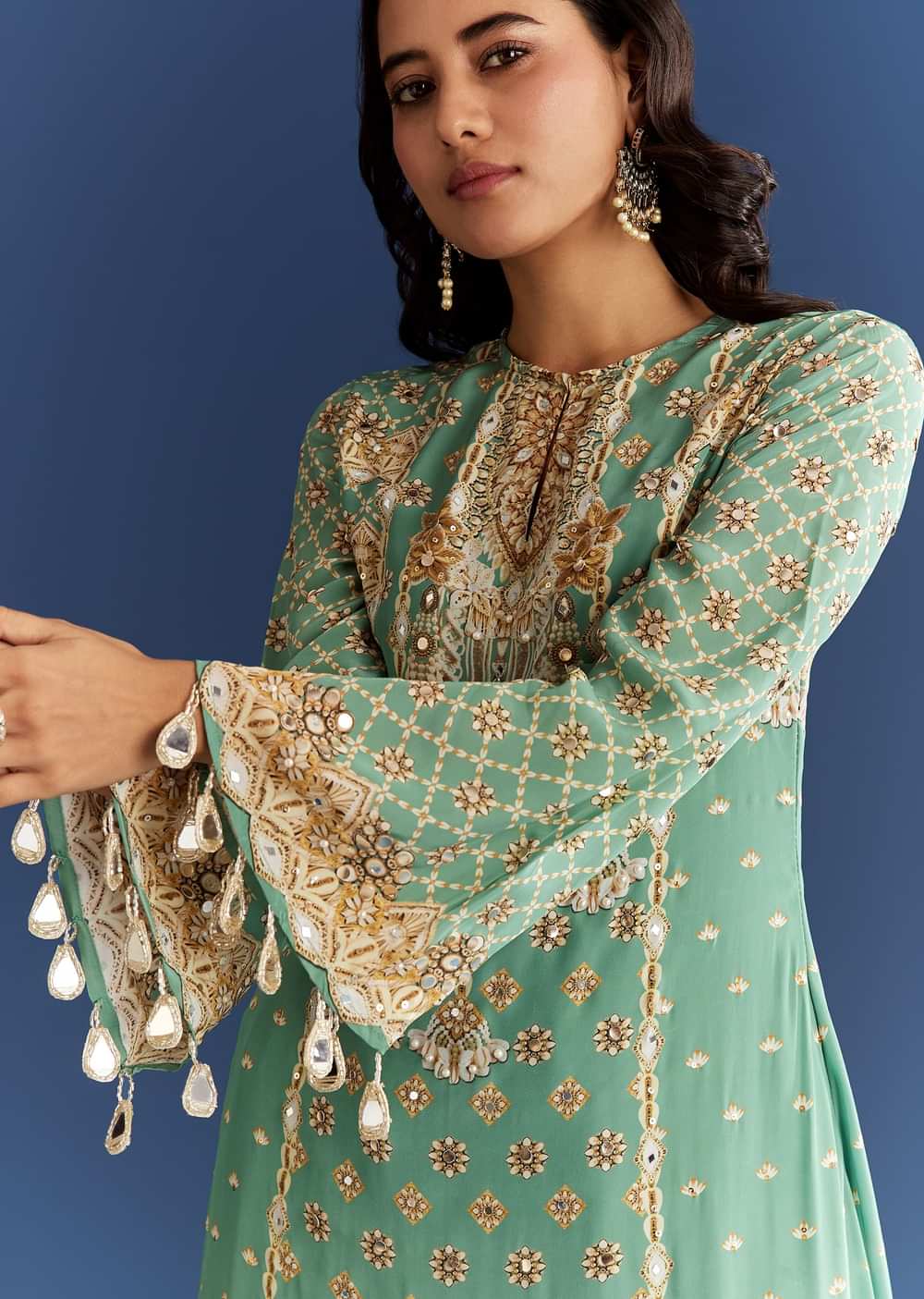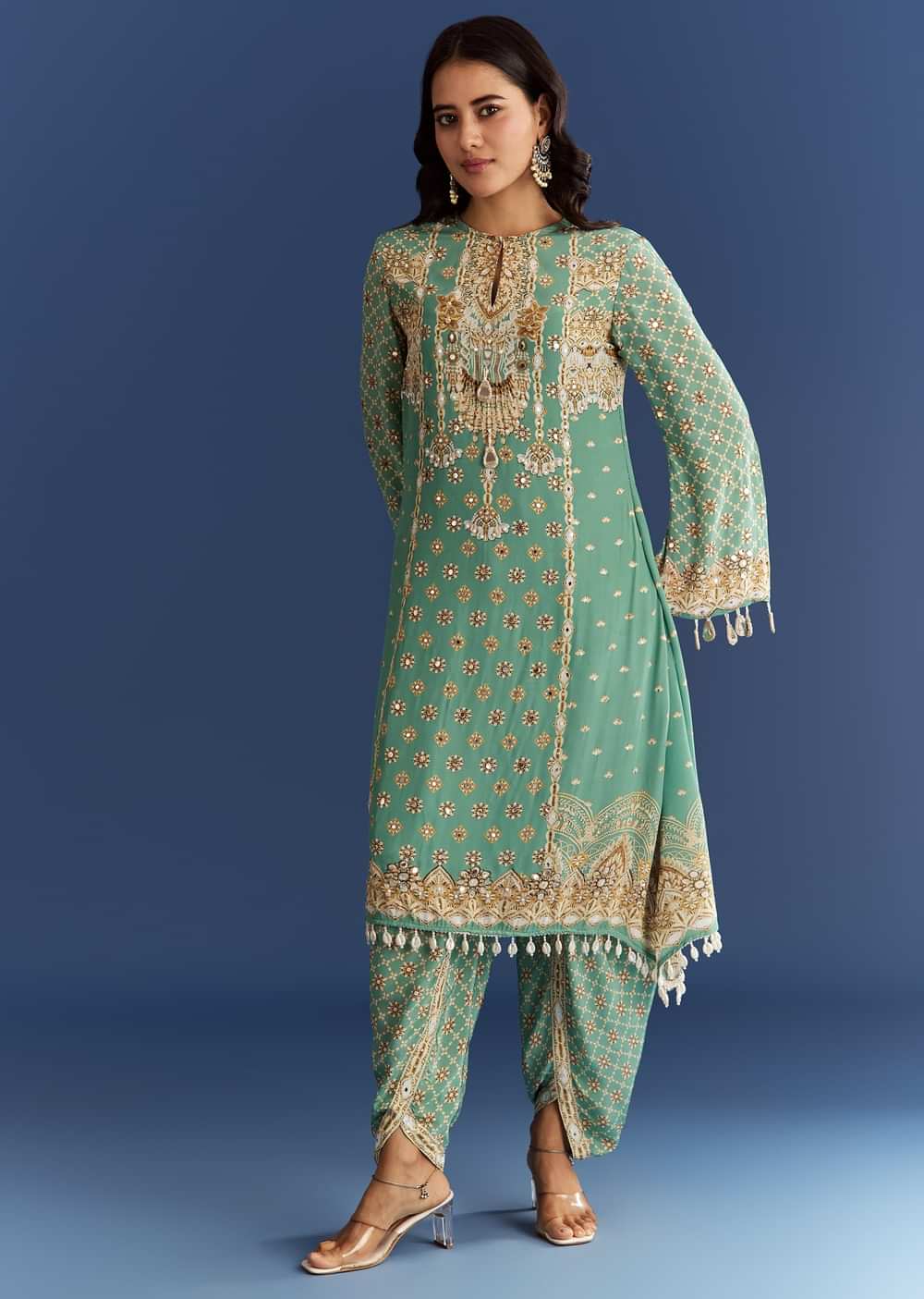 Draped in festive aqua, this crepe kurta with moti, mirror, and sequins work pairs perfectly with a printed dhoti—elevated with ease.