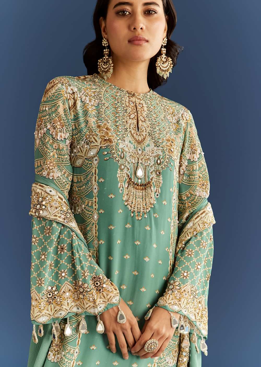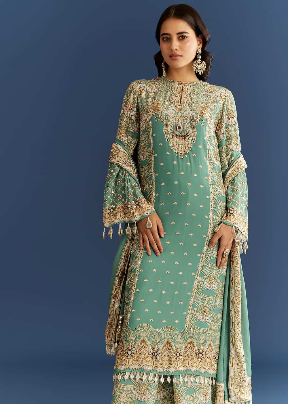 Crepe kurta in aqua green adorned with moti, mirror and sequins work, paired with a matching printed palazzo—effortless sparkle.