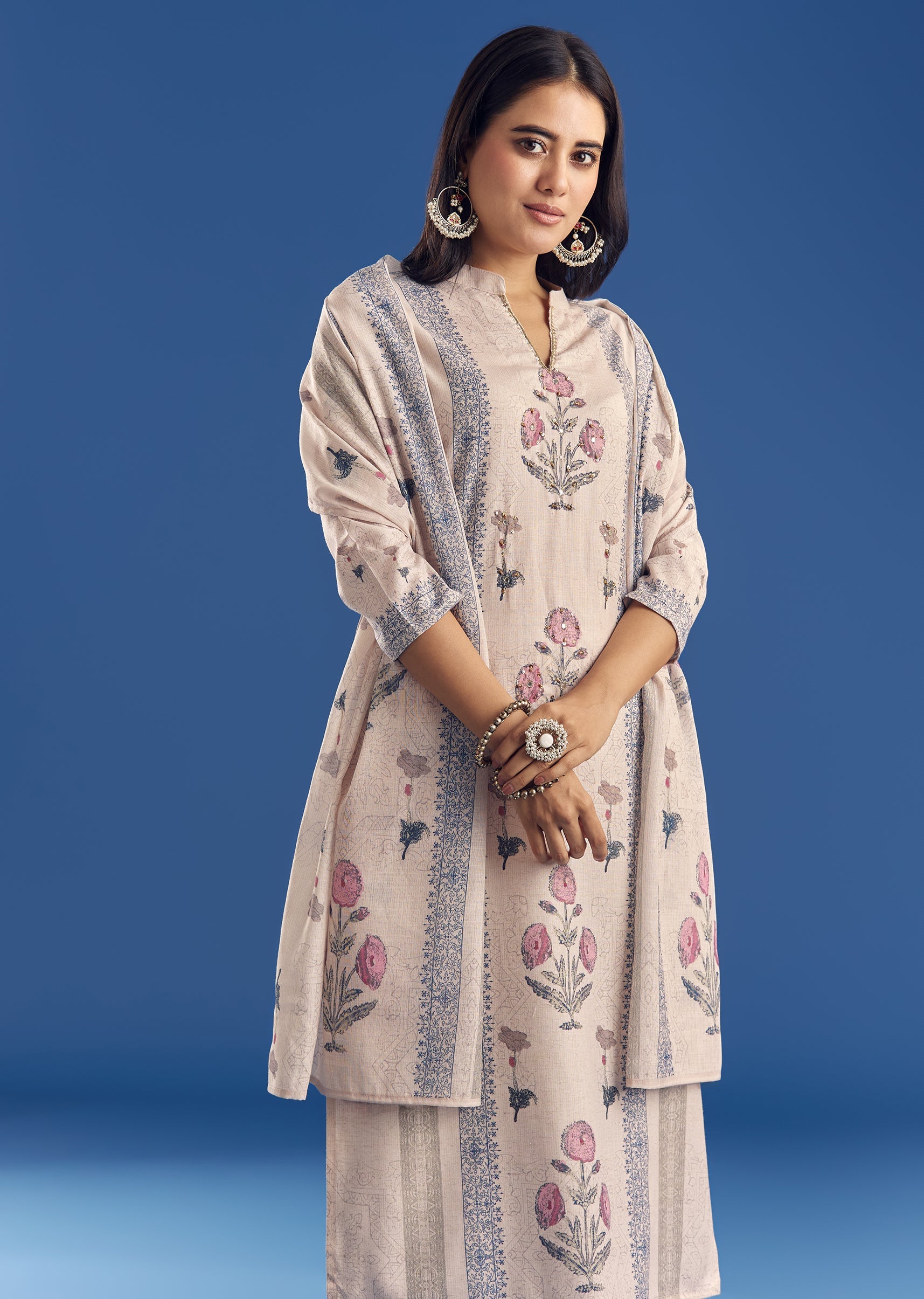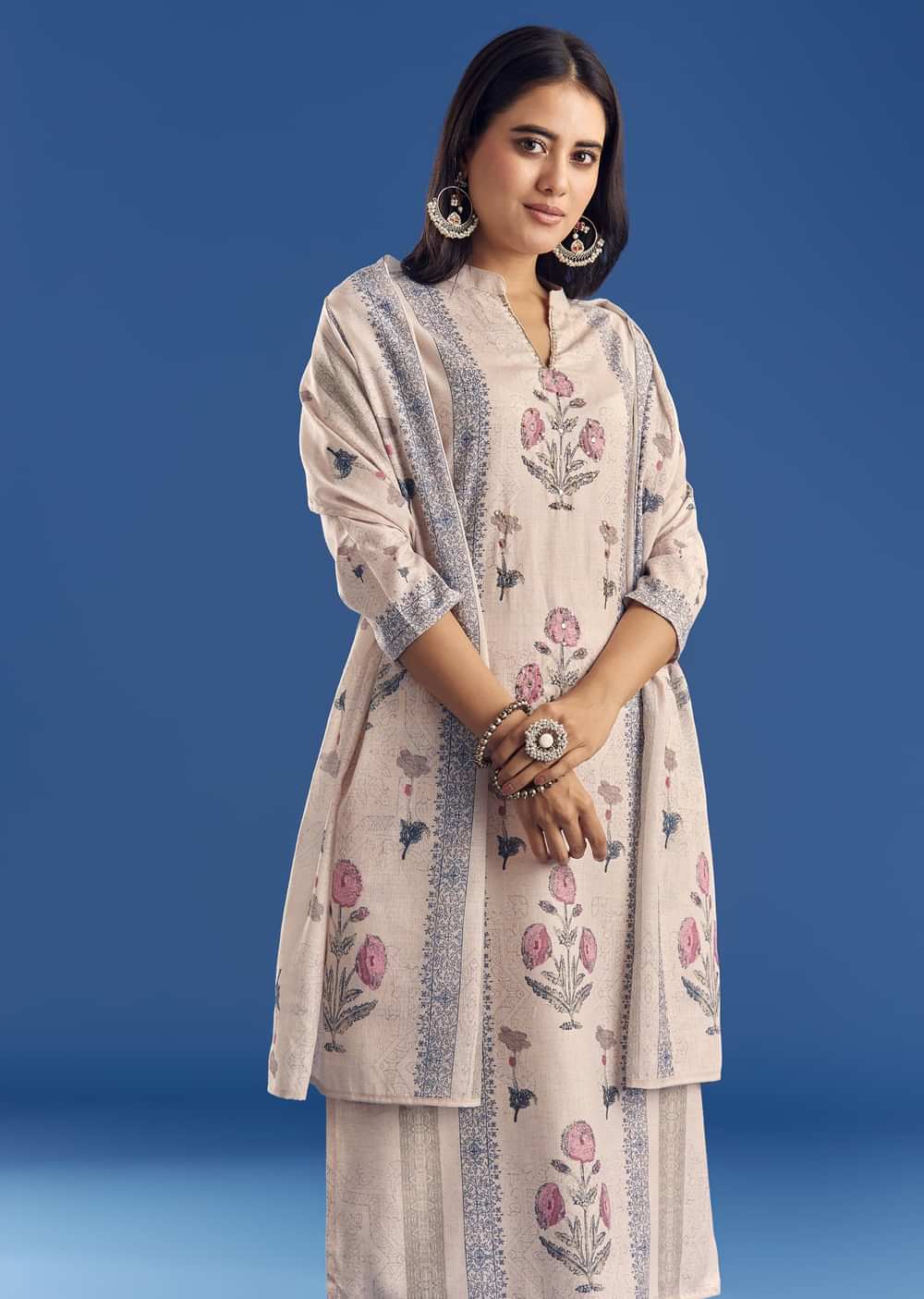 In light beige cotton, this block printed kurta blooms with mirror and sequins work, styled with a matching printed pant and dupatta for pooja-ready charm. Awarded as the Most Trusted... More Product Details
