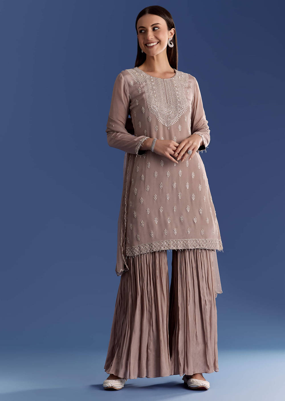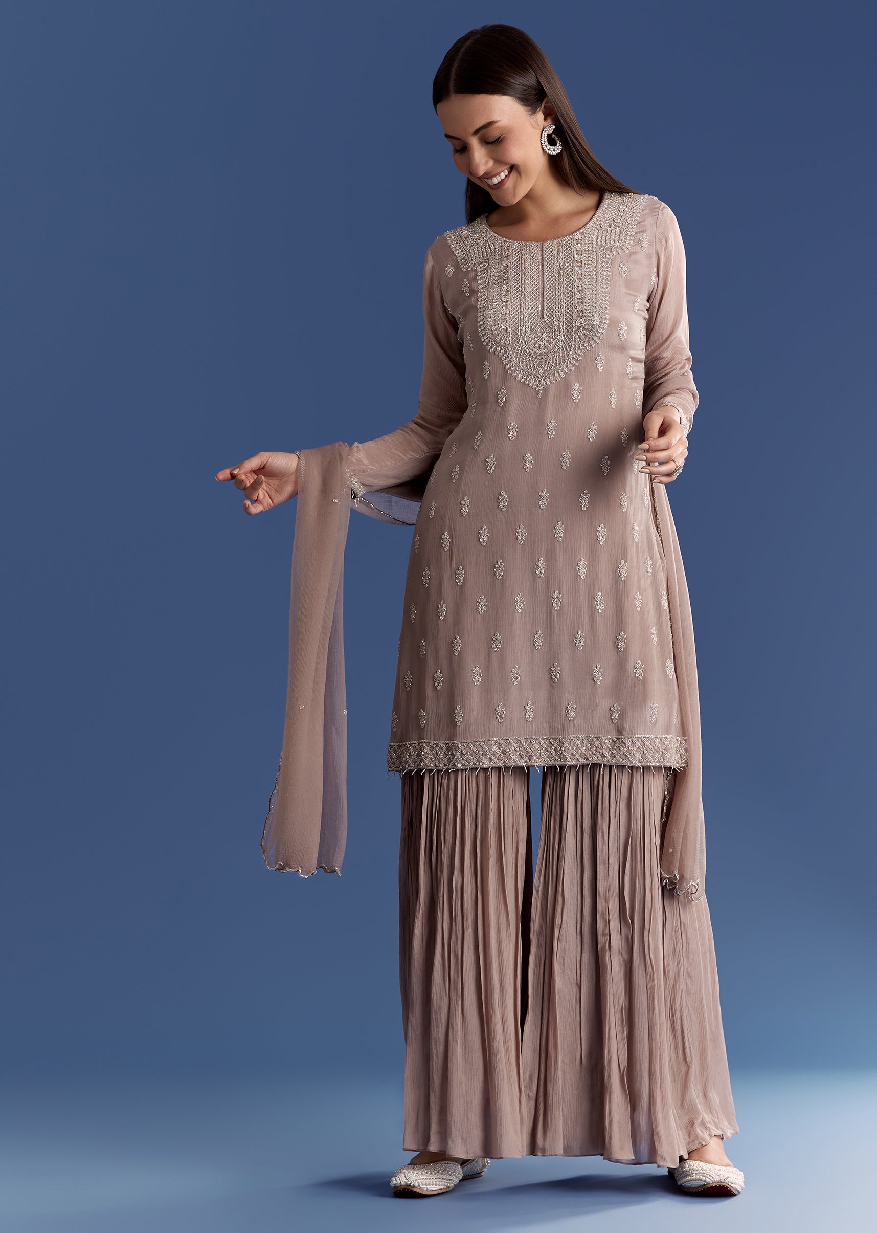 In light beige tones, this chinon kurta is enhanced with cut dana and sequins embroidery, styled with a matching dupatta and flared sharara that sways with ease. Standard length of... More Product Details