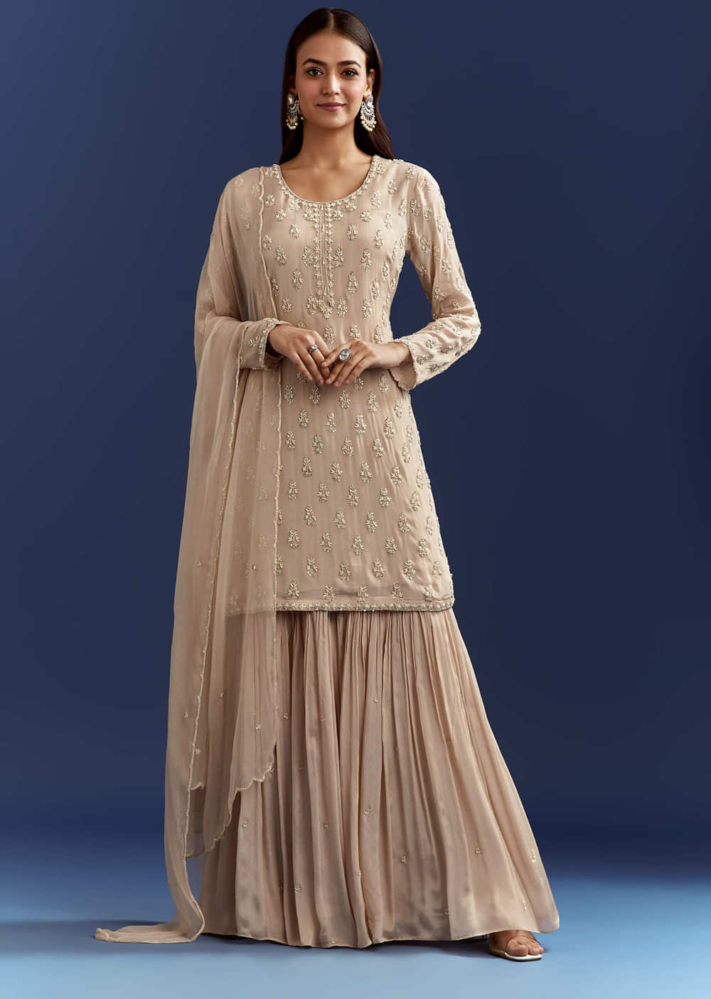 Light Beige Moti And Cutdana Kurta Dupatta With Moti Butti Sharara