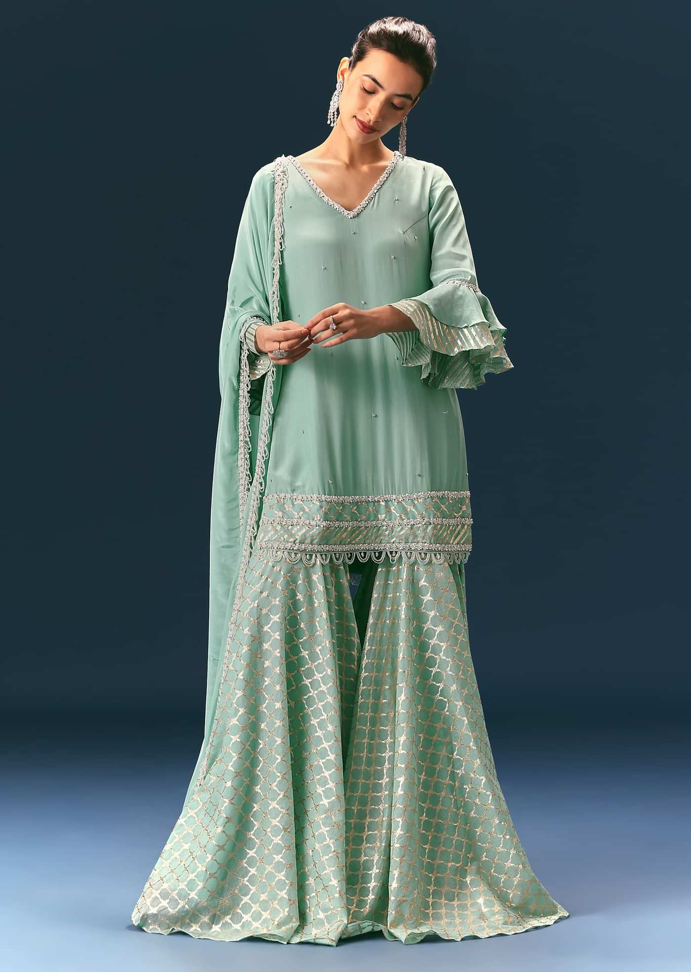 Reflecting the magnificence of detailed craftsmanship this aqua blue sharara set is designed for the fashionistas who love to stand out. The mesmerising outfit is enhanced with handwork embroidery featuring... More Product Details