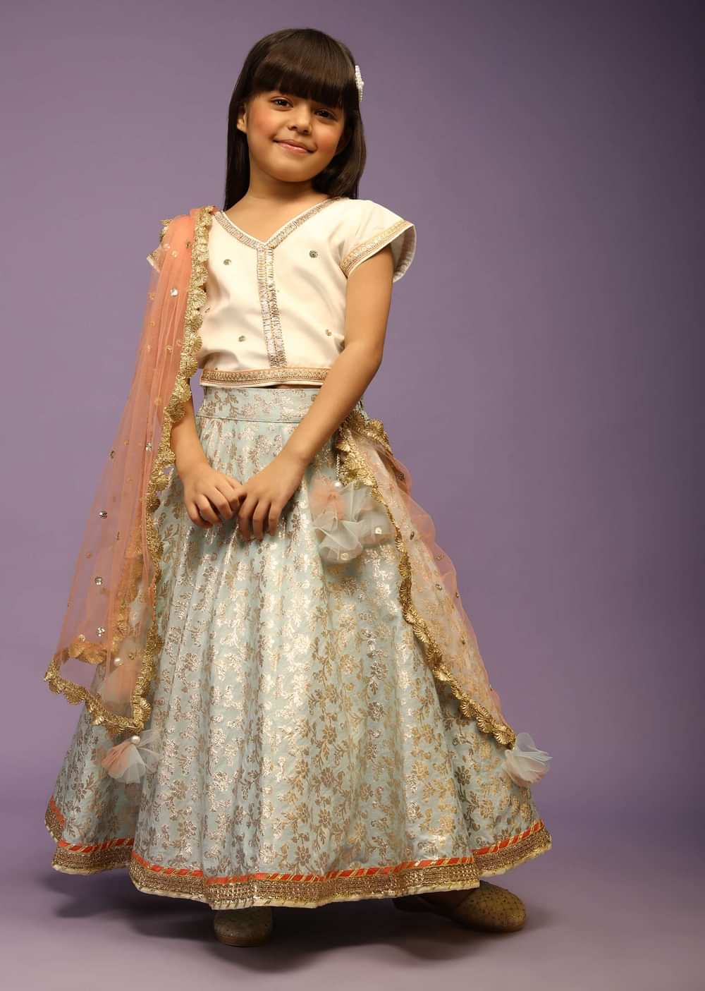 Kalki Girls Light Blue Lehenga In Brocade Silk With Weaved Floral Jaal And Off White Choli