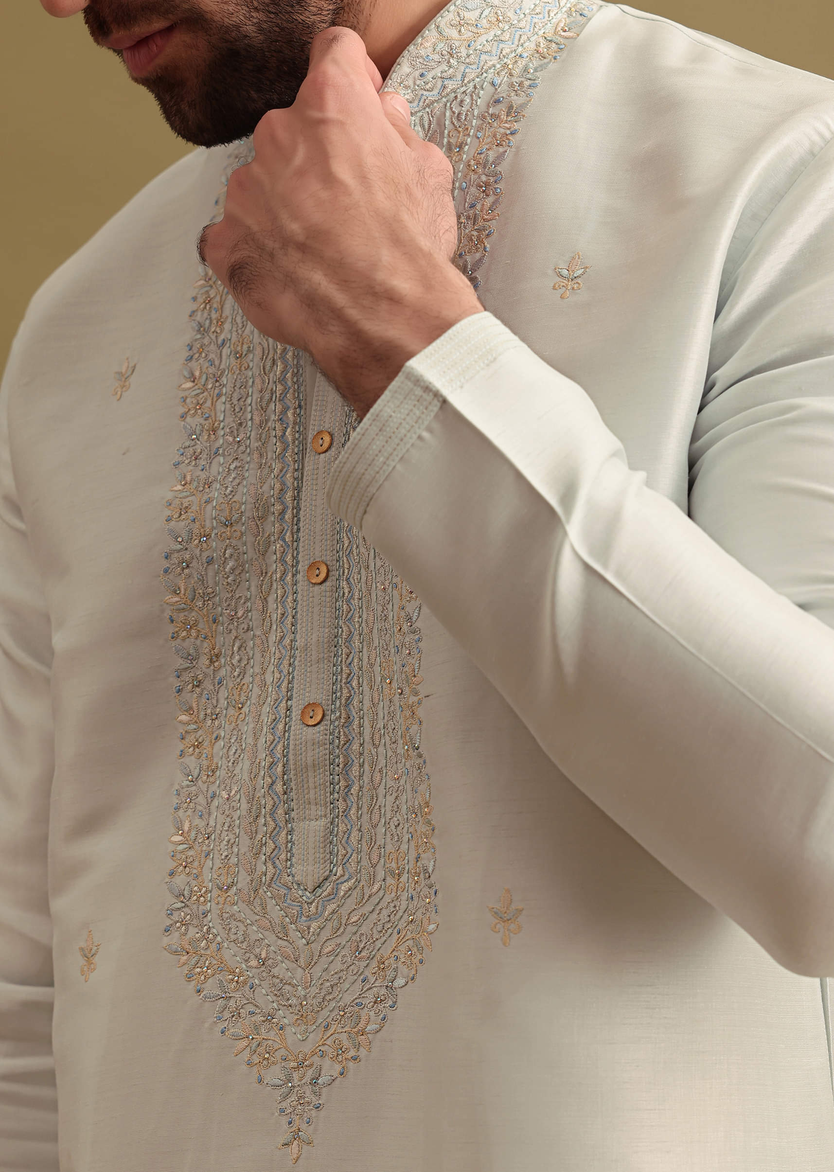 Unveil grace with our light blue kurta set, featuring stunning resham embroidery. The luxurious blue silk cascades effortlessly, while the detailed resham work adds a royal touch. Ideal for festive celebrations. The kurta is paired with pants. Button design, shape, and size may vary as per availability. Awarded as the Most Trusted Brand, we're delivering styles you love, just as promised.