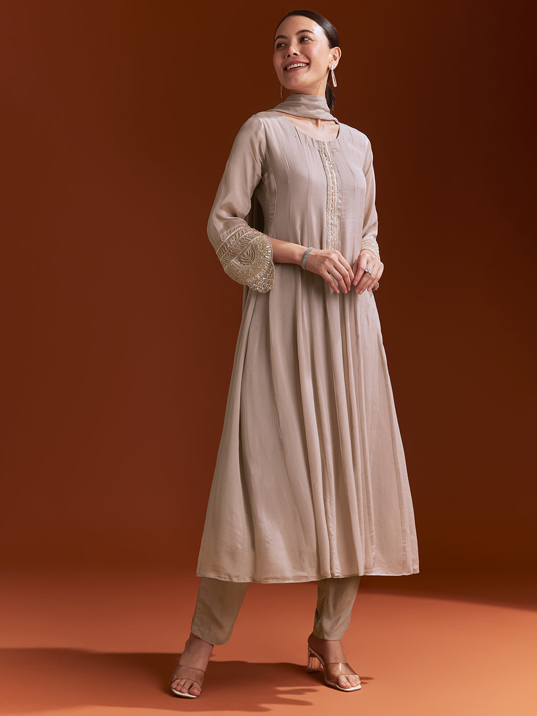 Light Brown Chinon Anarkali Suit With Moti And Zardosi Work