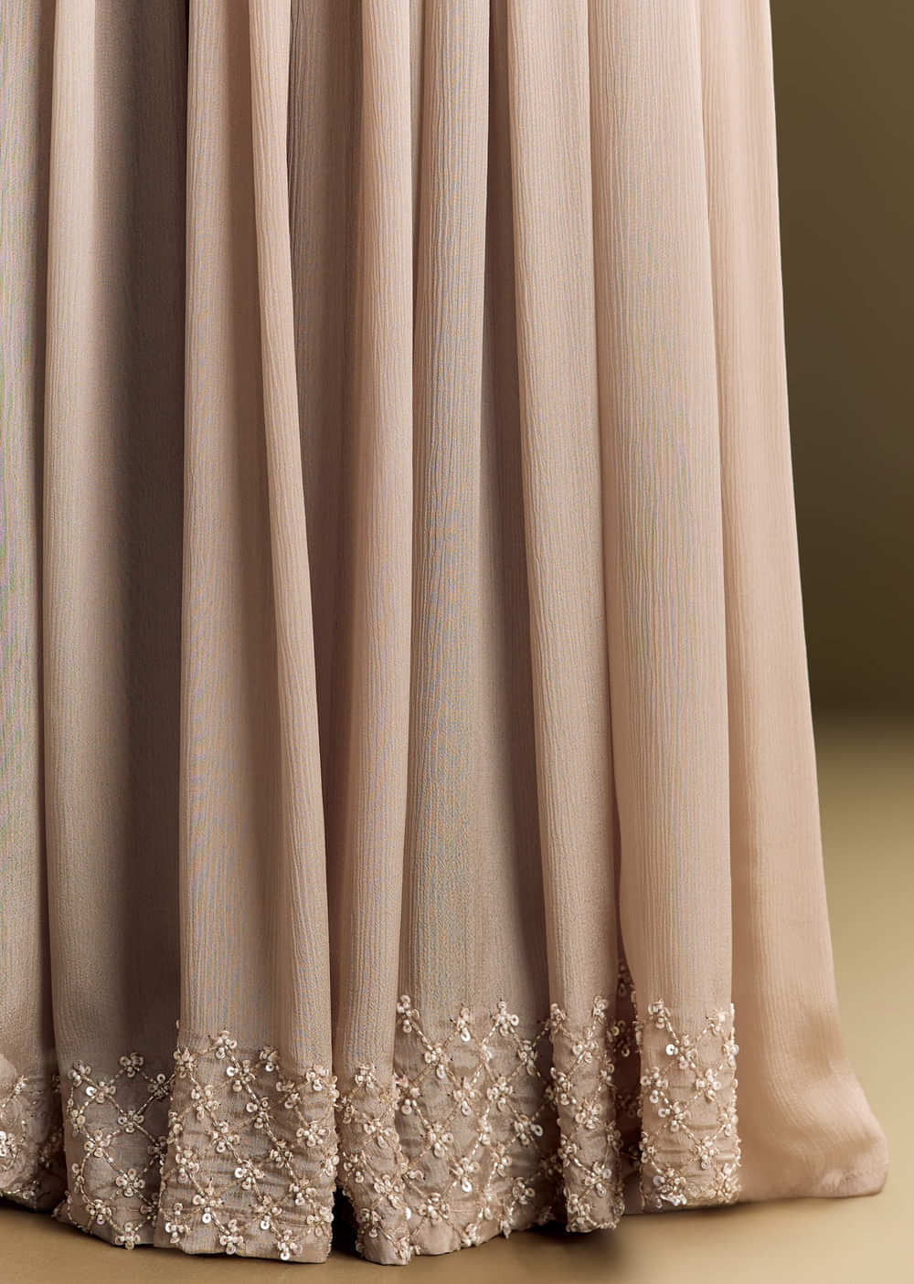 Light brown festive kurta set detailed with sequins and cut dana, paired with a sparkling dupatta and delicately embellished palazzo border. Standard length of Palazzo is 40" Awarded as the... More Product Details
