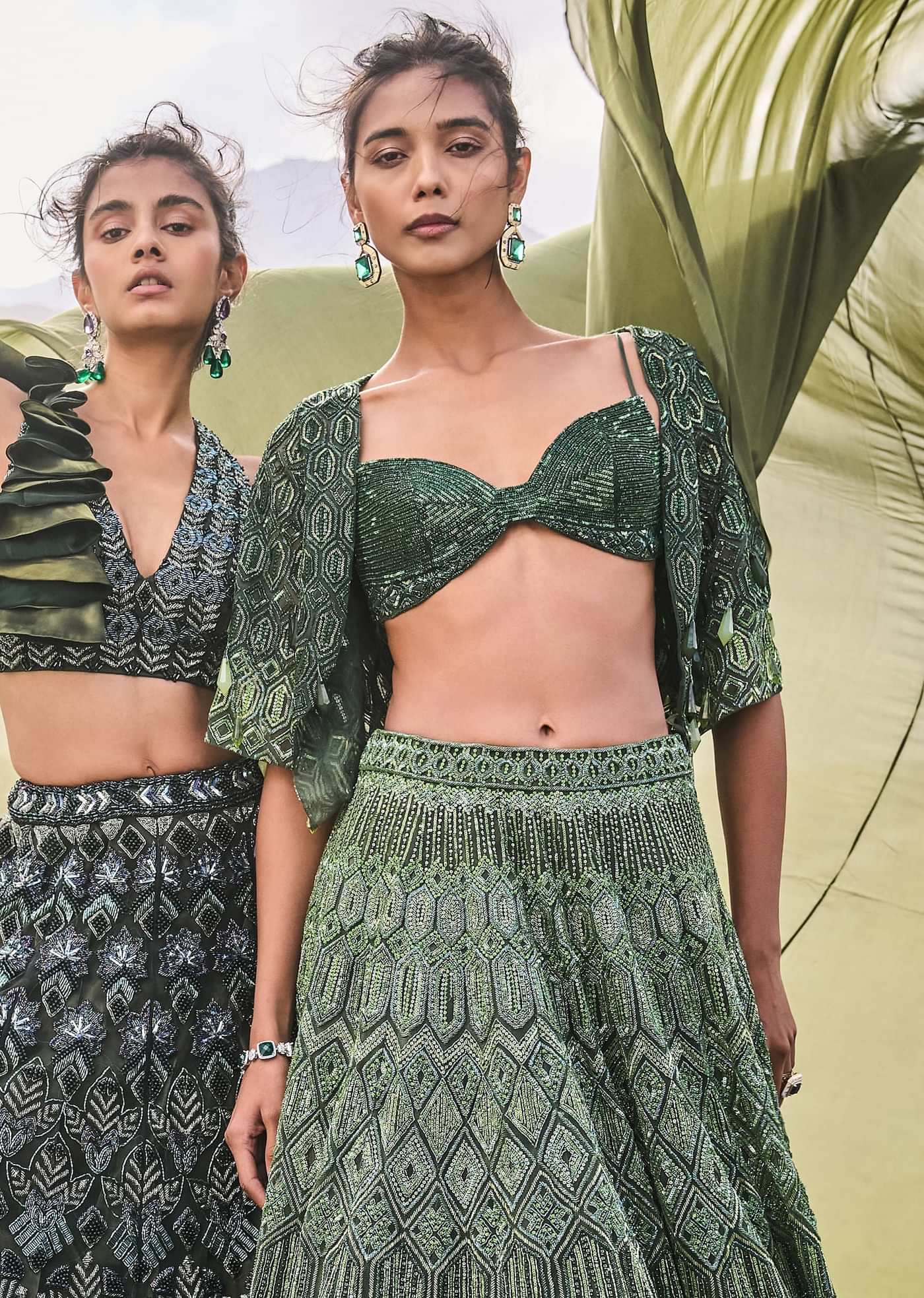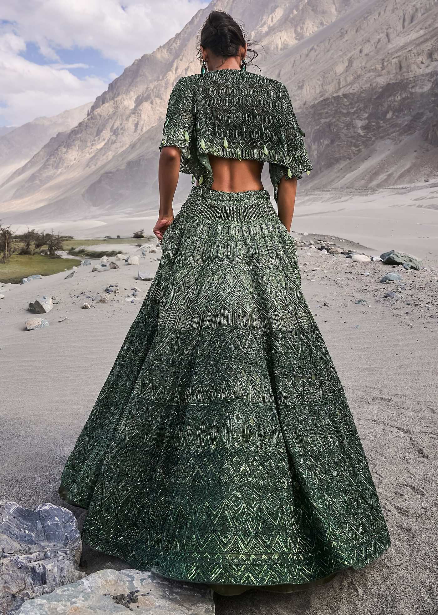 Emerald Green Heavy Crystal Cut Embroidered Lehenga With Cape