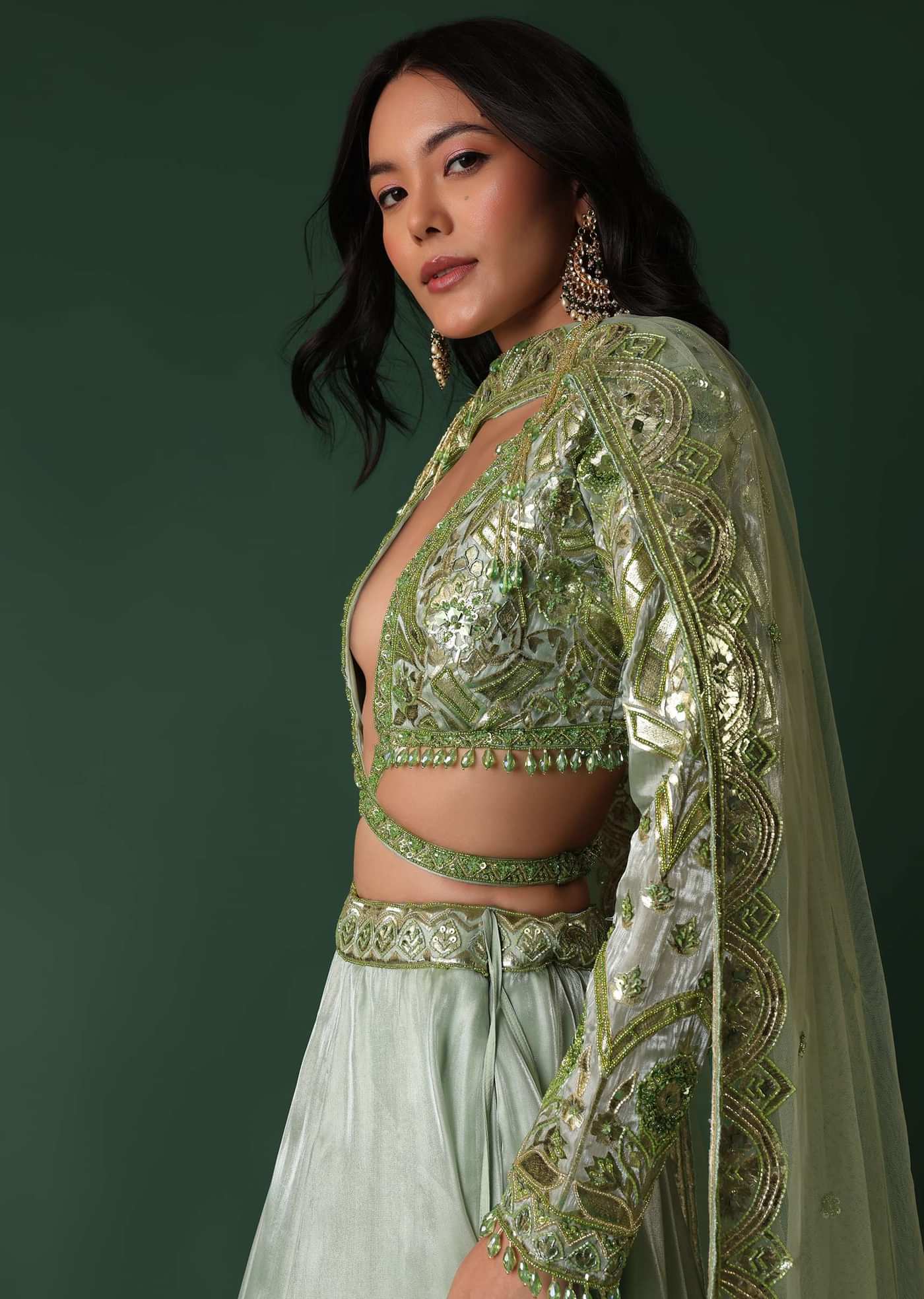 Light Green Foil Printed Bridal Lehenga And Blouse In Organza