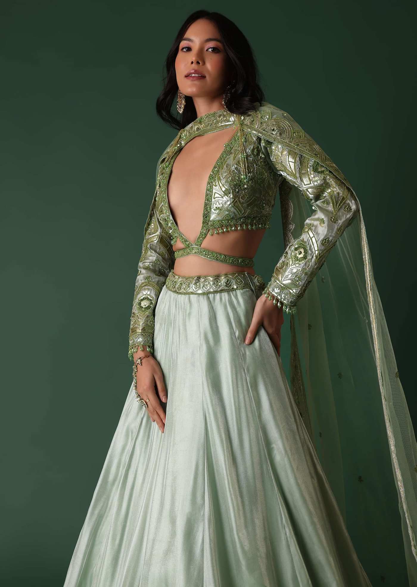Elevate your style with our luxurious light green foil-printed bridal lehenga and blouse in organza.Adorned with intricate cutdana and bead embroidery this lehenga set exudes a regal charm that will... More Product Details