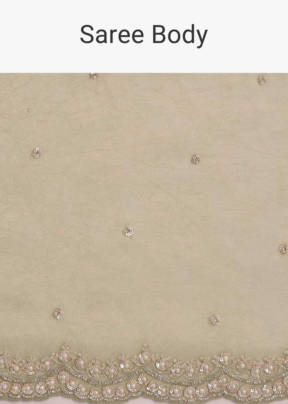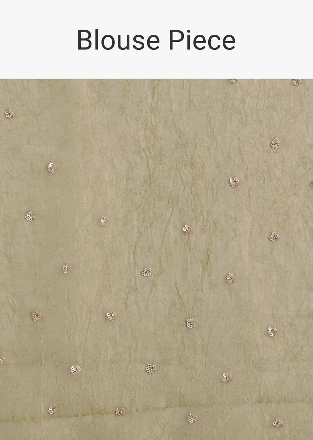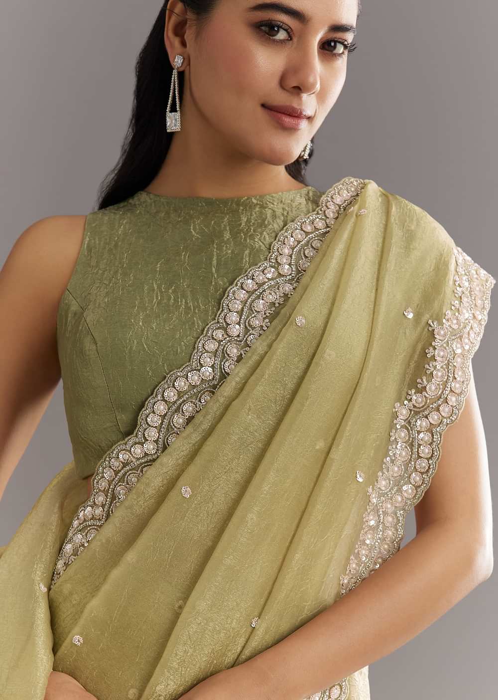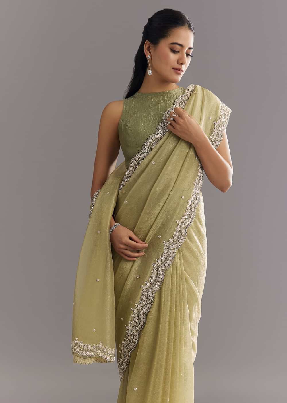 Light Green Glossy Crushed Tissue Saree With Cutdana Sequins Embroidery And Scallop Border