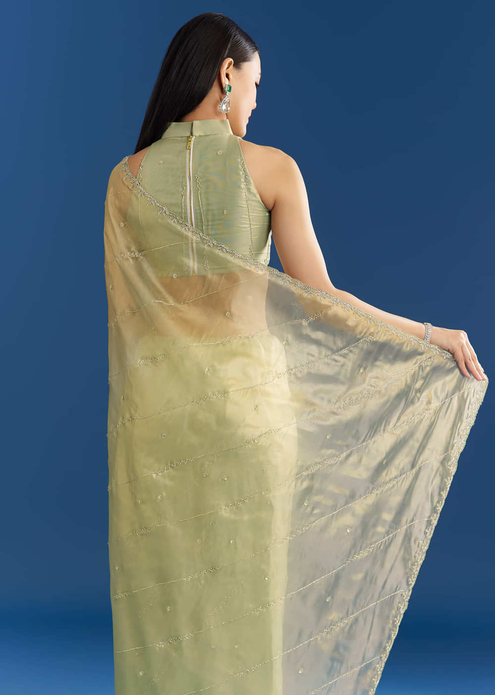 Light green organza with soft shimmer and intricate bead and cutdana scallops makes this saree feel like a meadow in bloom. Awarded as the Most Trusted Brand, we're delivering styles... More Product Details