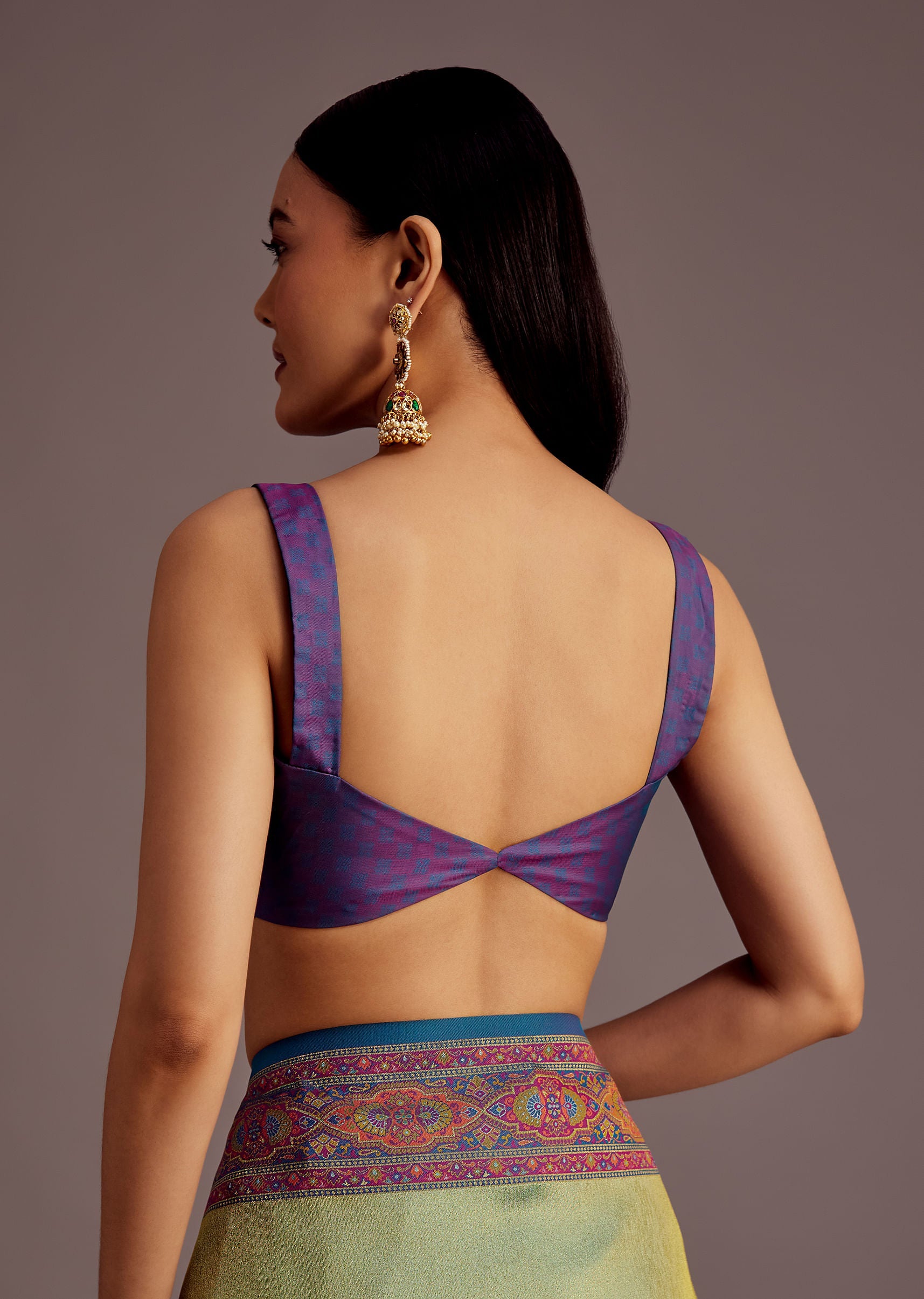 Pair with gold temple jewelry, a sleek bun, and bold kohl eyes for a regal and traditional look.