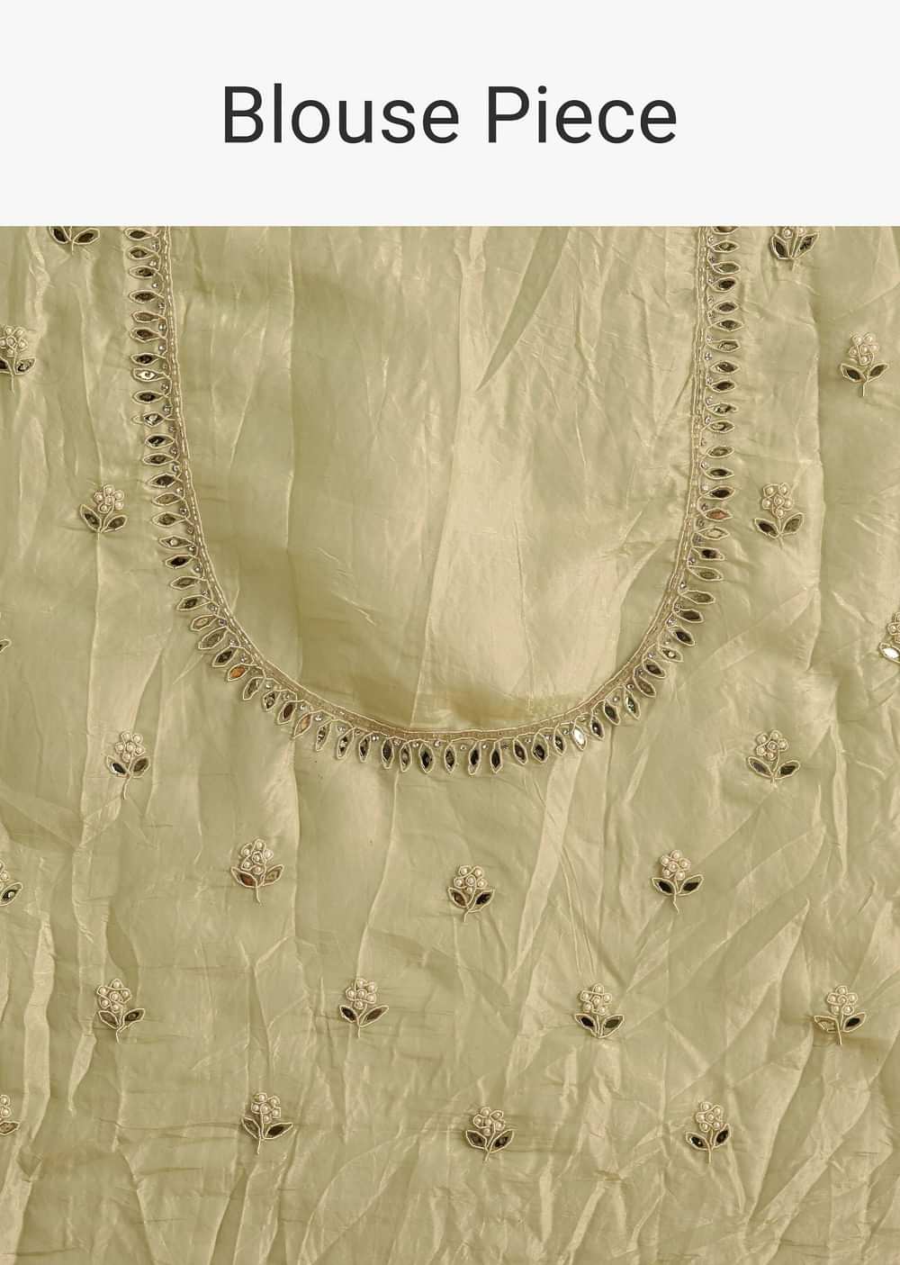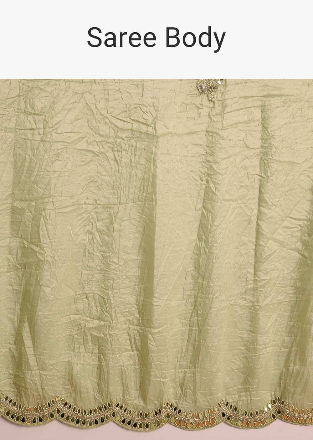 Emanating an aura of regal splendor, this light green tissue saree is a celebration of heritage. Embroidered with zardozi, gota patti, and cutdana, its scallop border adds the perfect touch... More Product Details