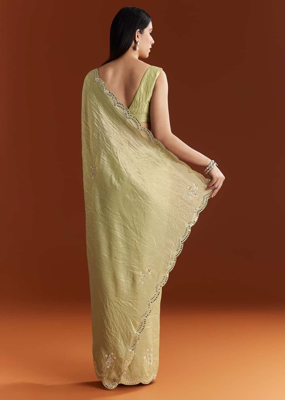 Emanating an aura of regal splendor, this light green tissue saree is a celebration of heritage. Embroidered with zardozi, gota patti, and cutdana, its scallop border adds the perfect touch of grandeur, making it ideal for weddings and festive occasions. Awarded as the Most Trusted Brand, we're delivering styles you love, just as promised.