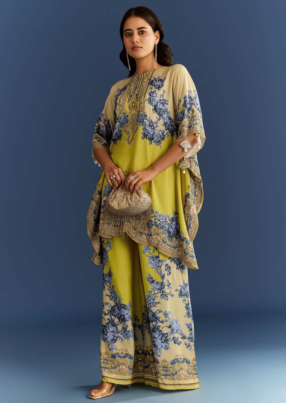 Soft lime green tones elevate this floral printed kaftaan and palazzo set with sequins work—crafted for elegance that flows.