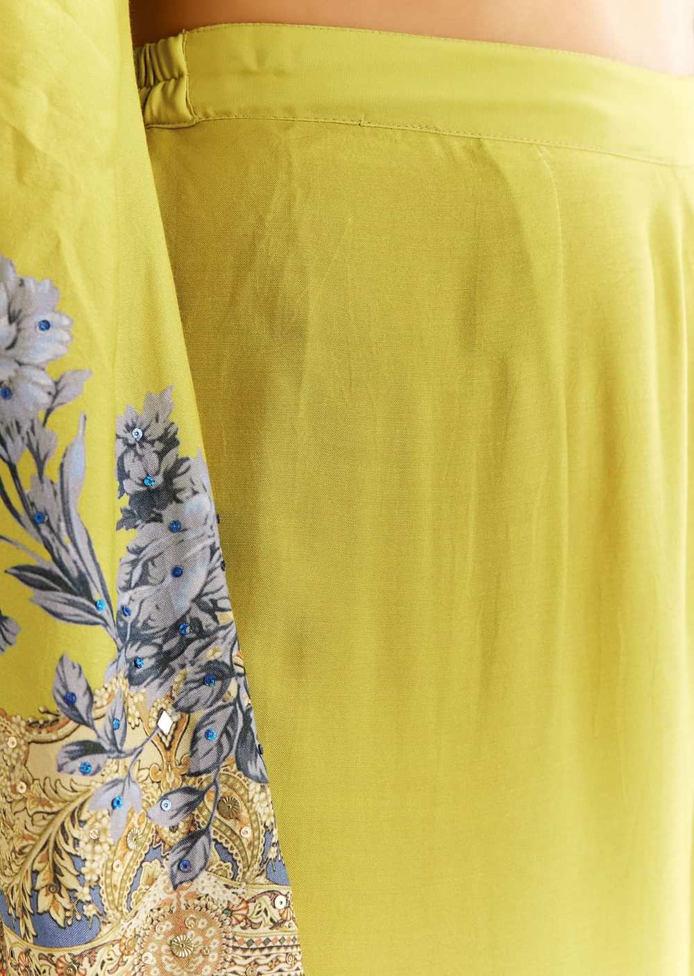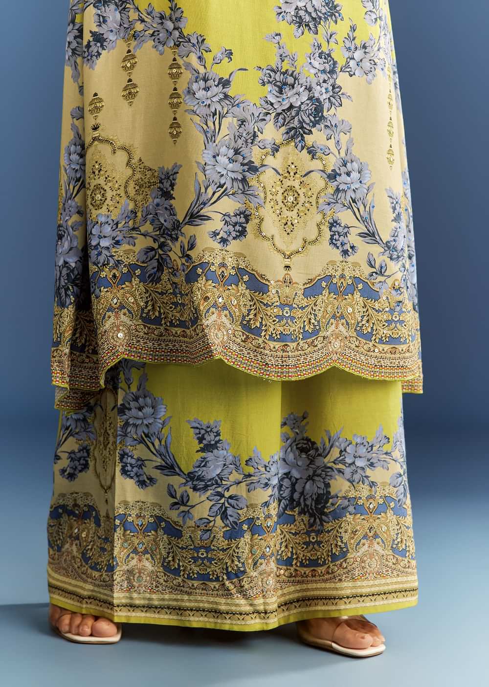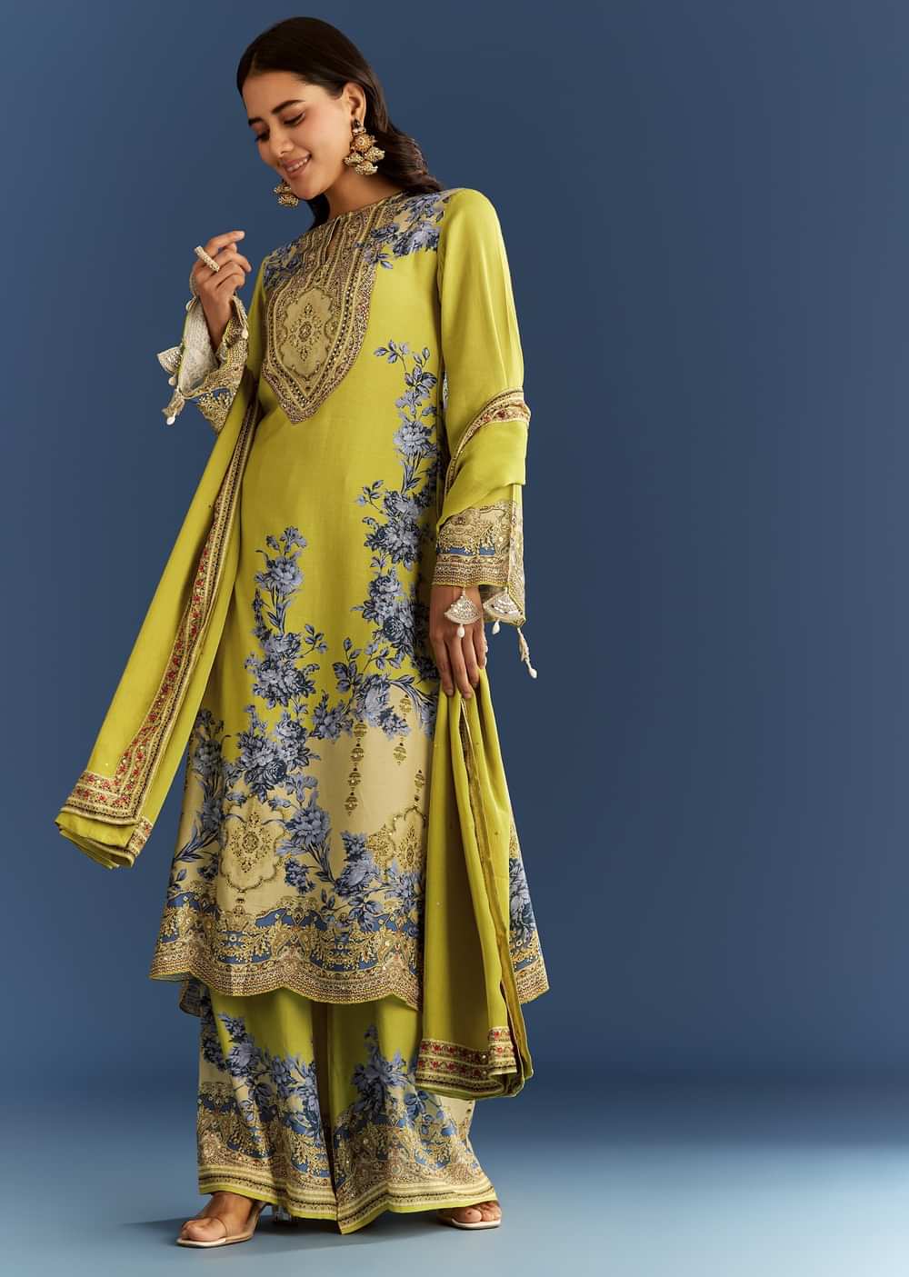 This three-piece ensemble in lime green blends floral prints and sequins on the kurta and palazzo, finished with a light chinon dupatta—delicate and festive.