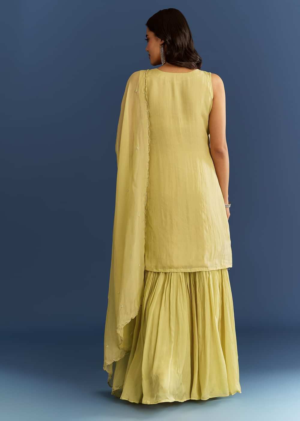 Lime green organza flows around a kurta enriched with moti, sequins, and cut dana, matched with a scallop-hemmed dupatta—light meets luxe.