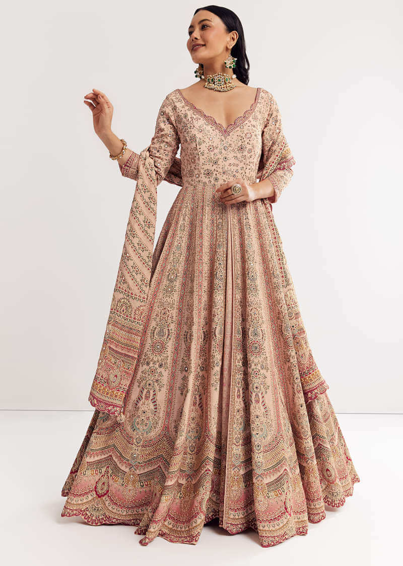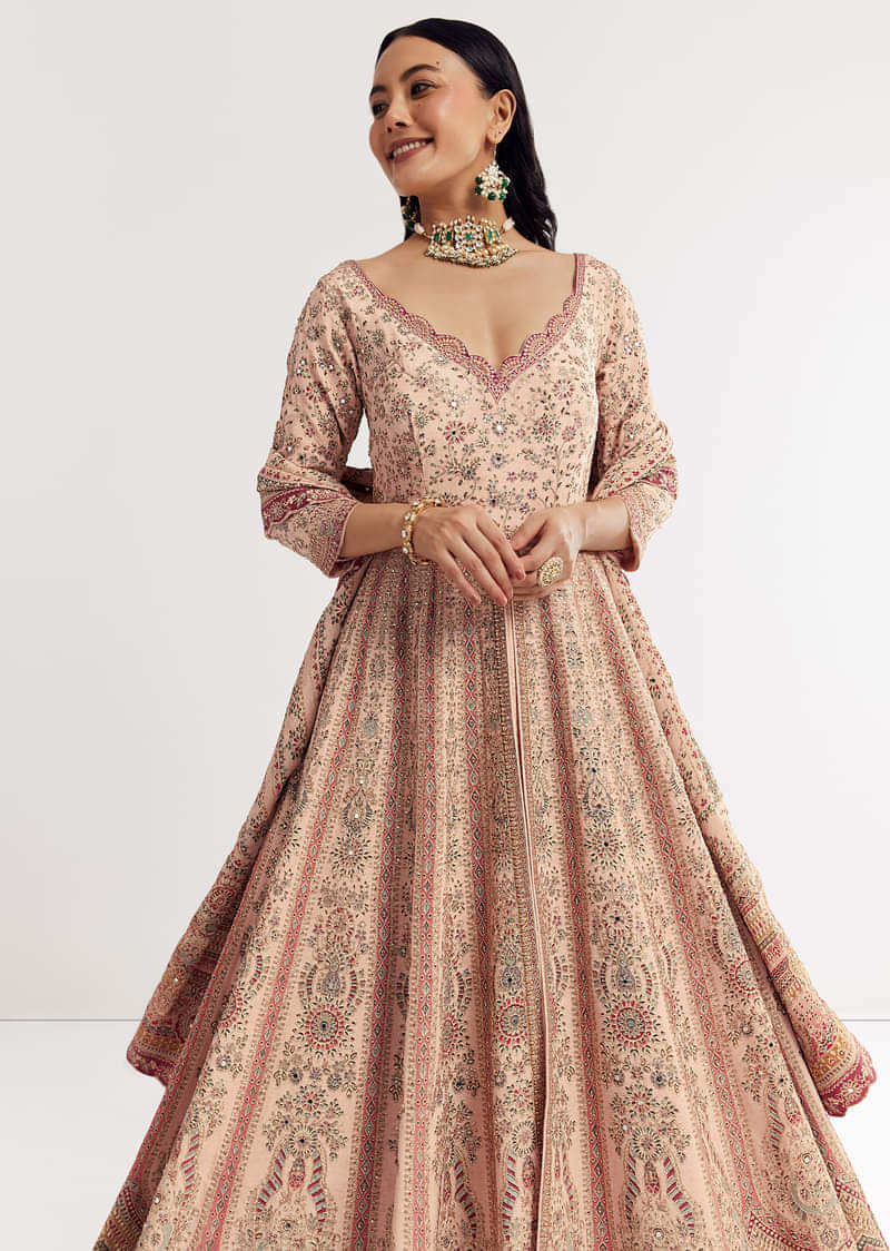 Light Peach Printed Crepe Anarkali Suit With Embroidery