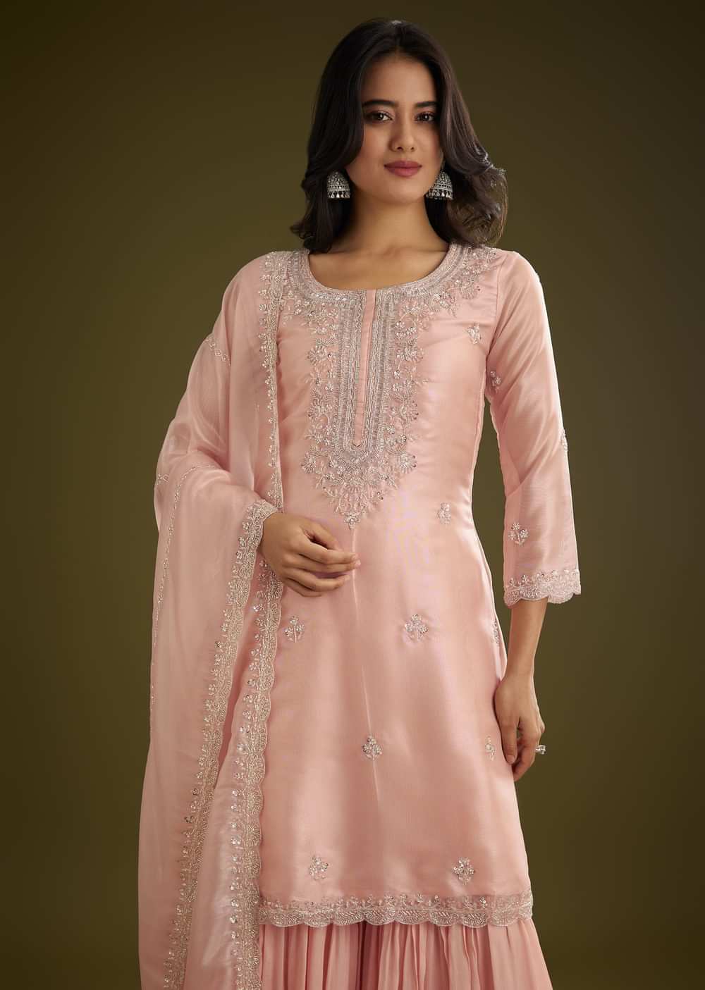 Light Peach Tissue Cut Dana Beads Kurta Set With Embroidered Dupatta