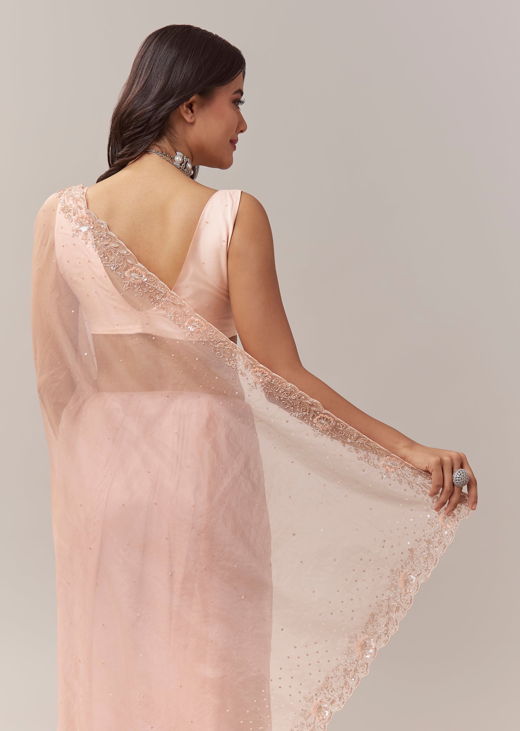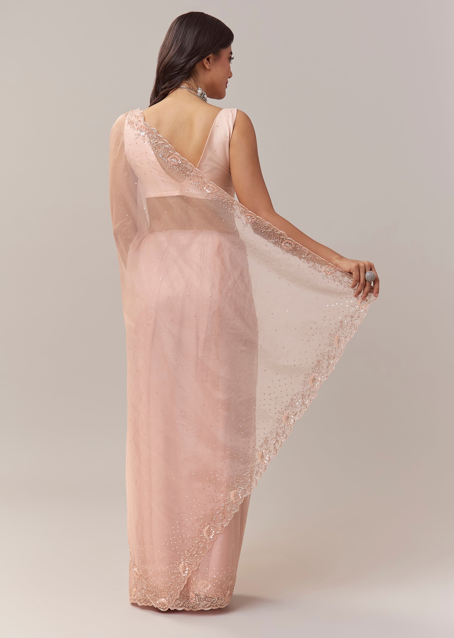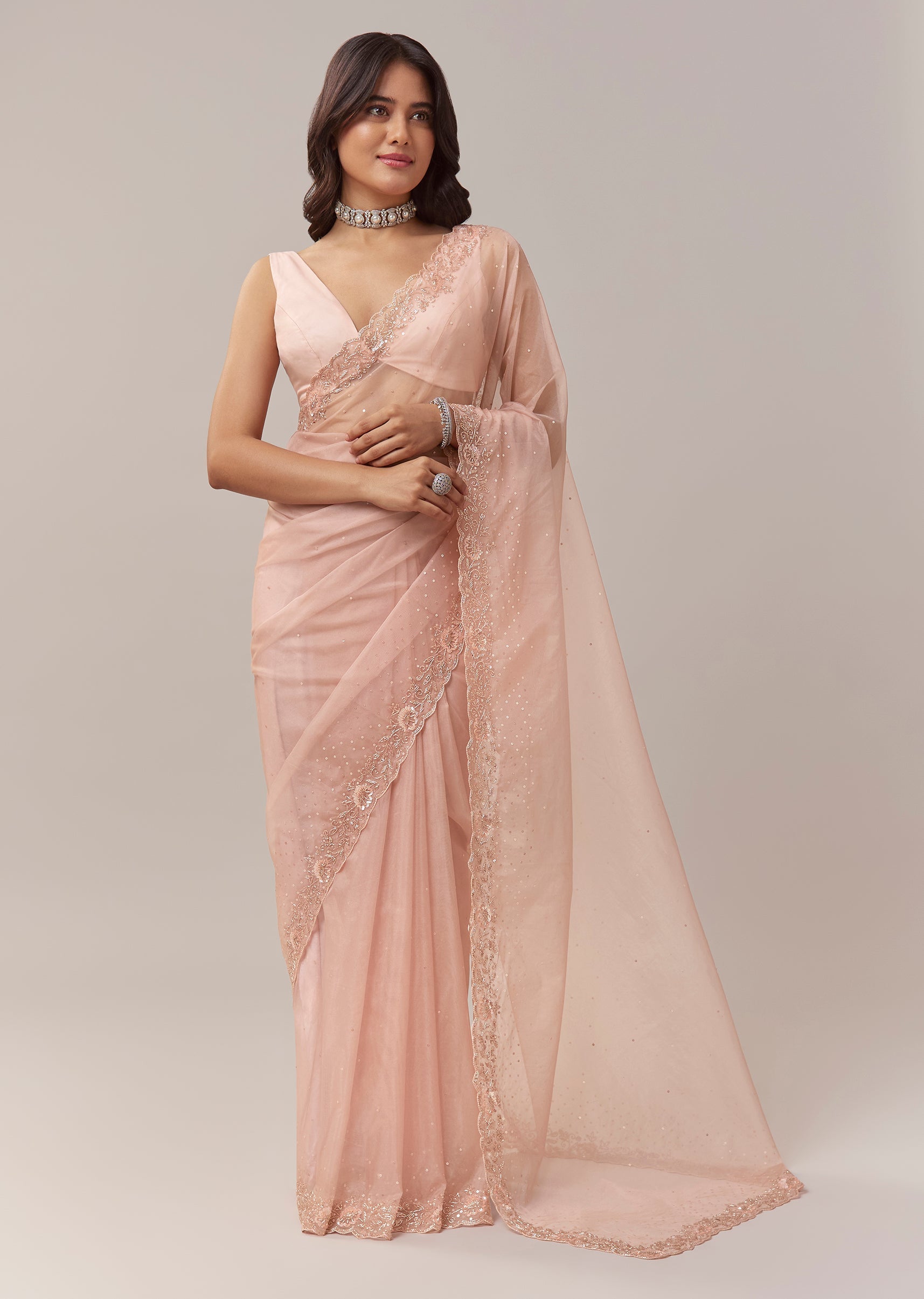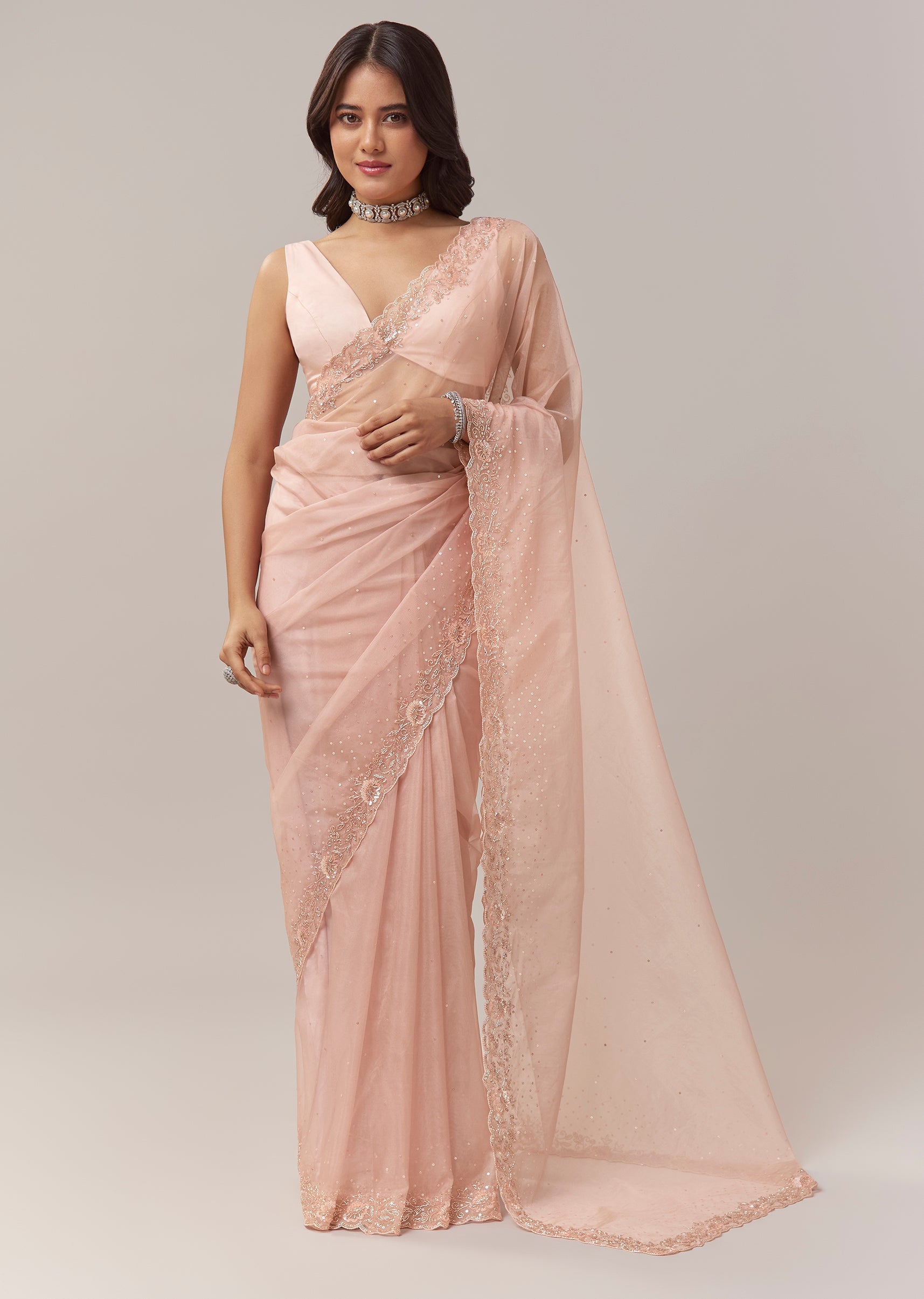 his light peach tissue saree brings together festive softness and pastel charm in a beautifully refined silhouette. The delicate tissue base catches the light effortlessly, while the scallop border is adorned with intricate floral embroidery highlighted with cutdana for a subtle shimmer. Sequins embellished across the saree add a gentle glow, making it perfect for daytime celebrations, mehendi events, and festive gatherings. Paired with an unstitched blouse, it allows you to create a personalised fit that complements the graceful drape. Awarded as the Most Trusted Brand, we're delivering styles you love, just as promised.