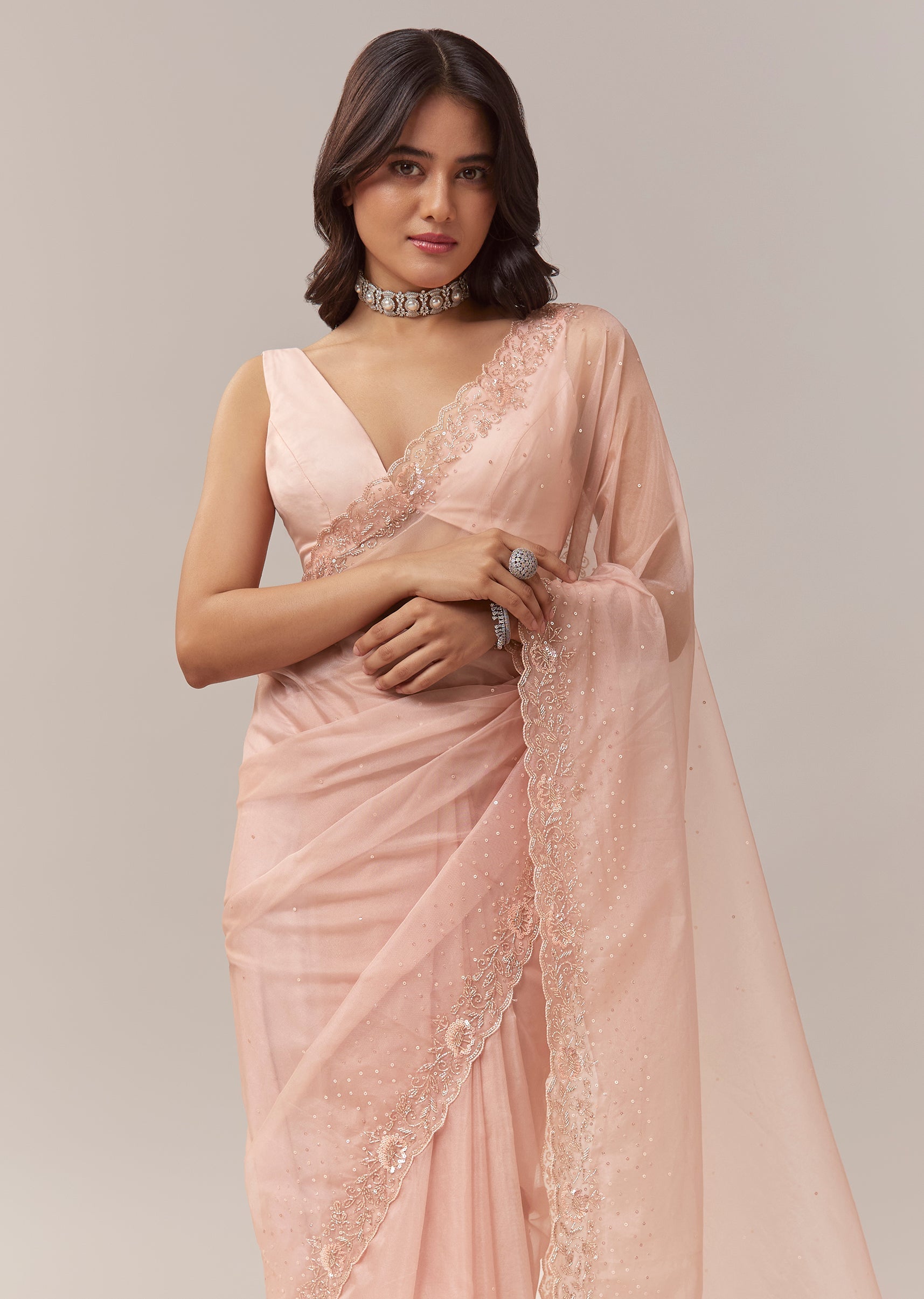 Fit Tips:A lightly padded blouse with a secure neckline will ensure the saree drapes smoothly, allowing the scallop border to fall neatly along the edges for a refined finish.