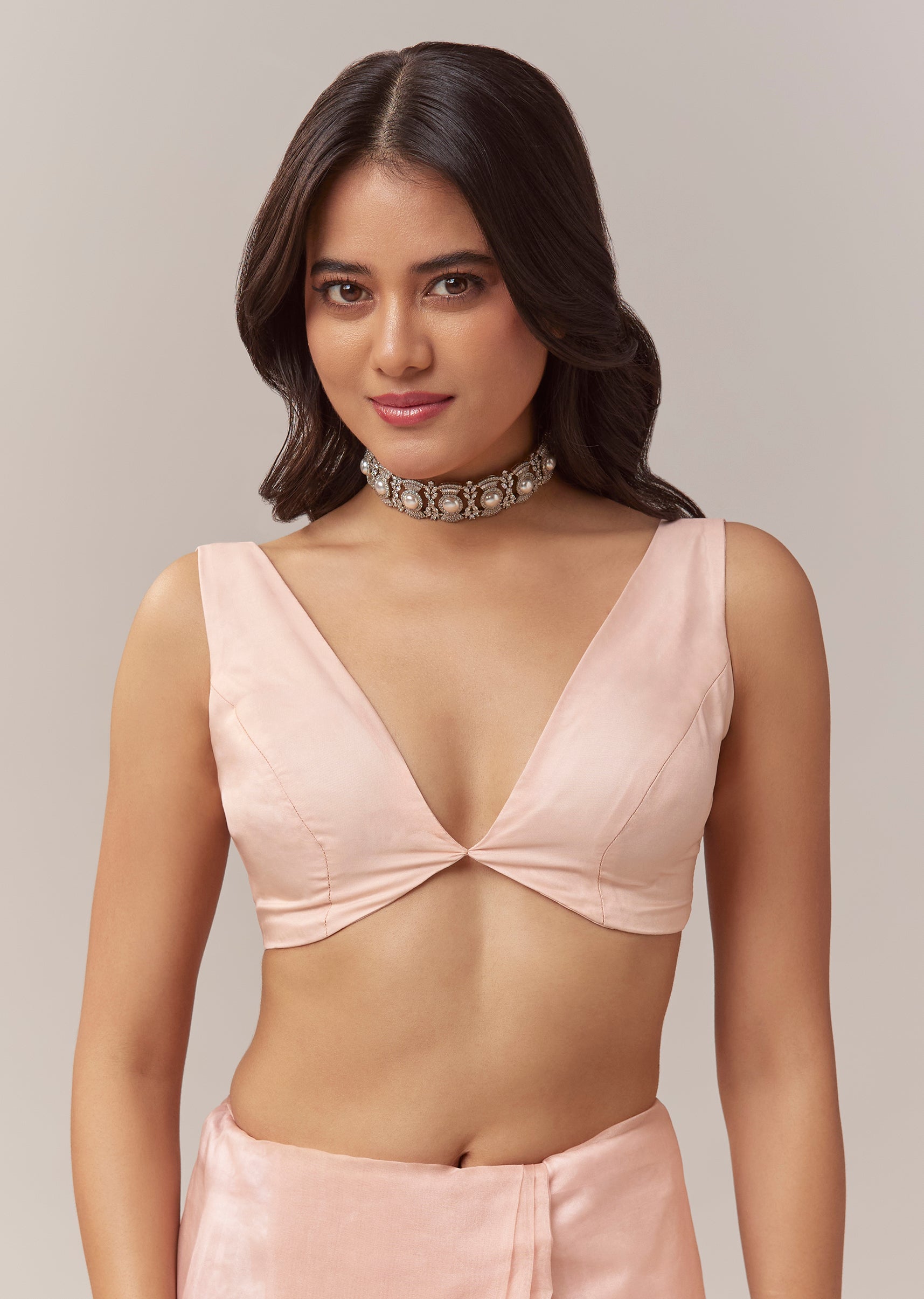 Choose crystal studs and nude toned heels to enhance the soft pastel elegance of the saree without overpowering its delicate shimmer.