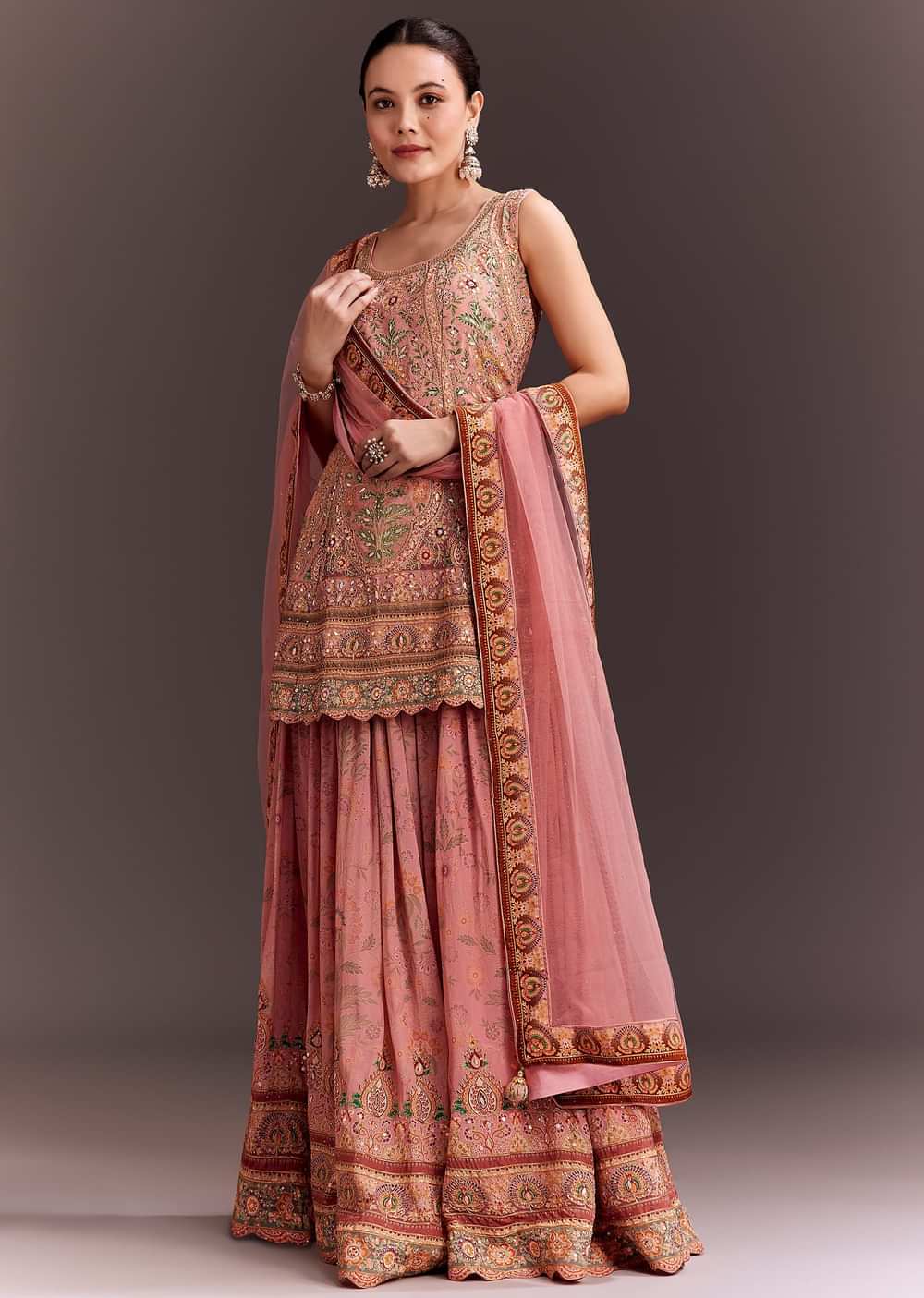 This light pink palazzo set showcases delicate embroidery, complemented by intricate stone work and subtle sequin detailing. The short kurta features a gracefully printed pattern, paired with a flared palazzo... More Product Details